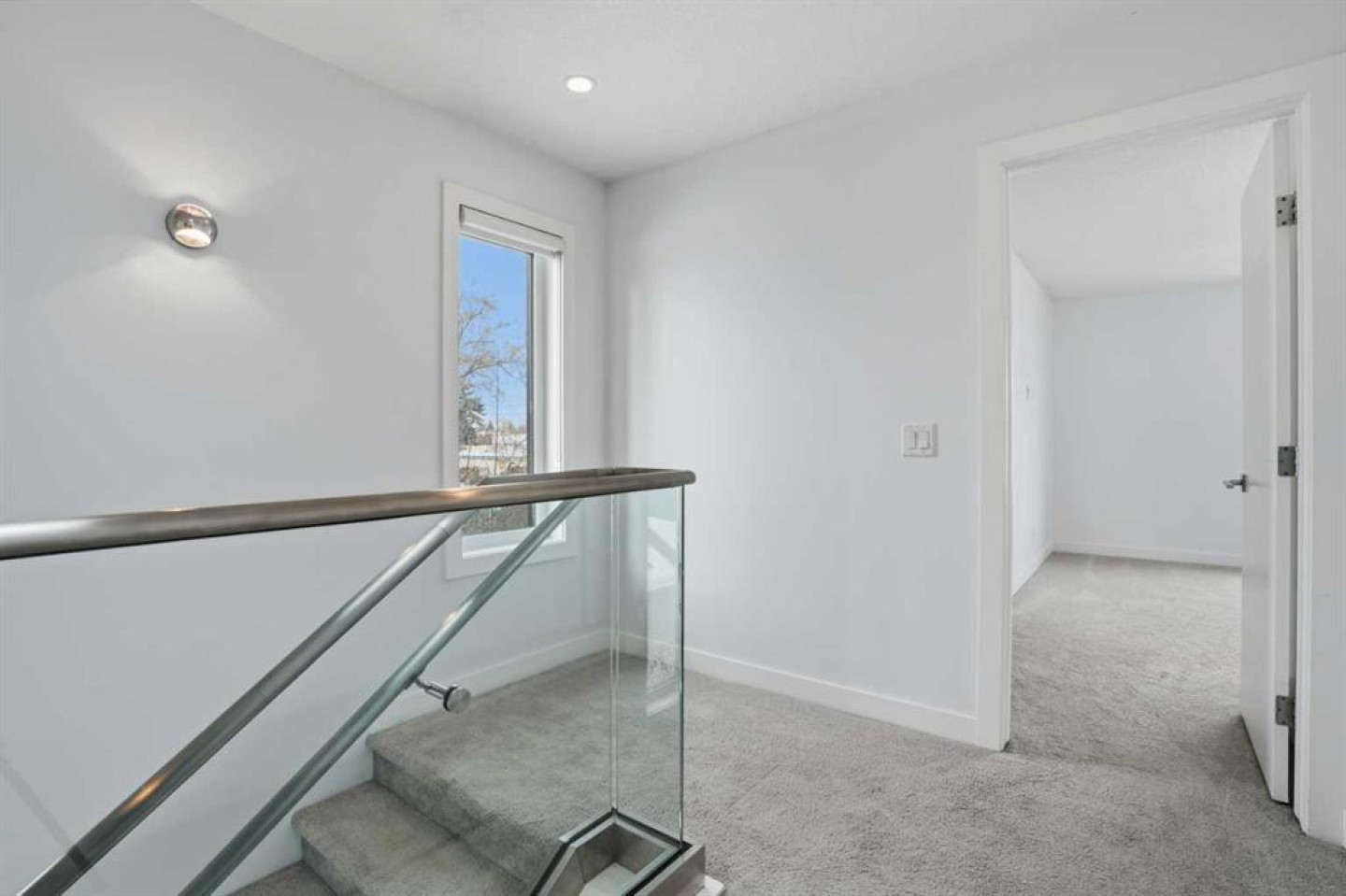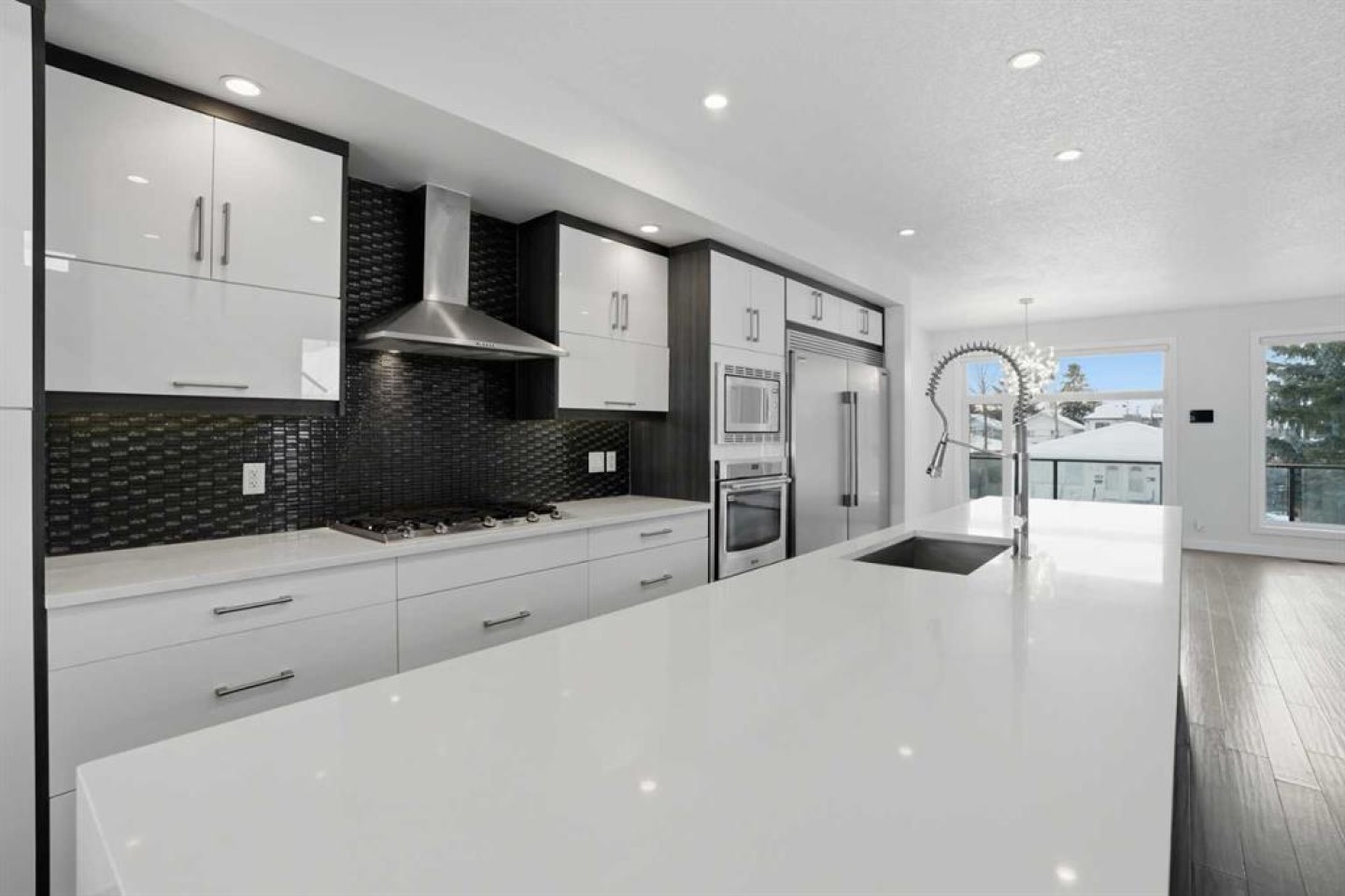 Step inside to a bright, open concept main floor flooded with natural light. The front dining area is perfect for hosting and opens to a sunny balcony, creating an effortless indoor outdoor flow. At the centre of the home, the gourmet kitchen impresses with stainless steel appliances, a gas cooktop, built in oven and microwave, two tone cabinetry, and a large quartz island that invites casual meals and lively gatherings. Sleek glass railings and clean modern finishes elevate the space throughout.