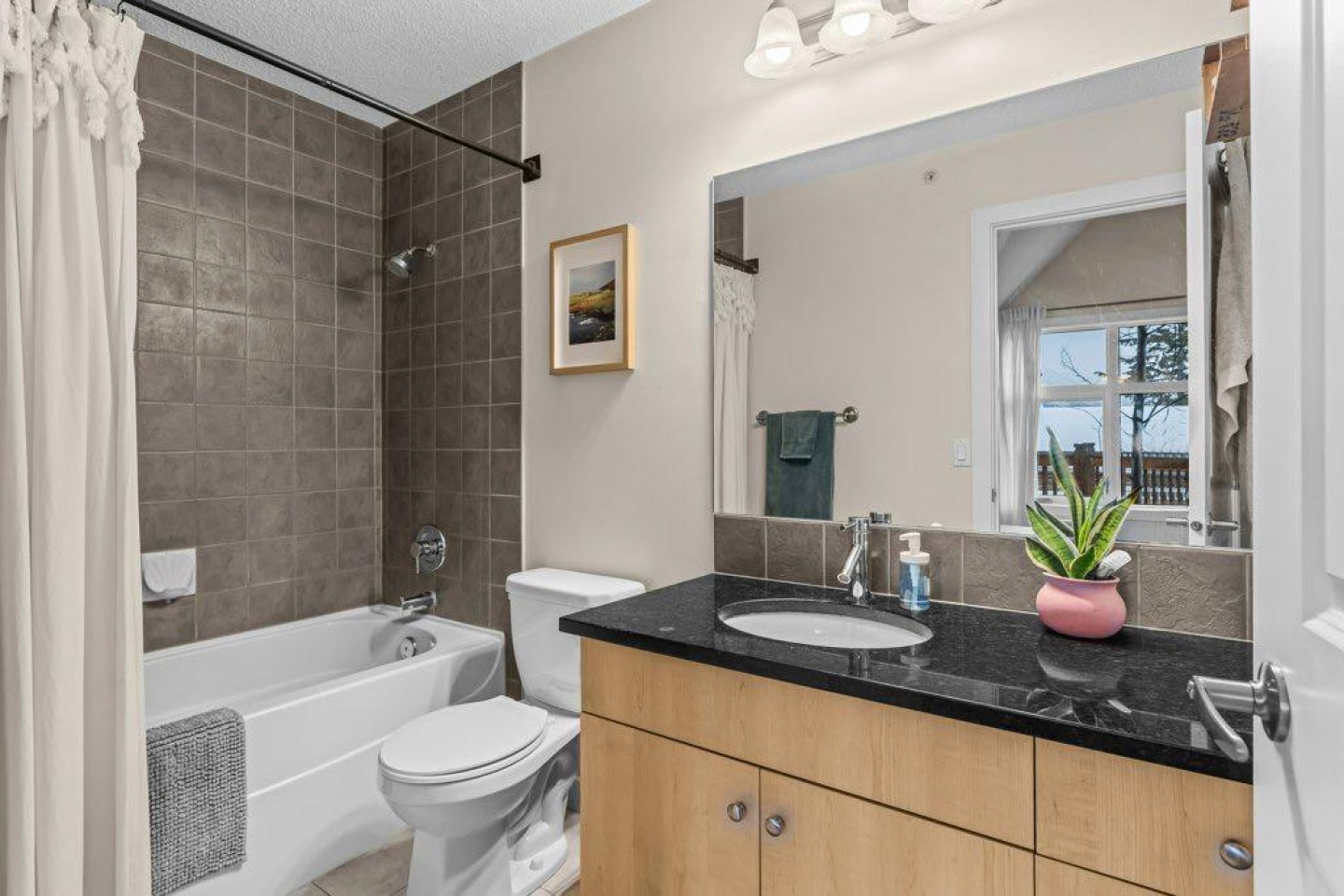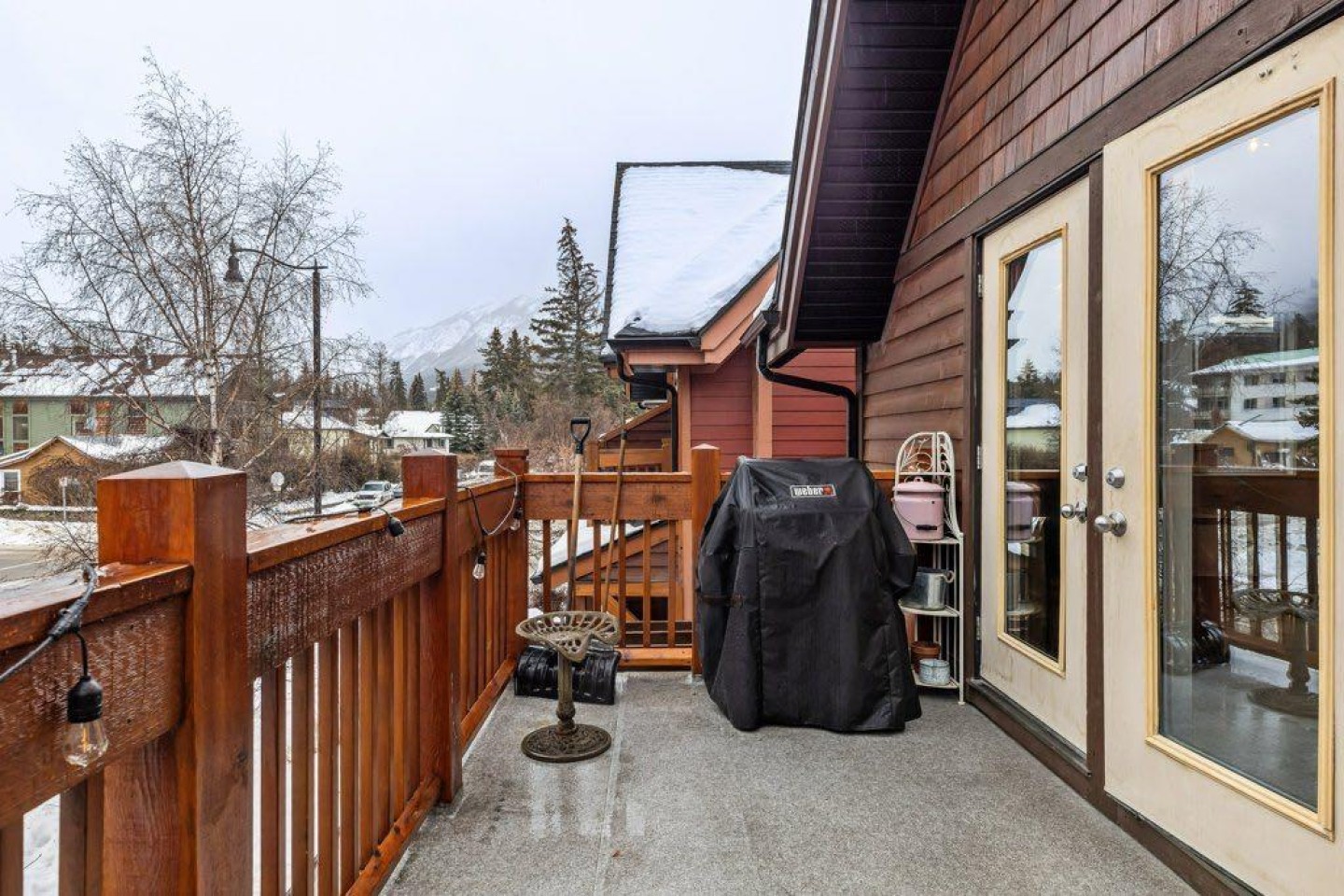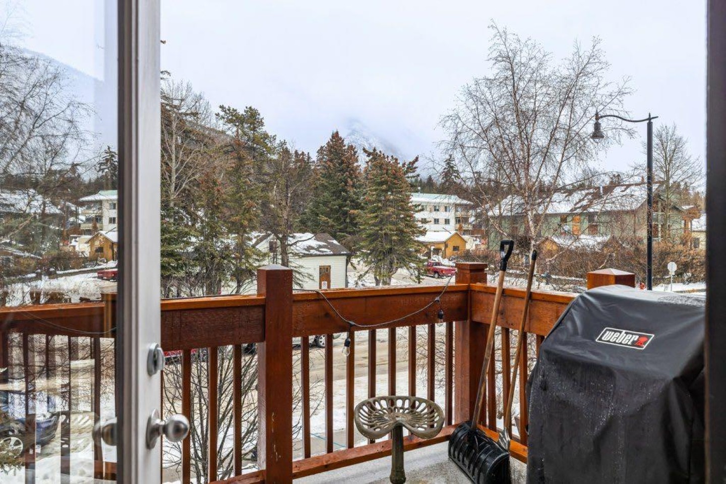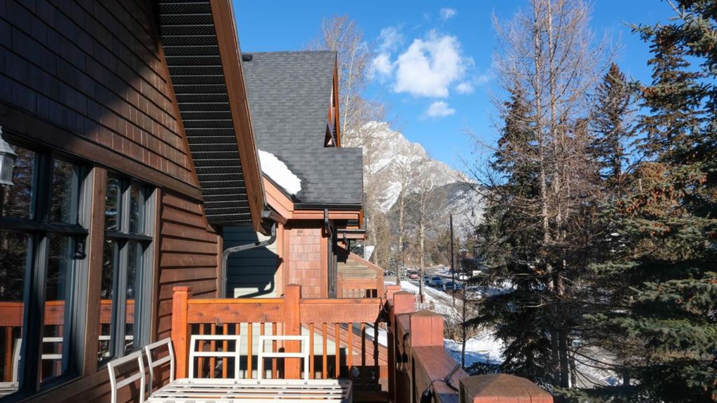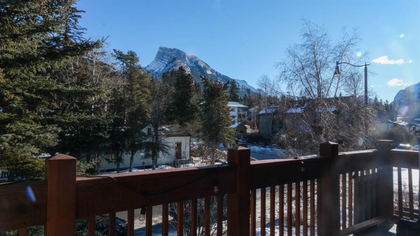 The primary bedroom includes an ensuite bath, with two additional bedrooms that work well for family, guests, or a home office. A large private deck looks out toward Mount Rundle and provides a quiet outdoor extension of the living space.