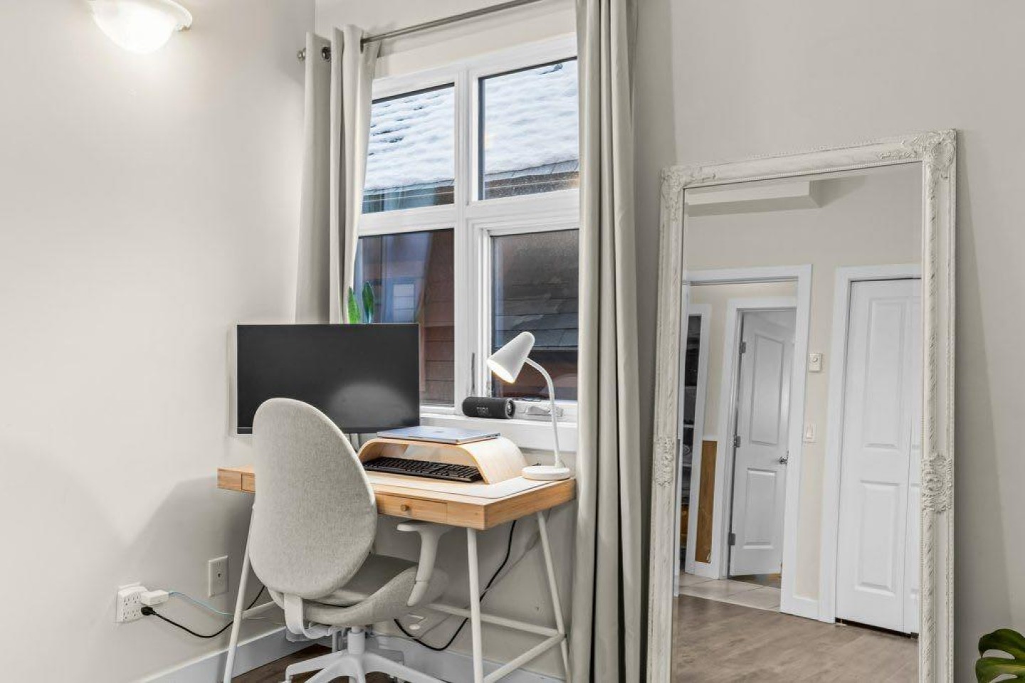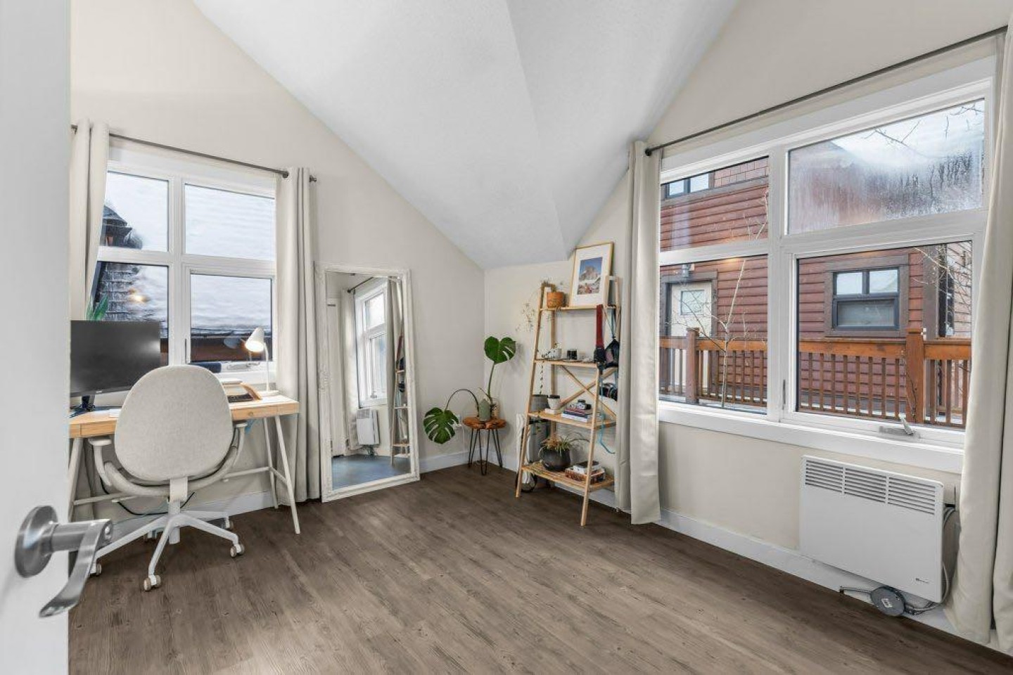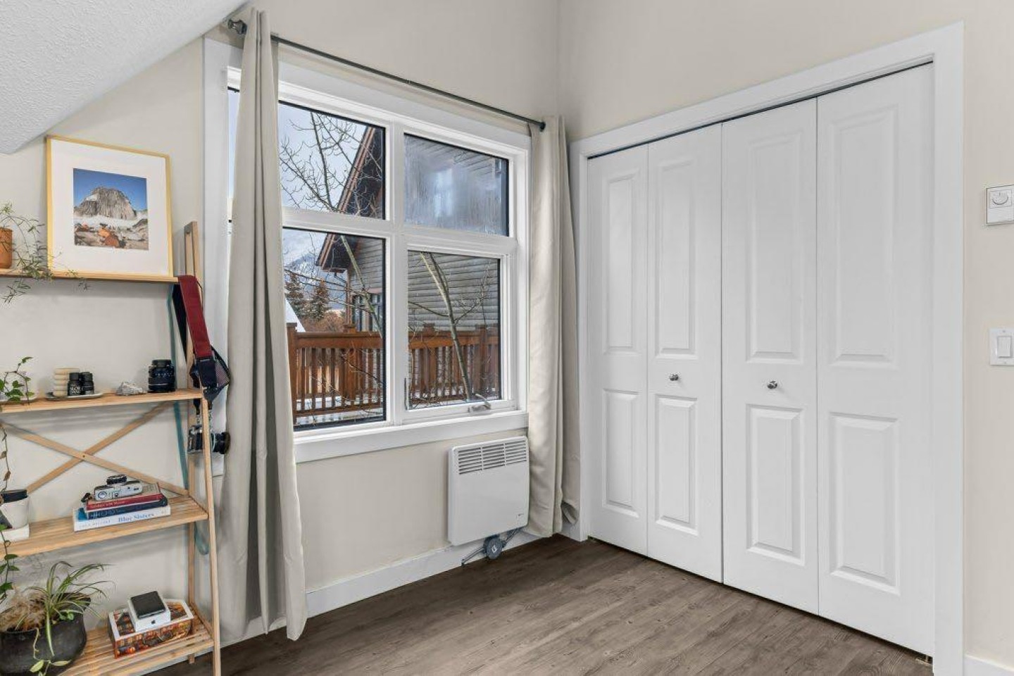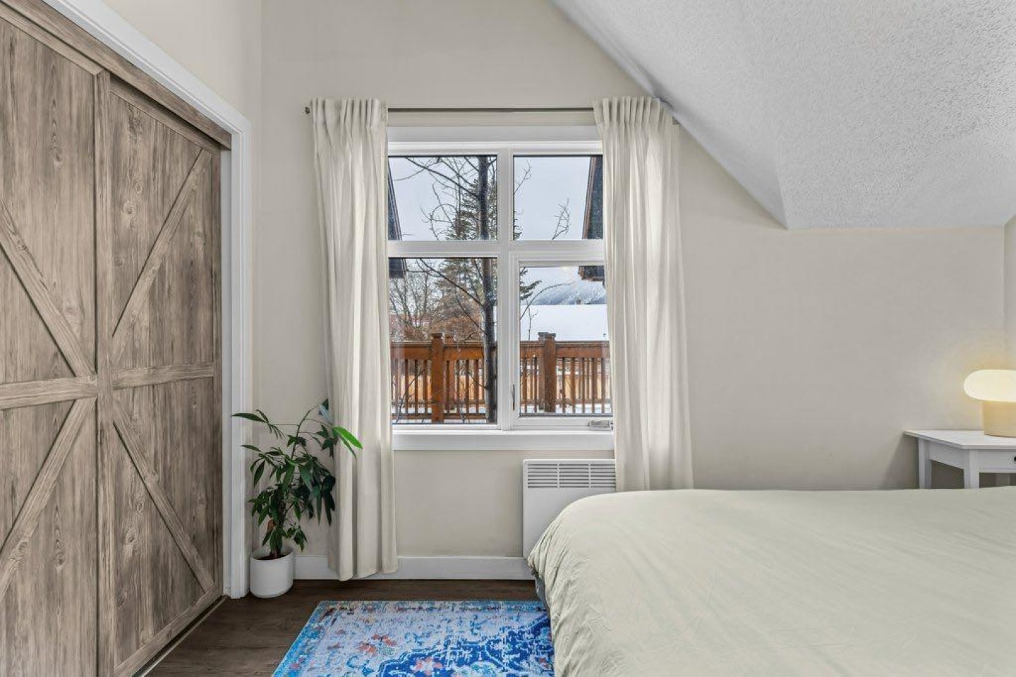 The primary bedroom includes an ensuite bath, with two additional bedrooms that work well for family, guests, or a home office. A large private deck looks out toward Mount Rundle and provides a quiet outdoor extension of the living space.