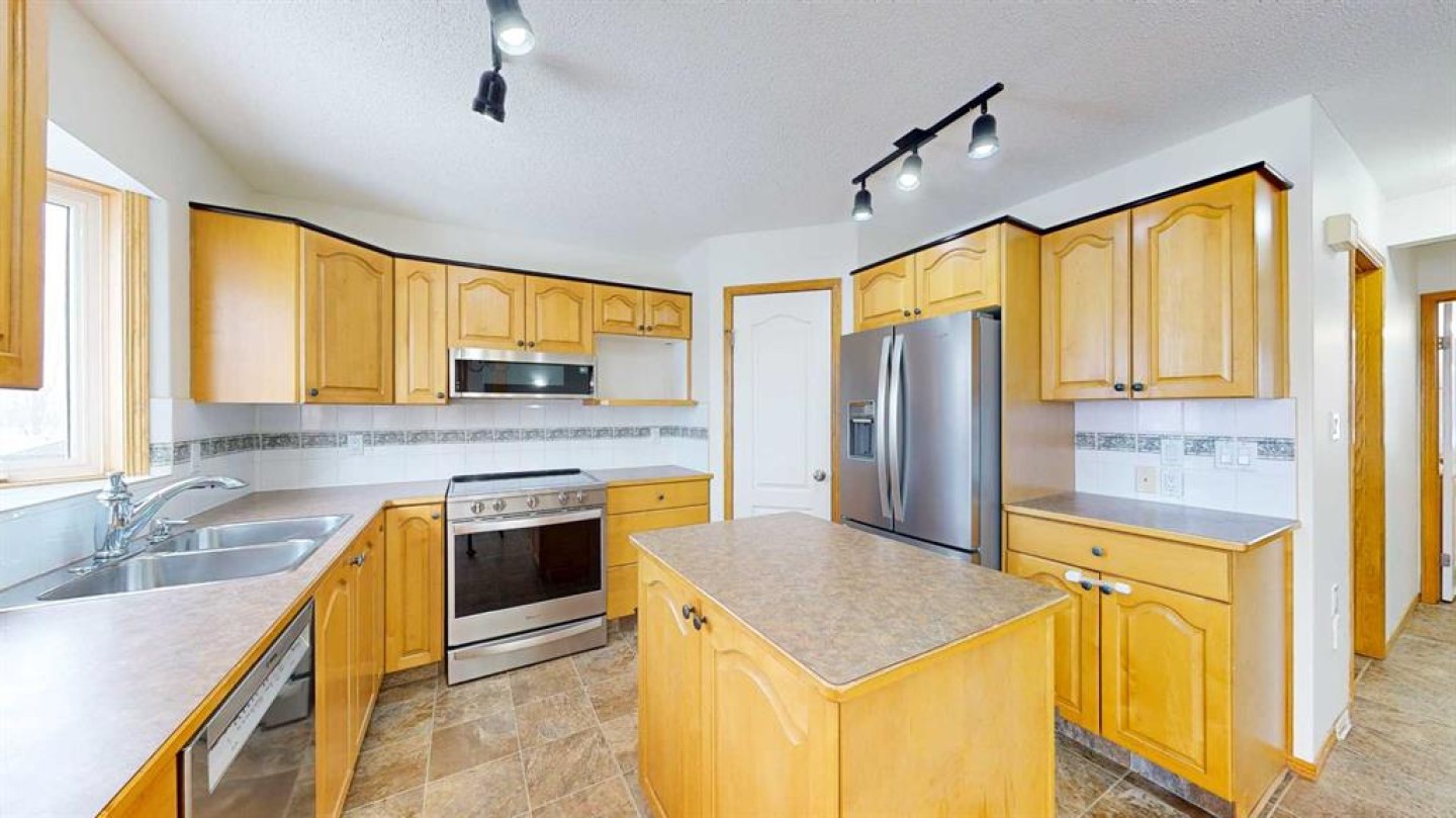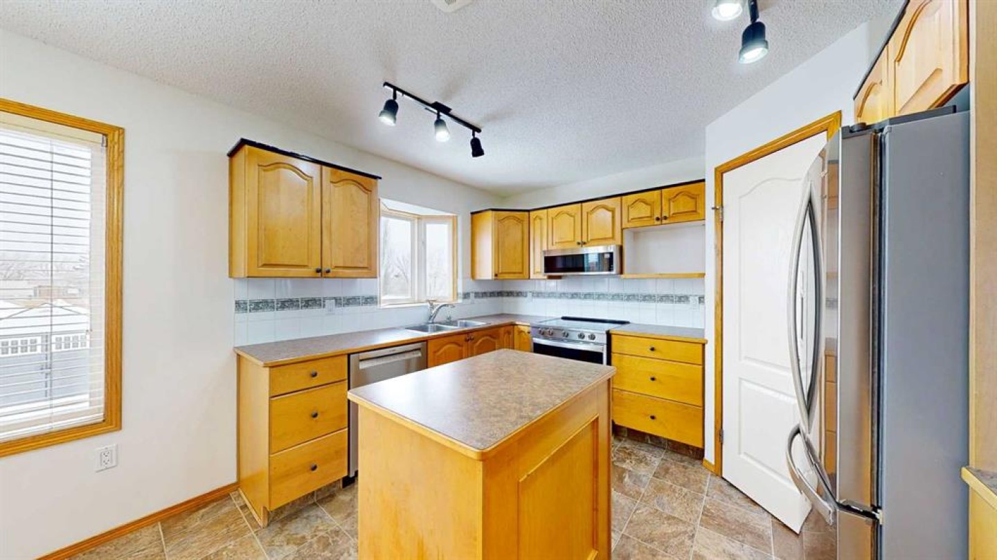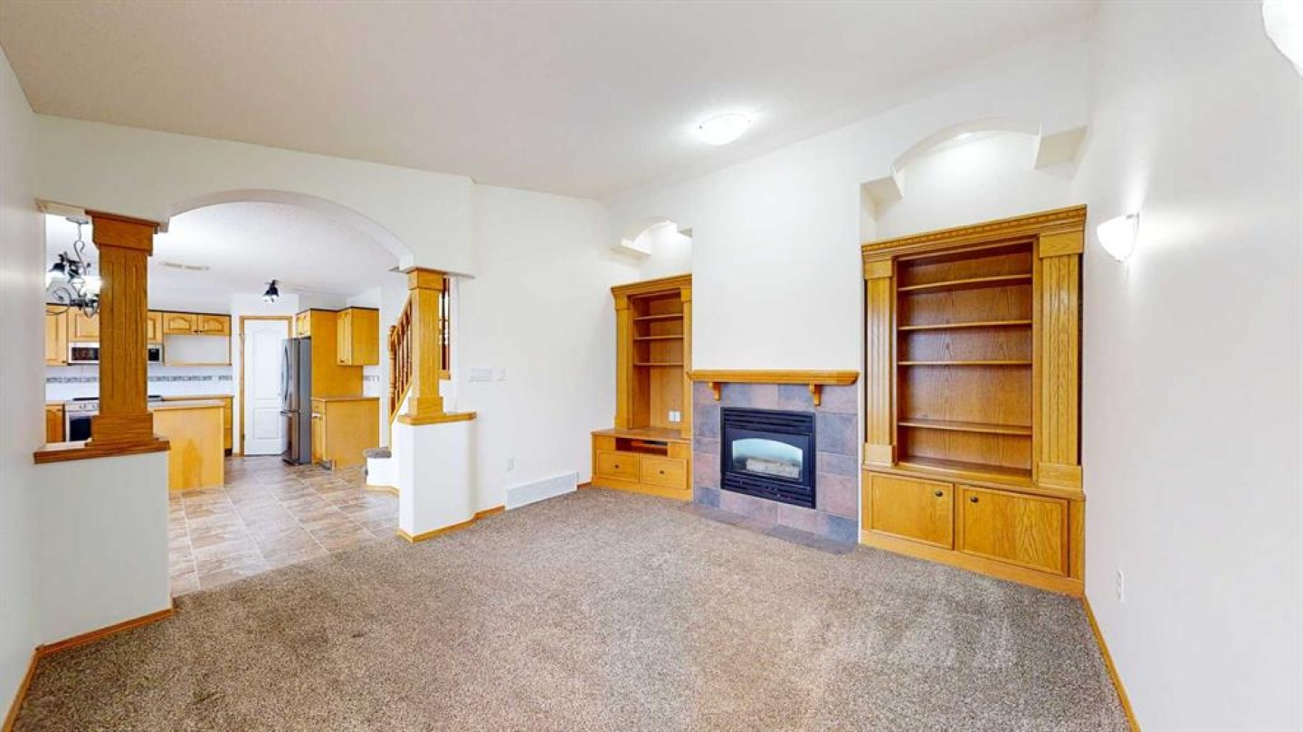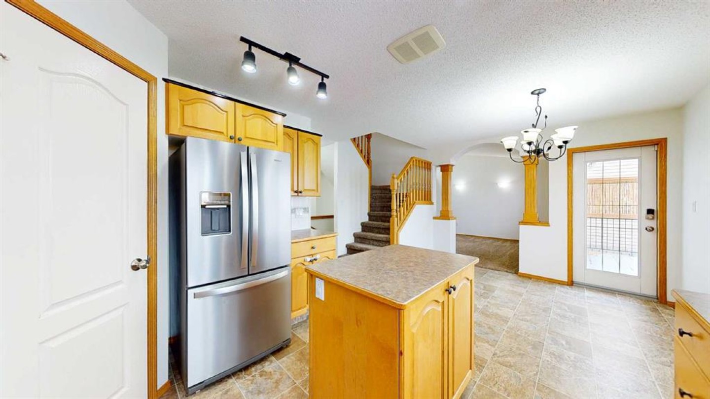 Upon entry, you are welcomed by a generous foyer and a bright office/flex room to the left, highlighted by glass-front double doors. The main floor continues with a convenient 2-piece bathroom and main-floor laundry located just off the double attached garage. Completing the main level is a well-appointed kitchen with island, dining area, and full appliance package, flowing seamlessly into the open-concept living room with a cozy gas fireplace. Upstairs, the primary bedroom offers a private retreat with a walk-in closet and ensuite. Two additional bedrooms and a full 4-piece bathroom complete the upper level.
