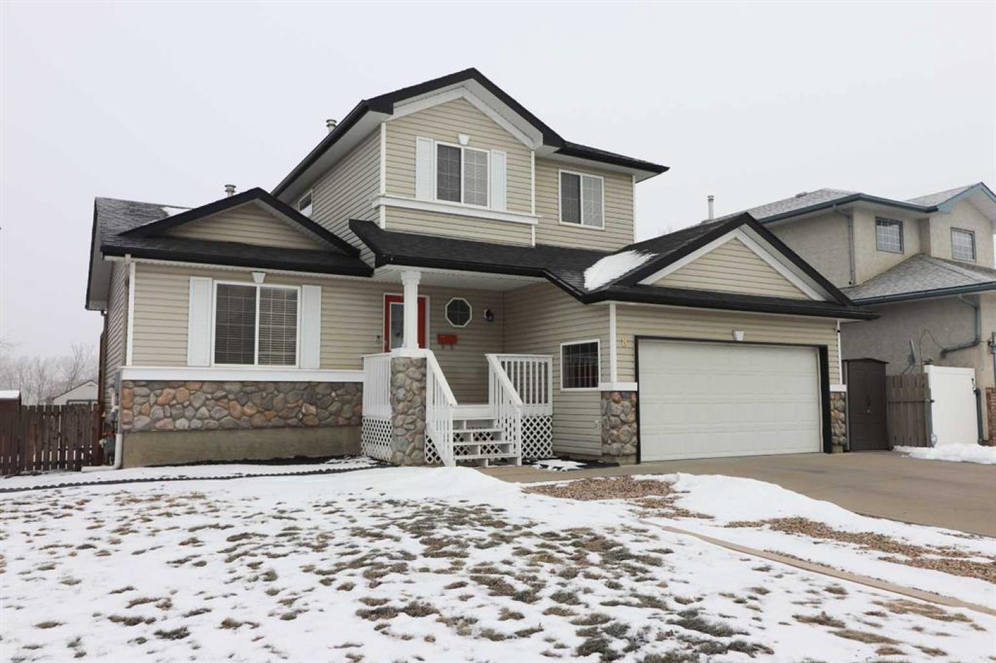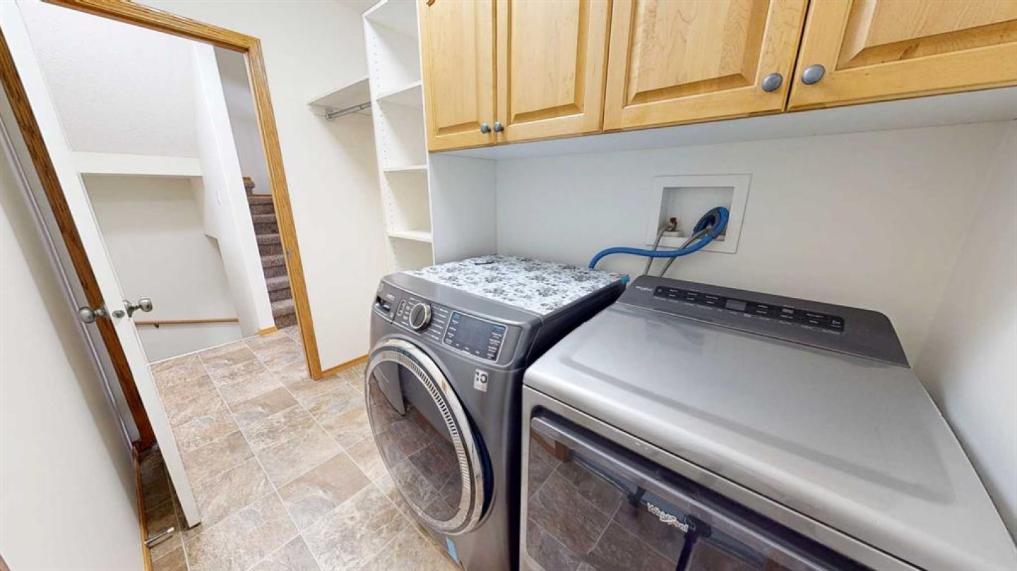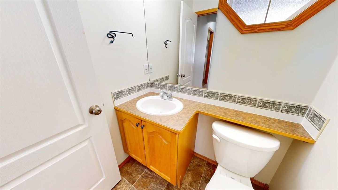Upon entry, you are welcomed by a generous foyer and a bright office/flex room to the left, highlighted by glass-front double doors. The main floor continues with a convenient 2-piece bathroom and main-floor laundry located just off the double attached garage. Completing the main level is a well-appointed kitchen with island, dining area, and full appliance package, flowing seamlessly into the open-concept living room with a cozy gas fireplace. Upstairs, the primary bedroom offers a private retreat with a walk-in closet and ensuite. Two additional bedrooms and a full 4-piece bathroom complete the upper level.