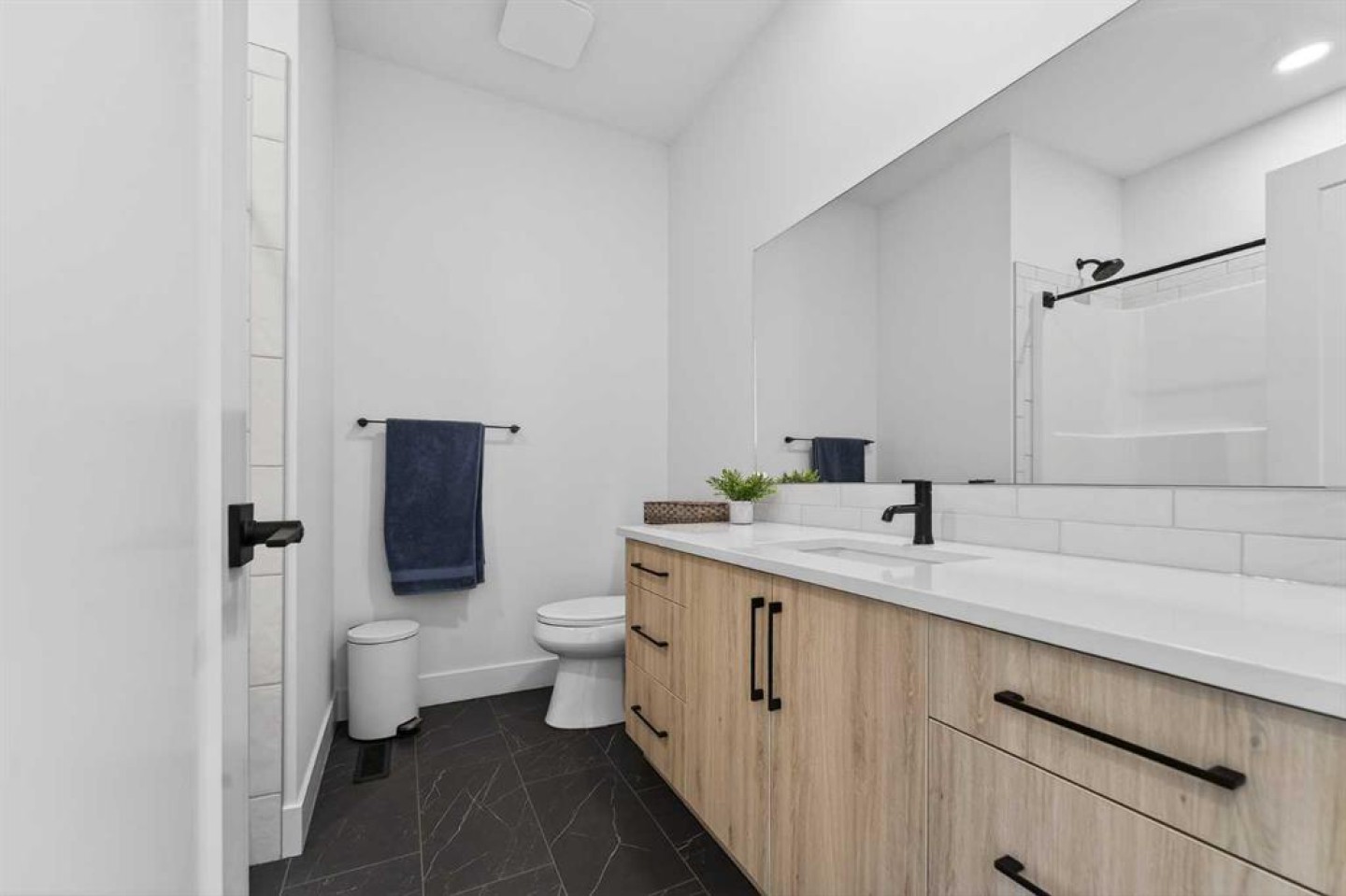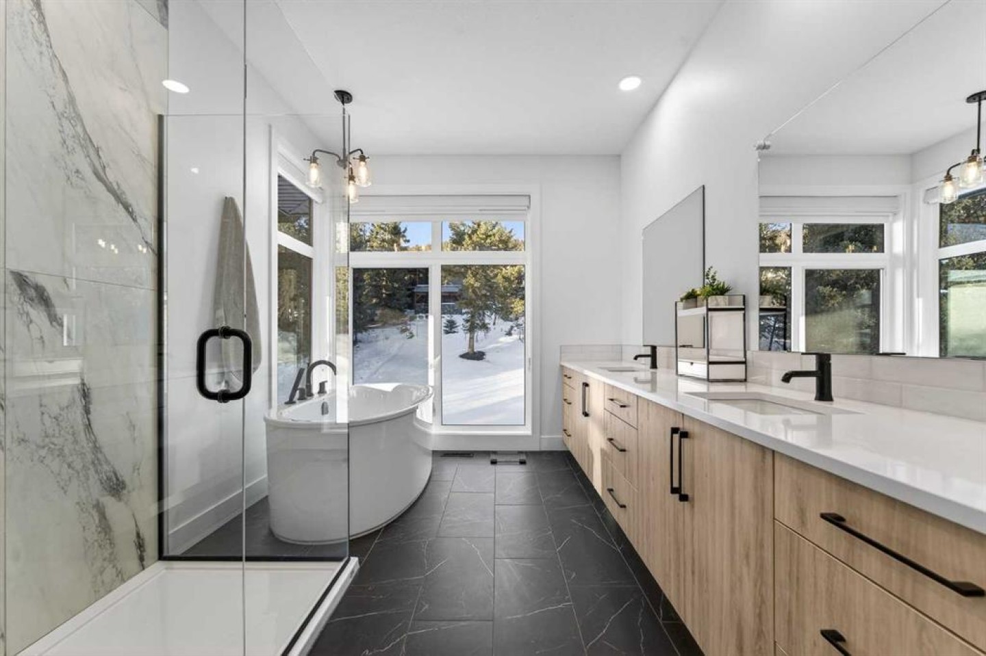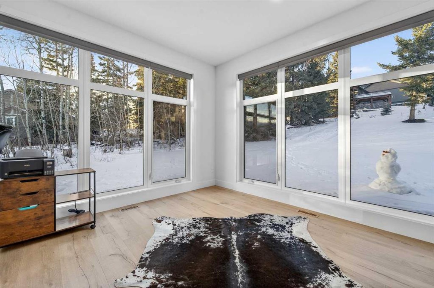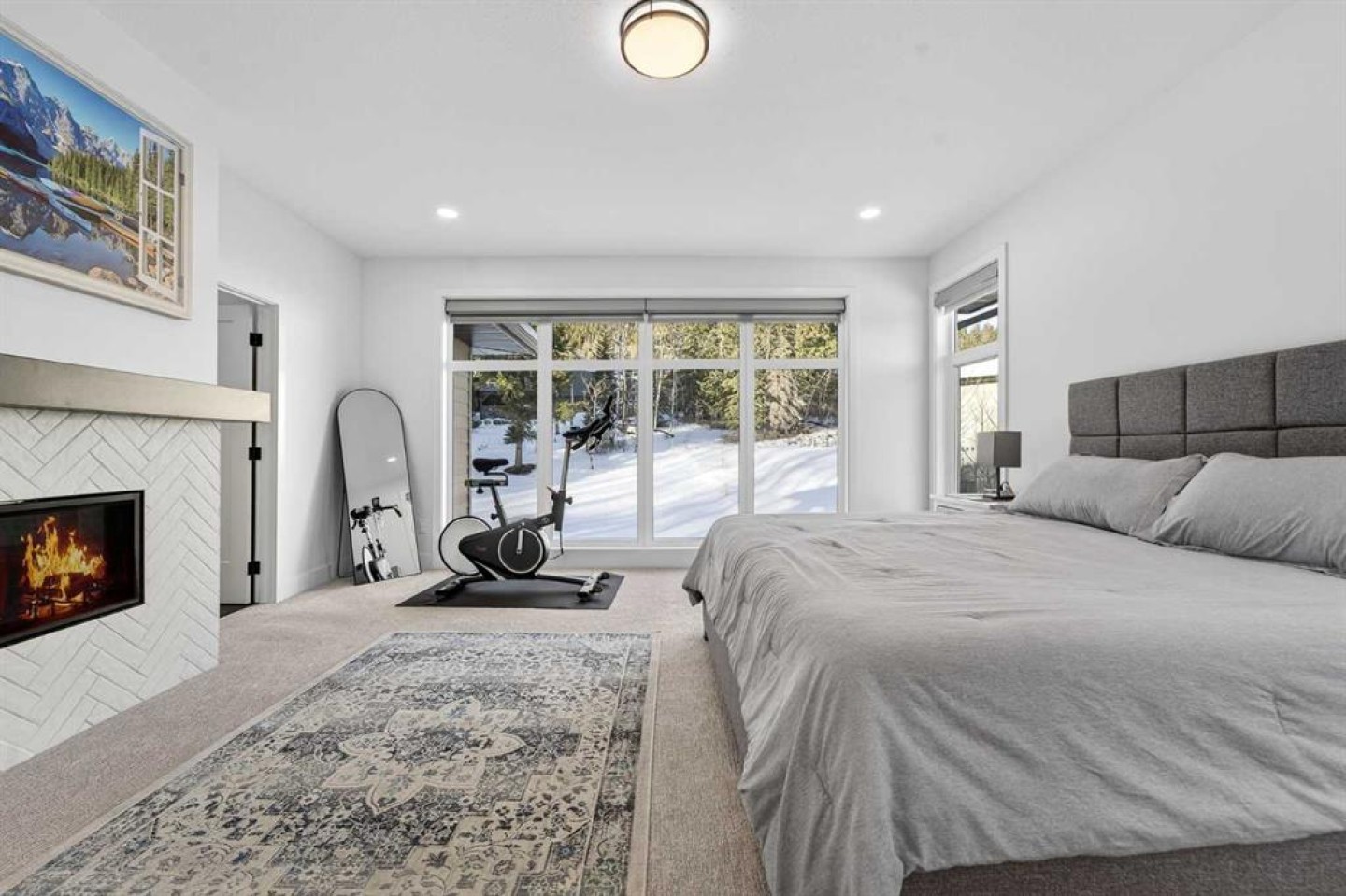 A sun-filled executive office on the main floor is surrounded by windows, making working from home feel anything but routine. Upstairs, the primary suite is a true retreat, featuring its own tiled fireplace, wet bar with wine fridge, and expansive windows that frame the mountain views beautifully. The walk-in closet includes a dedicated vanity area and connects discreetly to the upper laundry room, keeping daily life streamlined. The ensuite rivals a private spa, with dual vanities, a glass-enclosed tiled shower, and a soaker tub set among windows that invite in natural light and scenery.