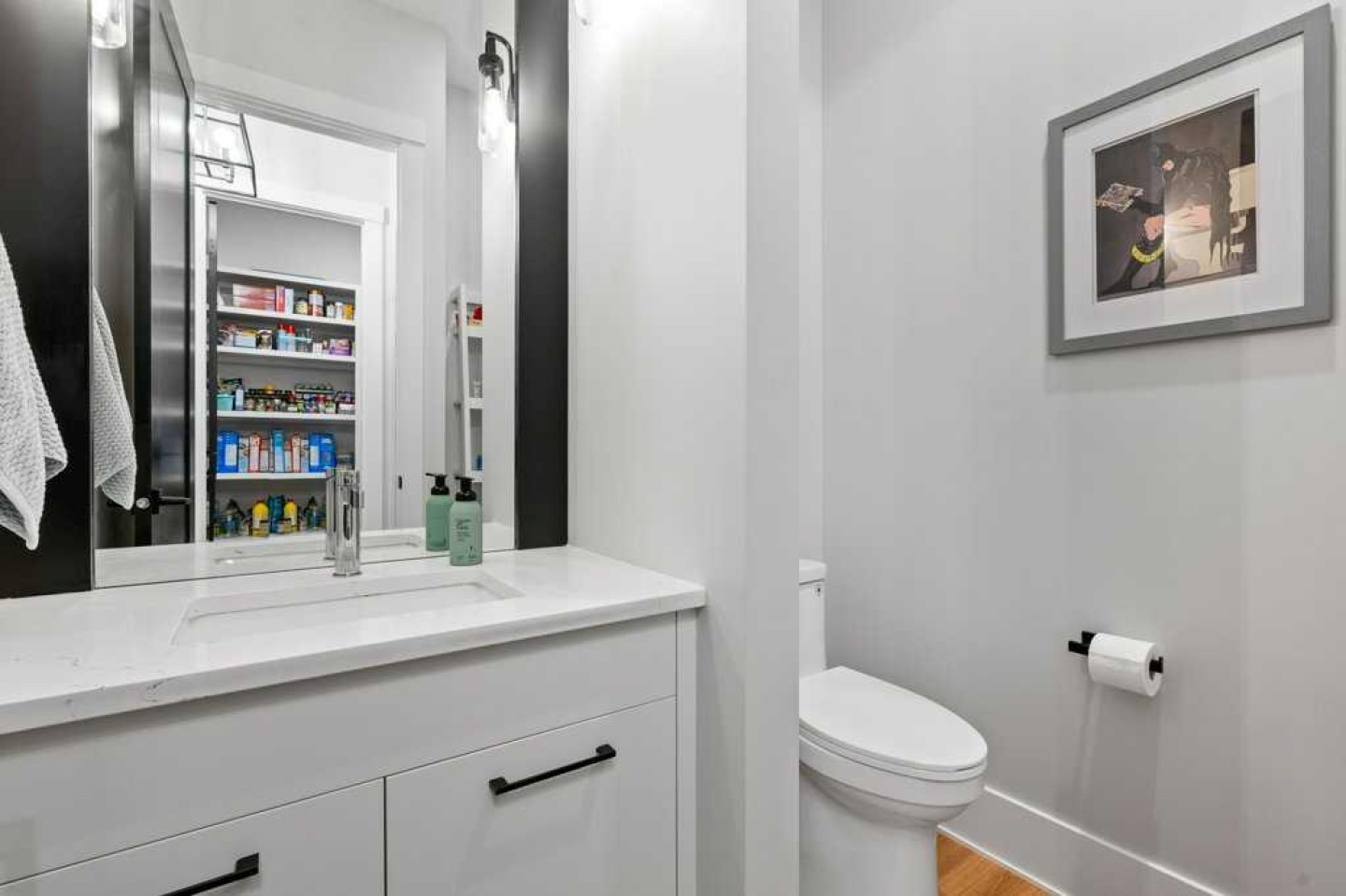 The thoughtfully designed kitchen is both stylish and practical featuring extended-height white cabinetry, soft-close mechanics, a massive quartz island, built-in oven and microwave, gas cooktop, French-door refrigerator, walk-in pantry with custom built-ins and an under counter built-in fridge/freezer with pullouts and a built-in desk area. The adjacent wall of windows is overlooking the backyard, with a conveniently located 2-piece powder room and walk in pantry with beverage center completes the main level.