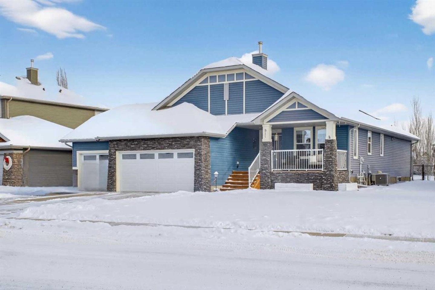 Welcome to Boulder Creek Estates in Langdon, where small-town charm meets refined bungalow living. This immaculate, fully finished 4 bedroom, 3 bath, 1800 sq ft bungalow offers over 3,000 sq ft of beautifully designed living space with vaulted ceilings, a triple car garage, and central air conditioning. A formal dining room and large den offer versatility for entertaining, working from home, or quiet relaxation. The chef-inspired kitchen features granite countertops, stainless steel appliances, a gas stove, skylight, and ample cabinetry, flowing into a warm living room with a gas fireplace. The spacious primary suite includes a stylish barn door and a luxurious 5 pc ensuite. The fully developed lower level adds a large recreation room with a second gas fireplace, two additional bedrooms, generous storage, and the convenience of two laundry rooms. Situated on a private reverse pie lot backing onto green space, the landscaped backyard with underground sprinklers creates a peaceful outdoor retreat. Boulder Creek Estates is a vibrant community with nearby amenities including Boulder Creek Golf Course, the Langdon Fieldhouse, skatepark, playgrounds, schools, and local shops and restaurants, scenic walking paths, and convenient access to major commuting routes.Thoughtfully upgraded and meticulously maintained, this exceptional home offers space, comfort, and elegance just minutes from Calgary.