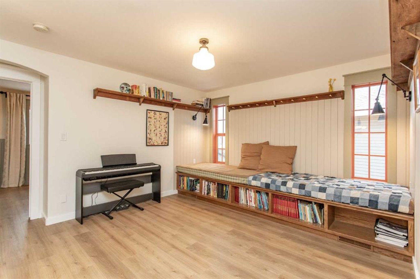 The separate basement entrance provides flexibility for guests, teens, or future suite potential. The basement includes a large living area with high ceilings, a separate craft room or office space, and cold storage. This floor is complete with well-considered features of a water fountain in the gym (6th bedroom) and a basement bathroom with urinal.