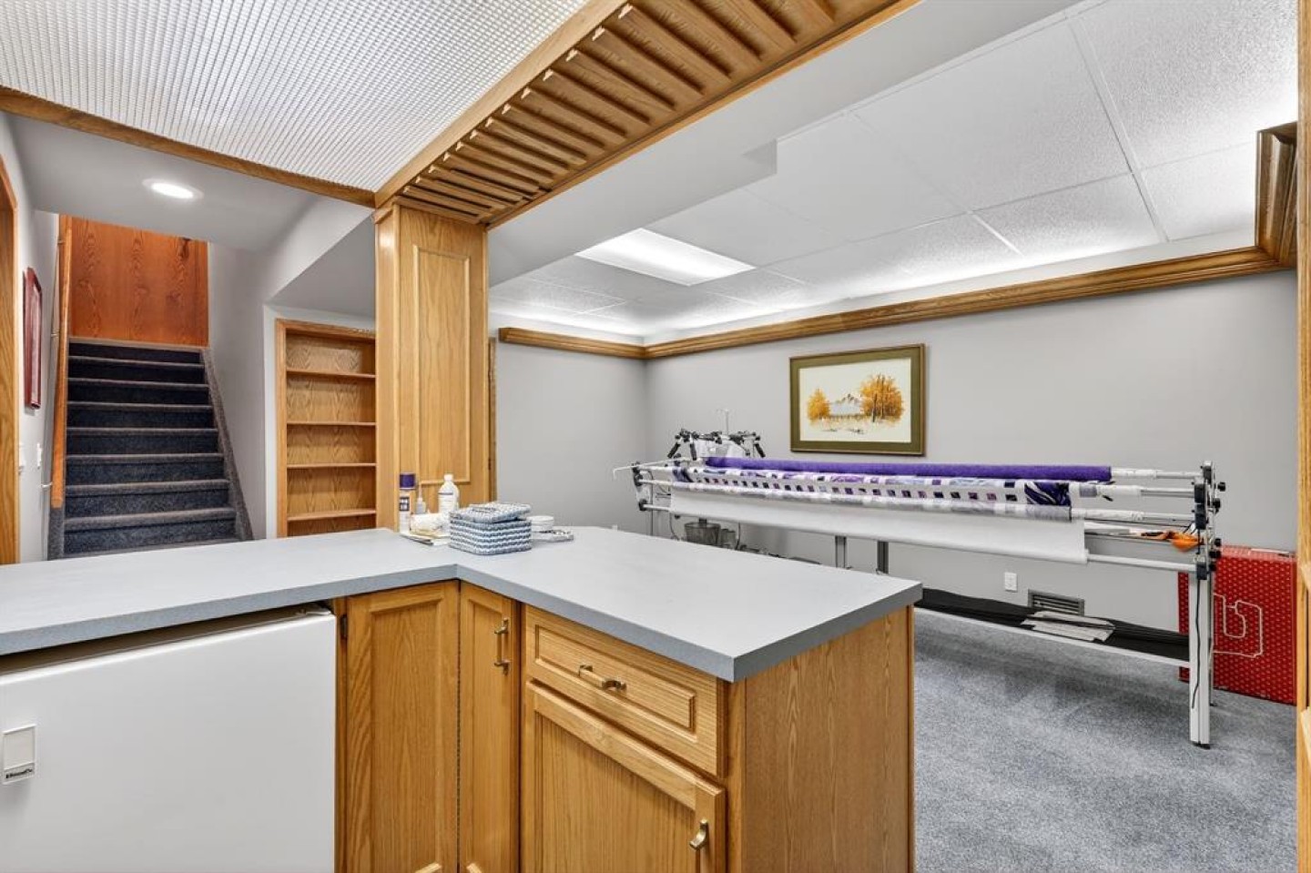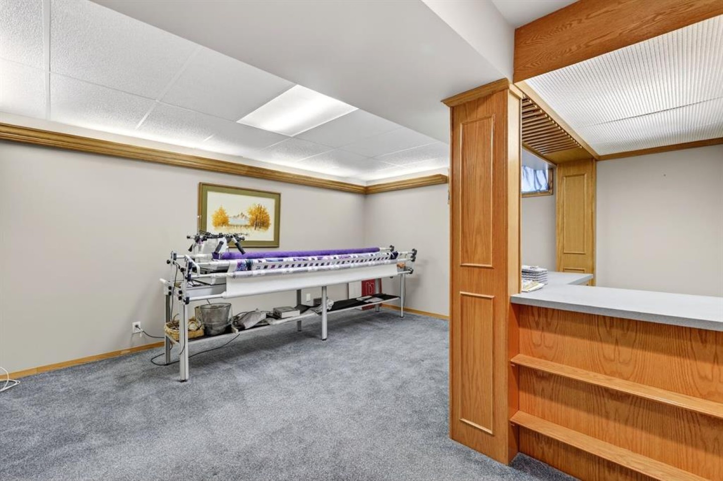 Storage shelving in garage and workshop. Most furniture shown can be included. Contact listing agent for details.