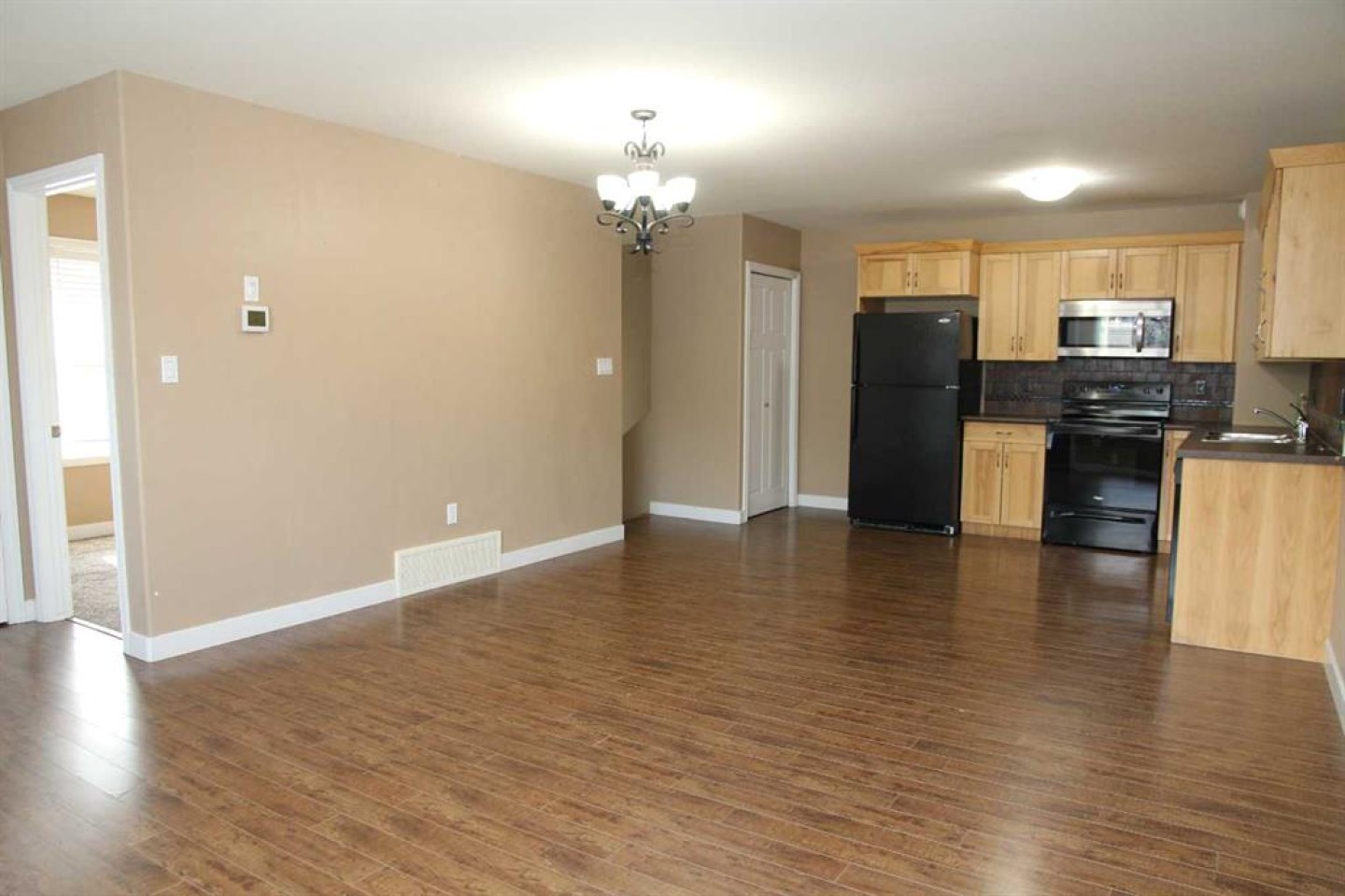 The main floor features an open-concept kitchen, dining, and living area, along with a bedroom or home office and a convenient 2-piece bathroom. The lower level includes two additional bedrooms, a 4-piece bathroom, dedicated laundry space, and extra storage.