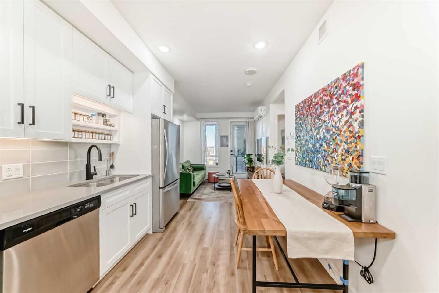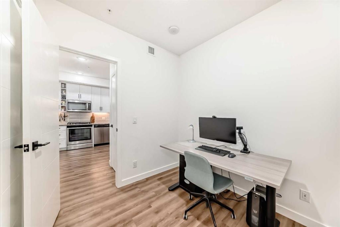 Welcome to this gorgeous 1 bed/1 bath + den unit in the heart of the University District! The unit features an open concept living space w/9' ceilings, luxury vinyl plank throughout the living space and loads of light through the large windows. The kitchen/dining features gorgeous white cabinetry, quartz counters, gas range, stainless appliances and enough space for a farm style table. The living area is great for entertaining, with mini split AC for the summer and walks out to a good sized balcony with extra storage & gas line for your BBQ., perfect for al fresco dinners The good sized primary bedroom has room for a king sized bed and amazing closet fitted with California Closet built ins. The den/office is great for those who work or study from home & also feature closet built ins. The bright 4 piece bath & in unit laundry complete the property. As well, there is one titled parking spot and an assigned storage unit, underground visitor parking, bike storage & car wash. The August in University District features a warm contemporary lobby and large common room w/kitchen, perfect for celebrating with family & friends. The building is ideally located next to the Alt Hotel by Le Germaine & Charcut restaurant, one block from the Children's Hospital, just blocks from U of C, and a quick walk to Save On, Cineplex cinemas, fitness centres, and many more restaurants & services. As well, it's close to the Bow River, Bowness Park, the Calgary Farmers Market and Winsport., and an easy jaunt out to the mountains. Book your showing today!