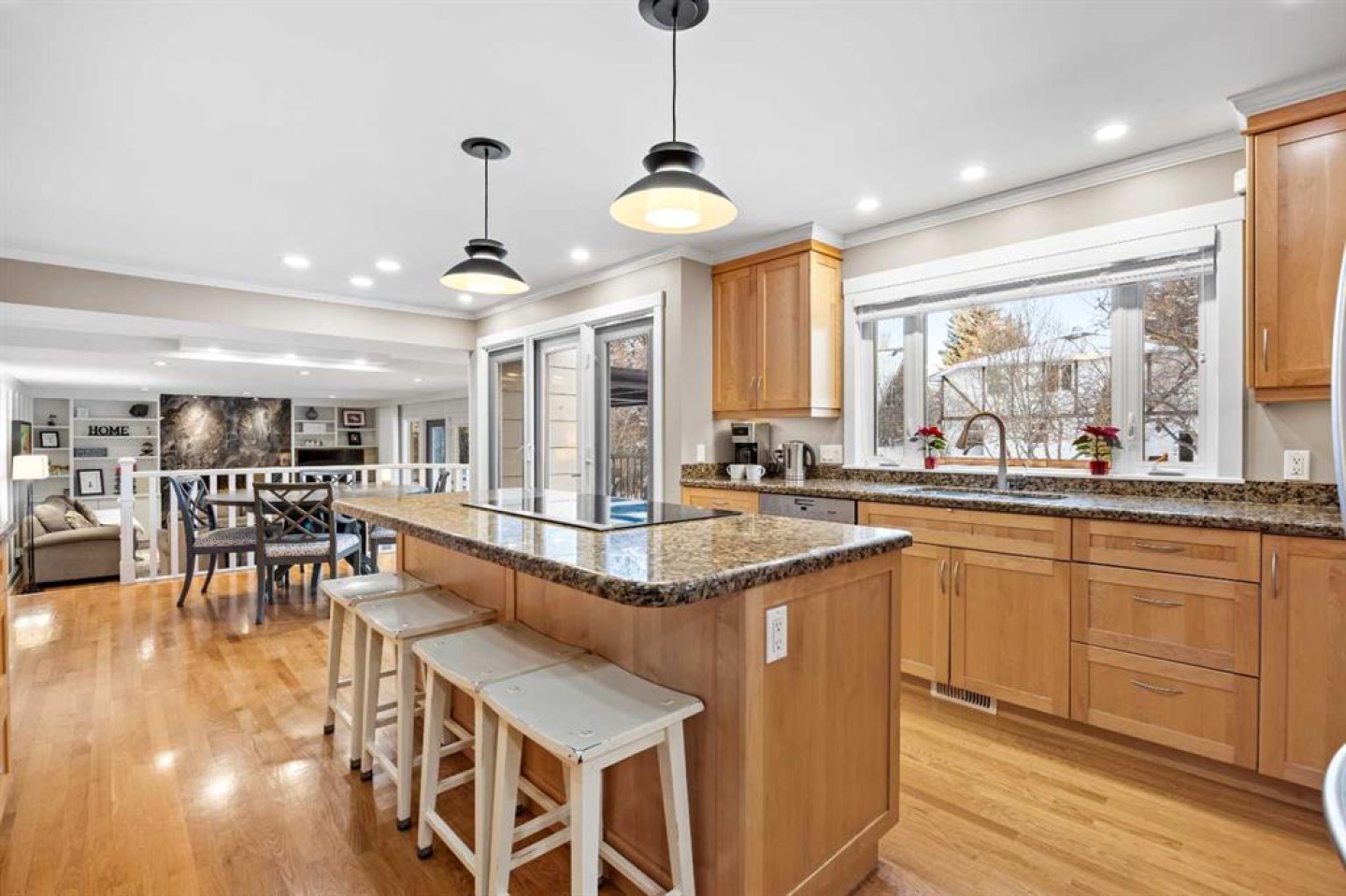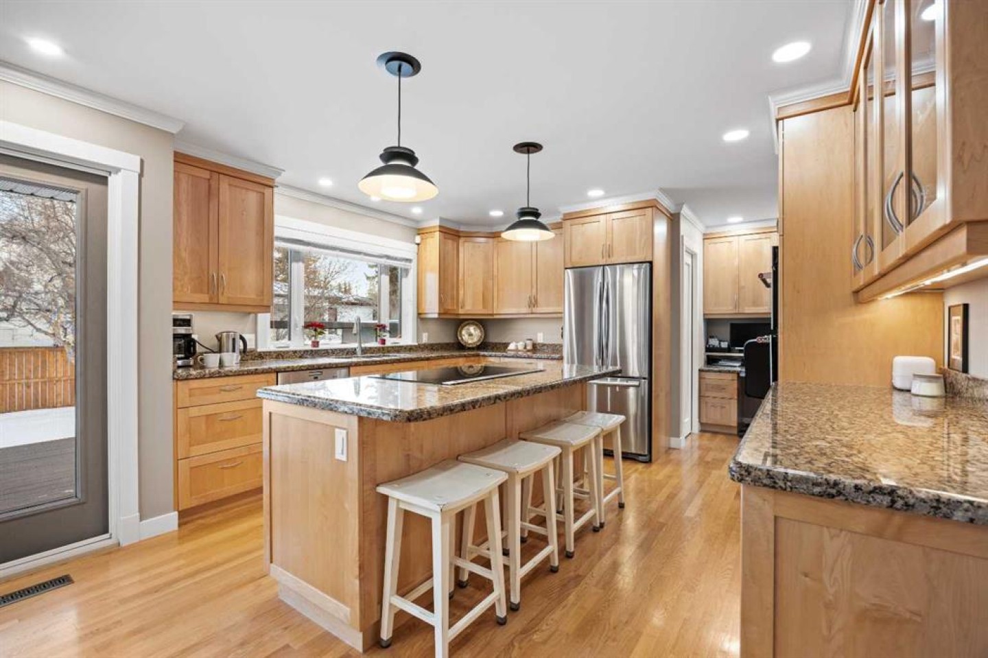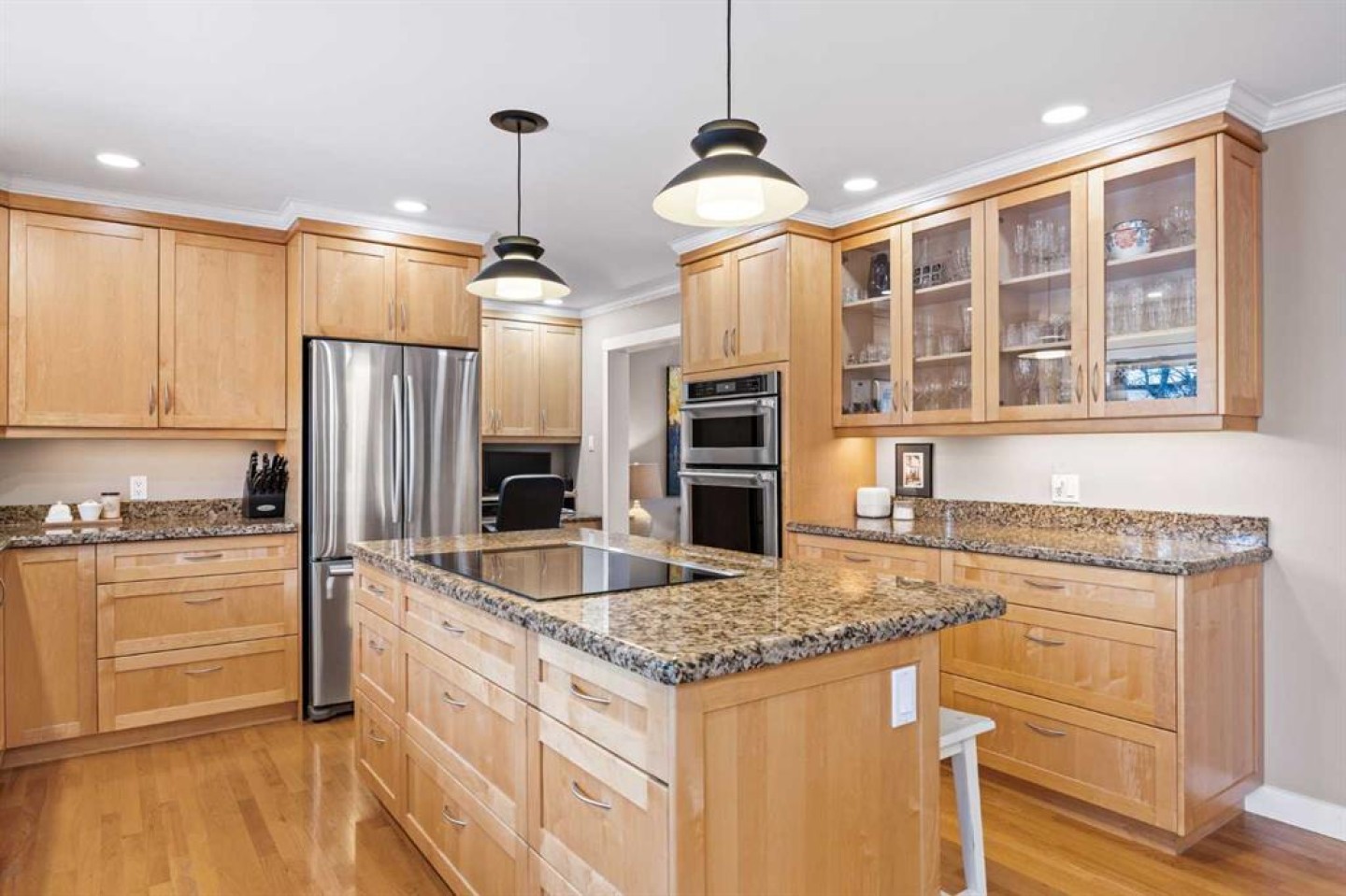 Beautiful curb appeal welcomes you to a charming FRONT PORCH and spacious FOYER that opens into a bright front living room highlighted by a large PICTURE WINDOW. The UPDATED kitchen showcases GRANITE countertops, MAPLE cabinetry, NEW appliances, a WALK-IN PANTRY, and a BUILT-IN workstation, flowing seamlessly into the dining nook and family room. Here, a MARBLE SLAB FIREPLACE with custom built-ins creates a warm and inviting focal point. A stylish CUSTOM BAR with built-in WINE FRIDGE and garden patio doors lead effortlessly to the PRIVATE BACKYARD — surrounded by mature trees, a LARGE COMPOSITE DECK, and incredible outdoor entertaining space.
