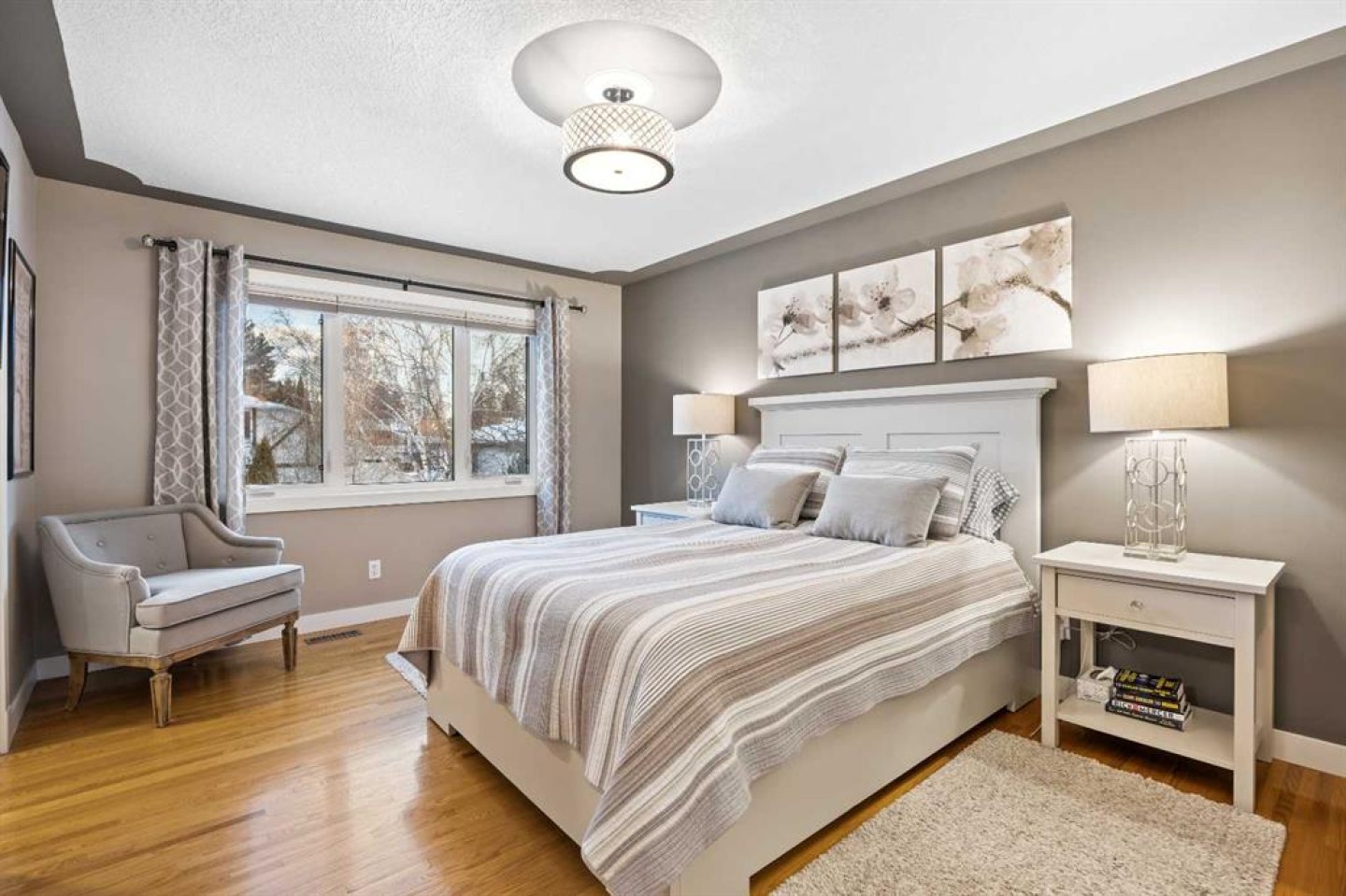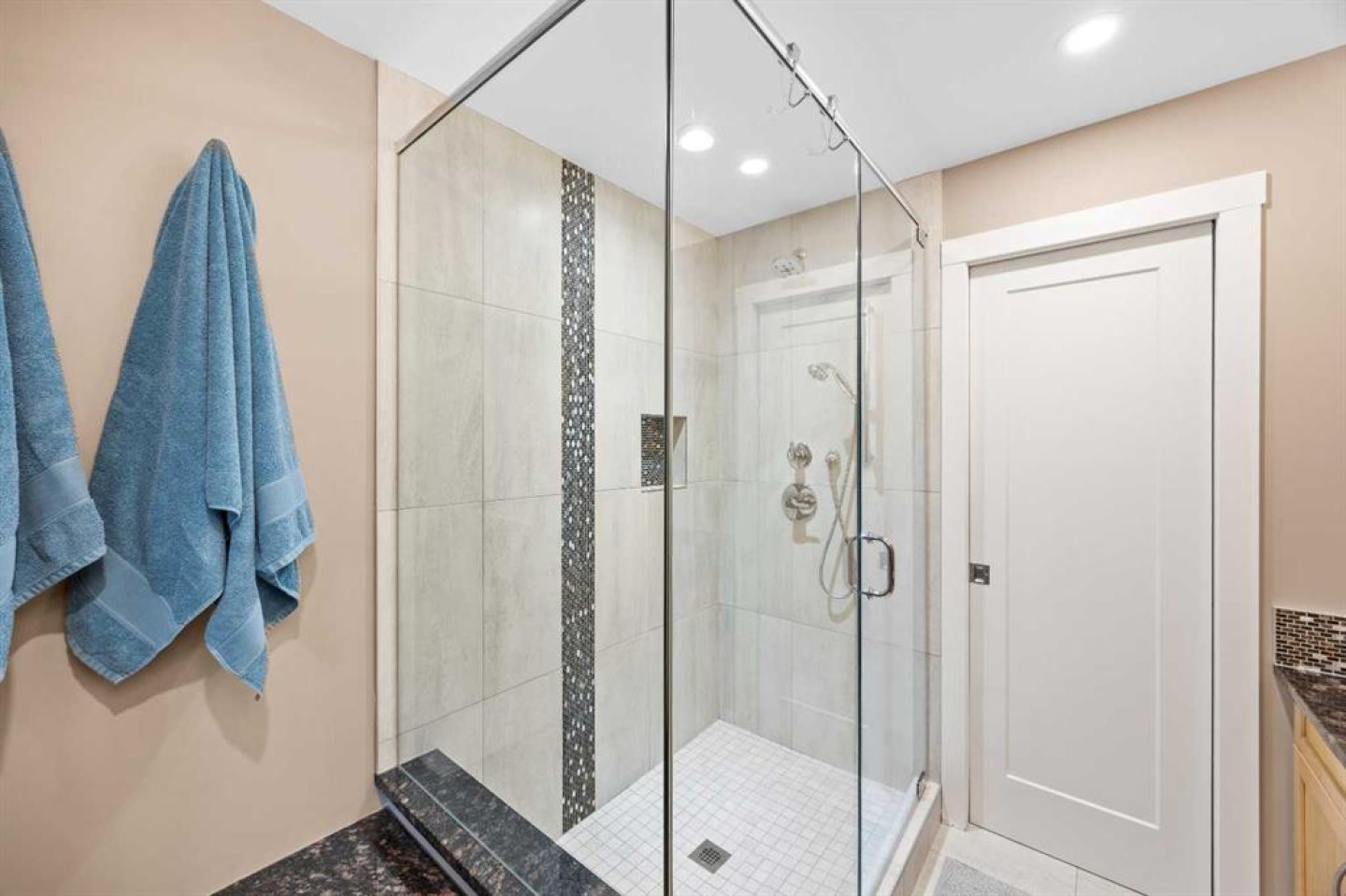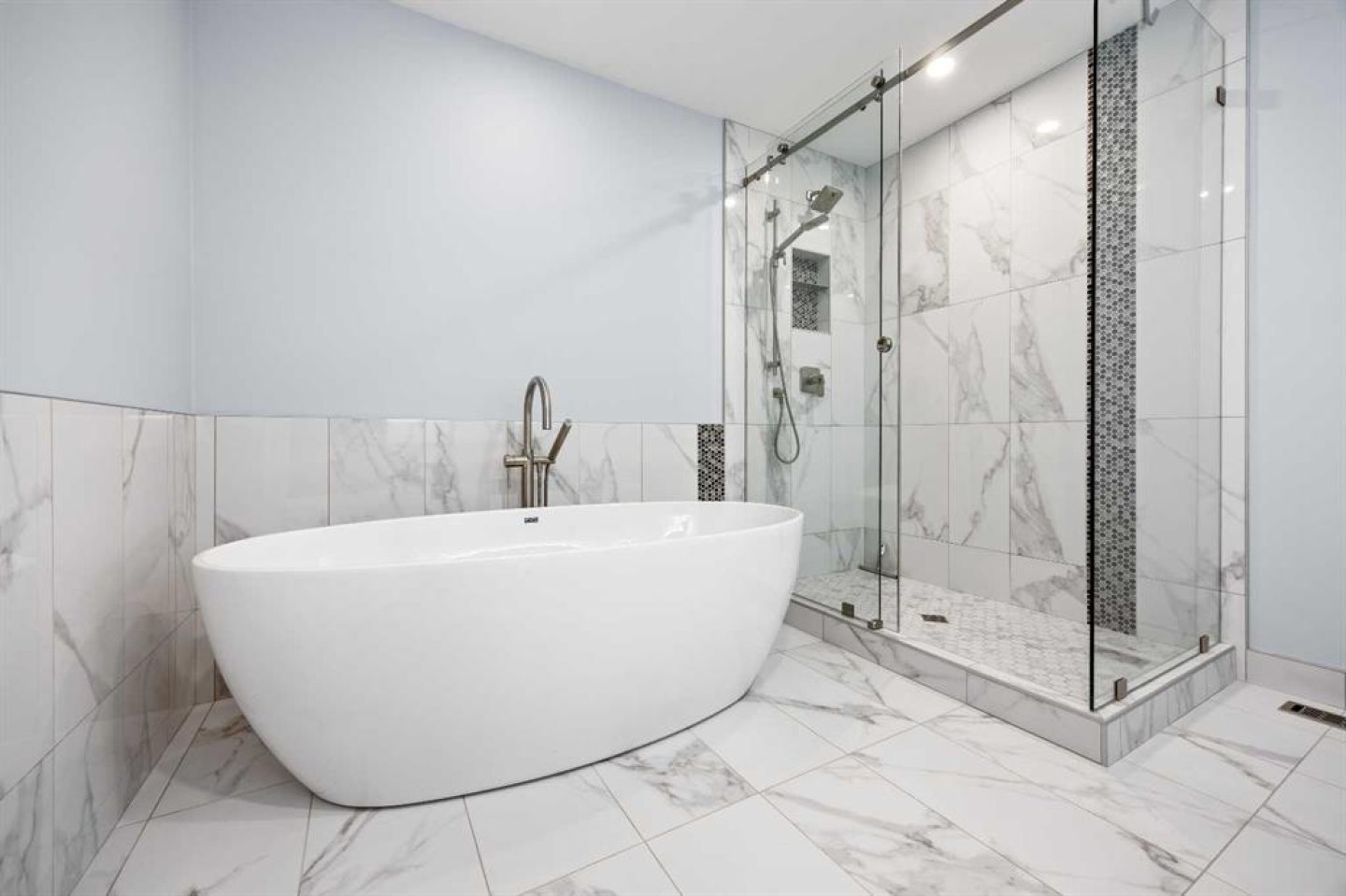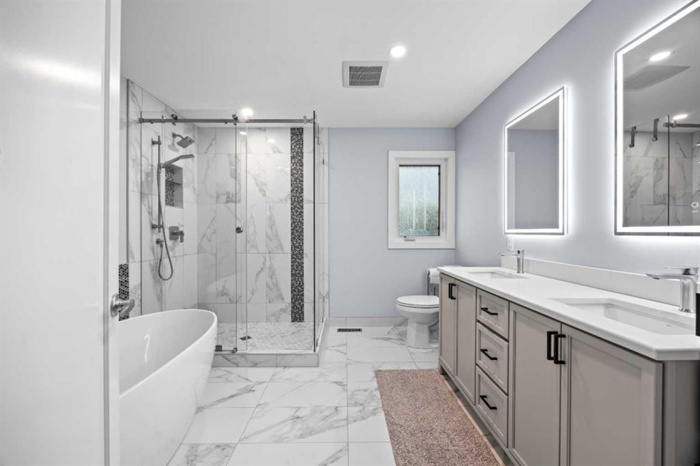 Upstairs, you’ll find 4 SPACIOUS BEDROOMS, including two with access to a remarkable OVERSIZED BALCONY. The beautifully renovated main bathroom features HEATED FLOORS, NEW TILE SHOWER, NEW TOILET, a LARGE ARIA FREESTANDING SOAKER TUB, DOUBLE VANITY, and LIGHTED MIRRORS. The KING-SIZED primary suite is a true retreat, offering a large WALK-IN CLOSET with custom built-ins and a fully updated 5-PIECE ENSUITE with HEATED FLOORS, dual GRANITE VANITY & oversized WALK-IN SHOWER!!