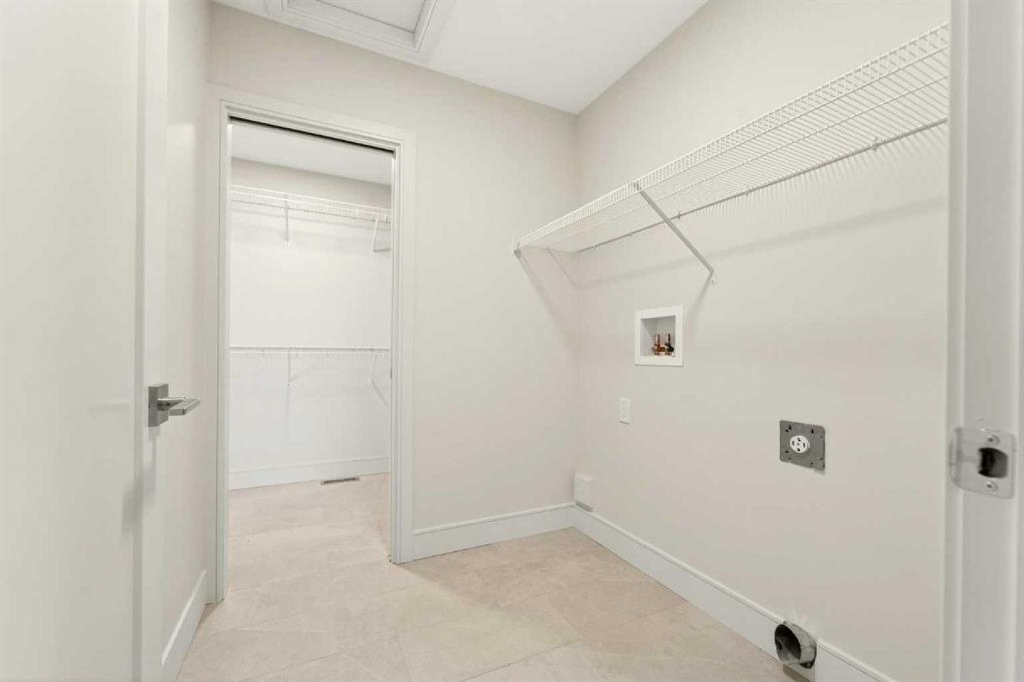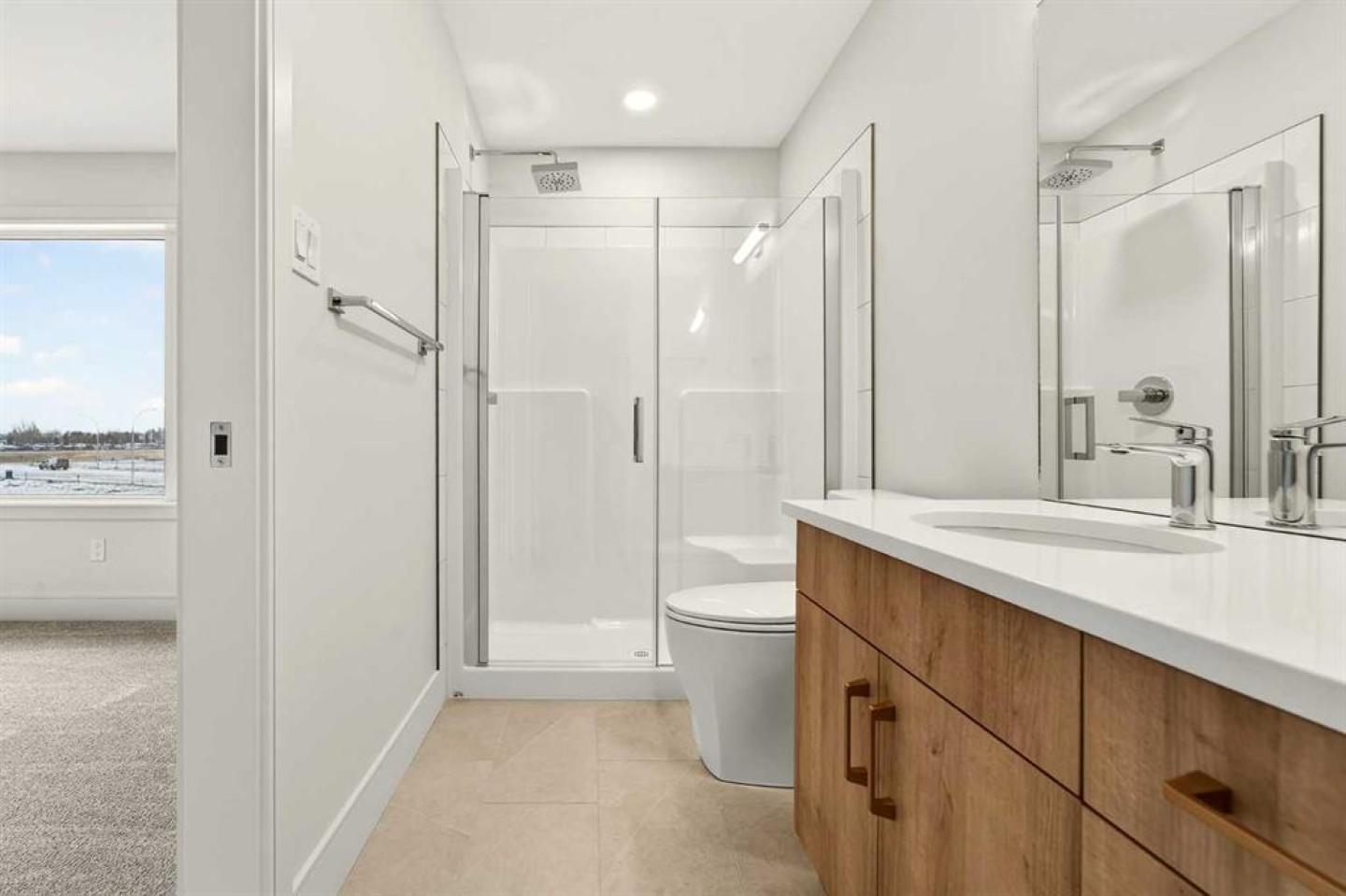 Upstairs, the second level offers three spacious bedrooms, including a well-designed primary retreat. The ensuite features a walk-in shower and a generous walk-in closet that conveniently connects directly to the dedicated laundry room — a small detail that makes a big difference in daily living.