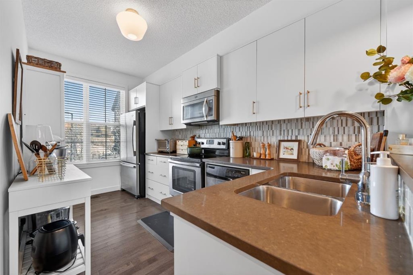 Tucked away from the main road, this unit enjoys a sunny west-facing balcony, filling the home with natural light throughout the day. The main floor features rich hardwood flooring, stainless steel appliances, and a bright, open-concept layout ideal for both everyday living and entertaining. The kitchen has been tastefully refreshed with a crisp white colour palette, complemented by new lighting, fresh paint, and new carpet throughout.