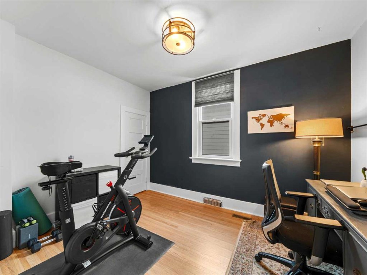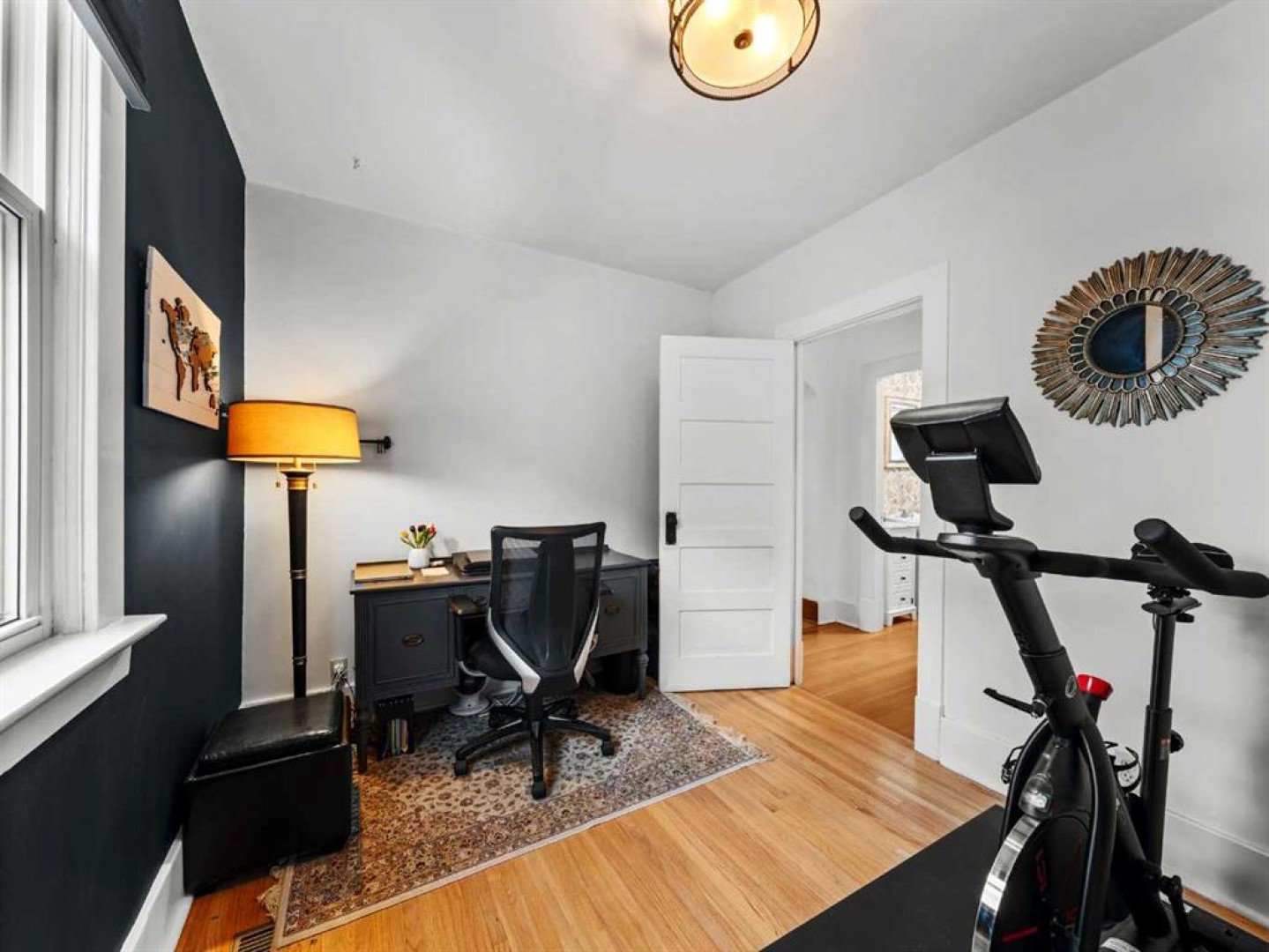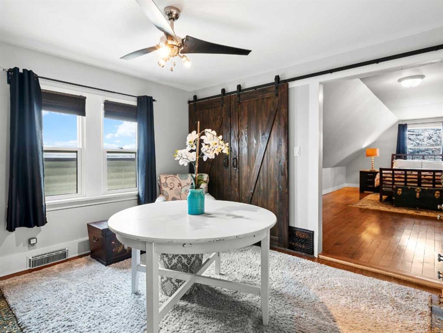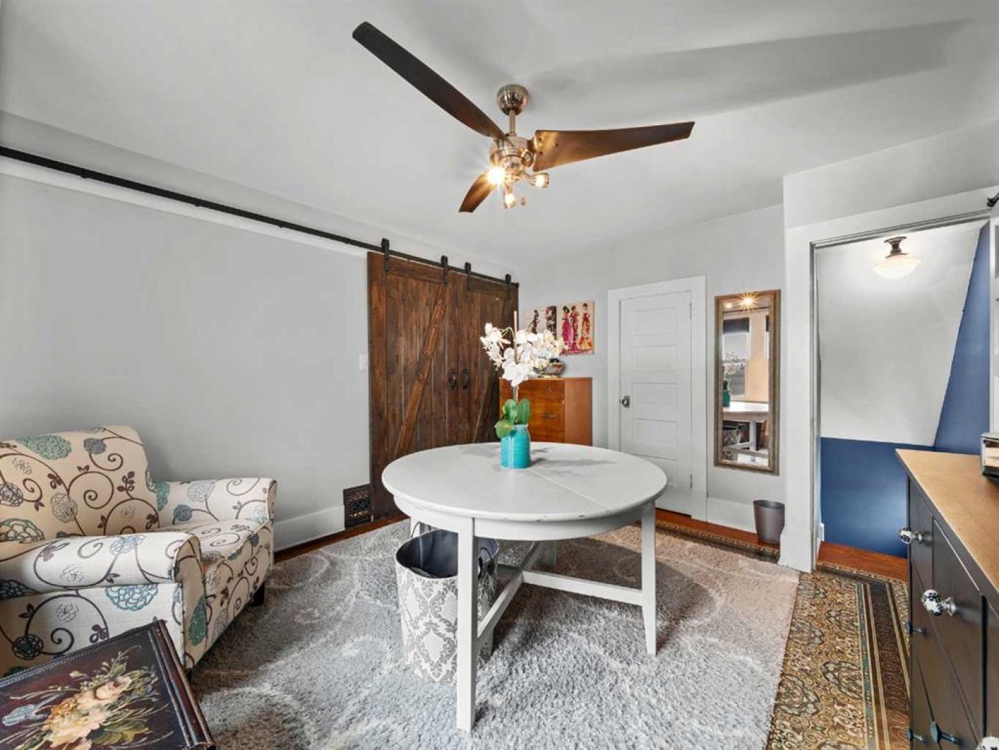 The main floor also includes a versatile bedroom suitable for a home office, studio, or guest room. The main floor bathroom features a classic claw-foot tub complemented by wallpaper adding a classic touch. Upstairs, a flexible sitting or office area leads through barn doors to a spacious primary bedroom.