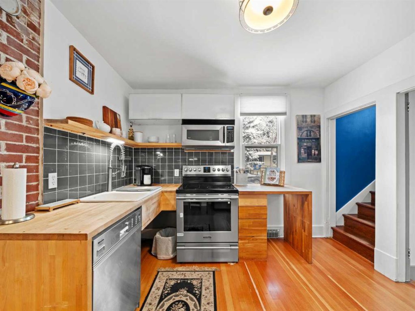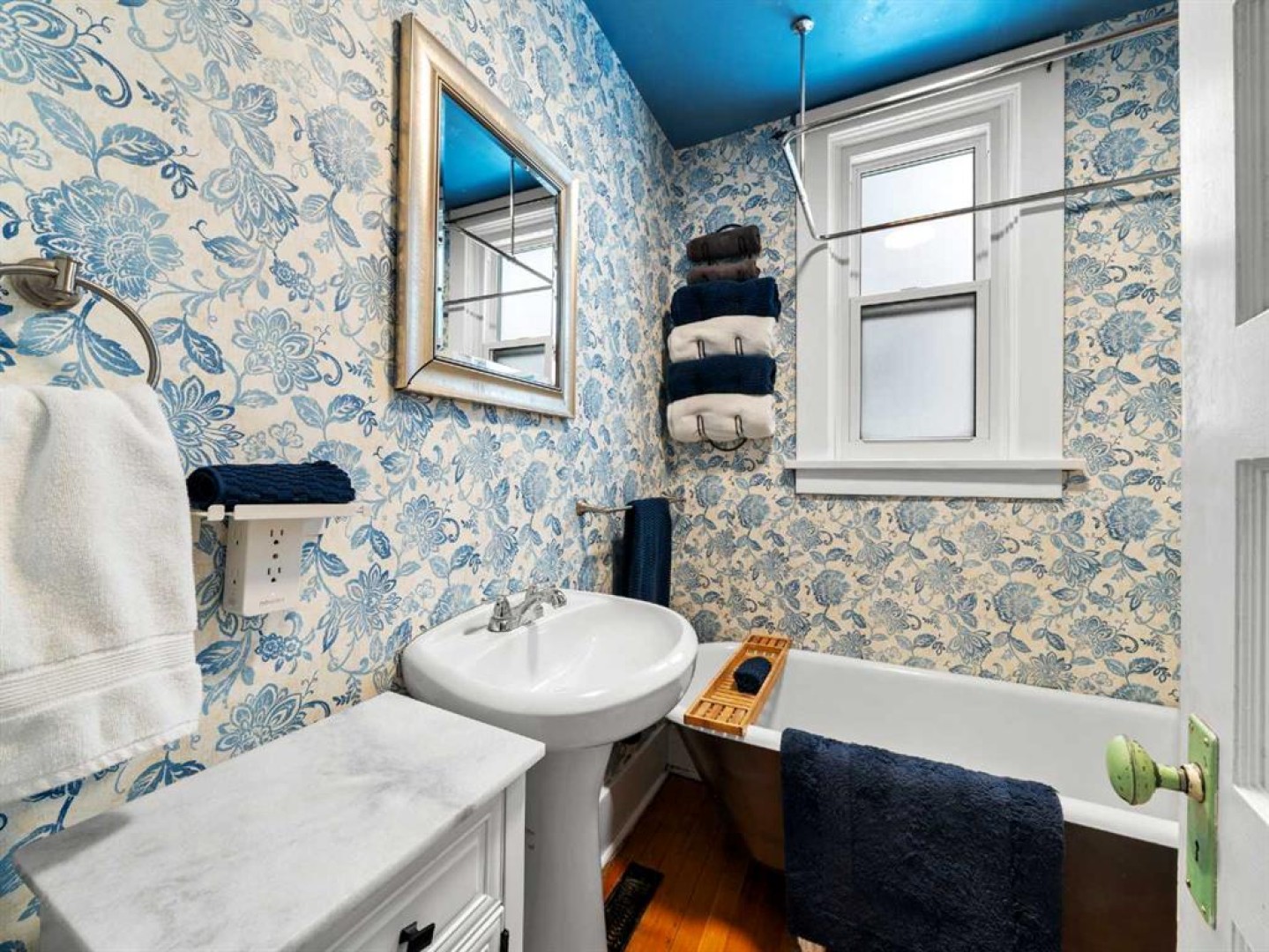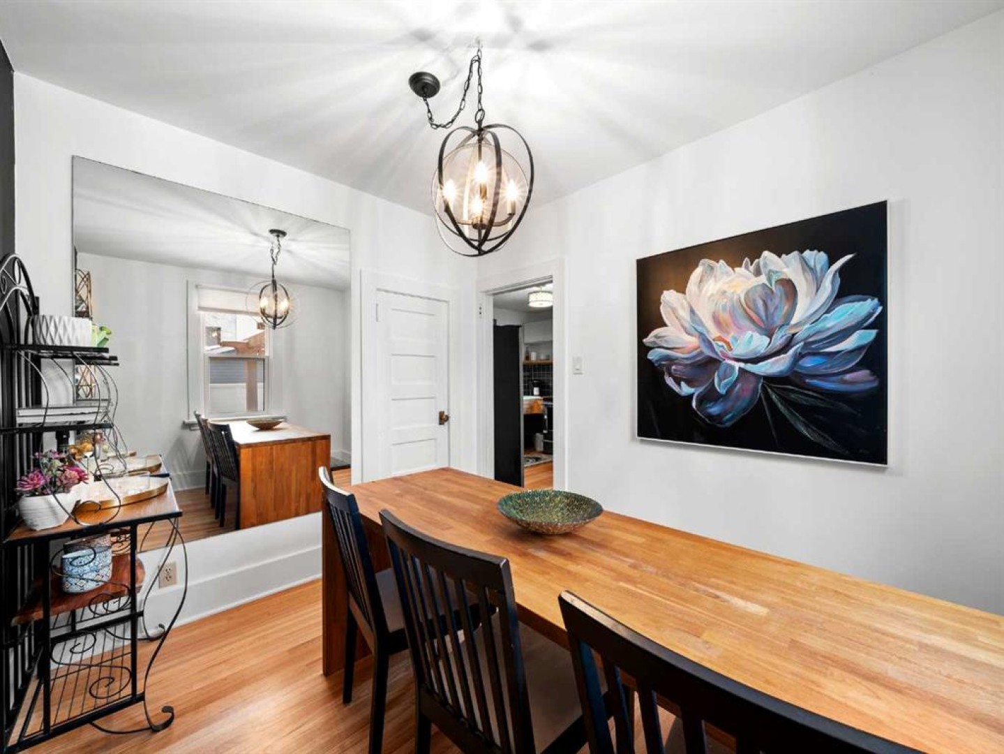 The main floor also includes a versatile bedroom suitable for a home office, studio, or guest room. The main floor bathroom features a classic claw-foot tub complemented by wallpaper adding a classic touch. Upstairs, a flexible sitting or office area leads through barn doors to a spacious primary bedroom.