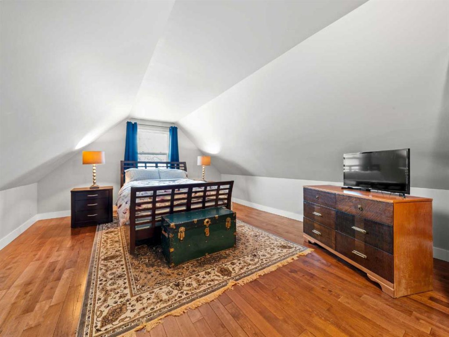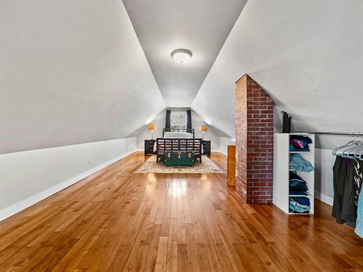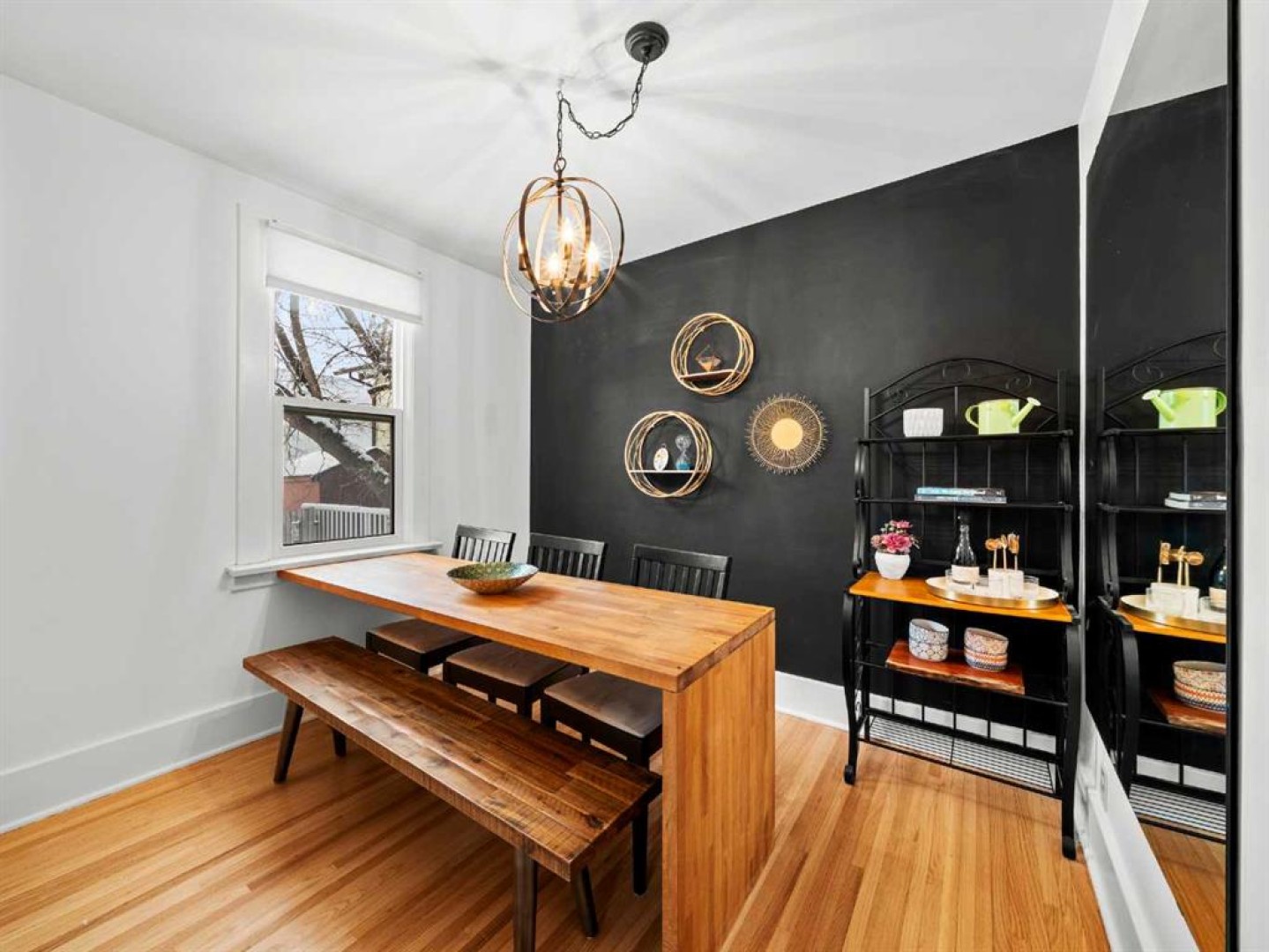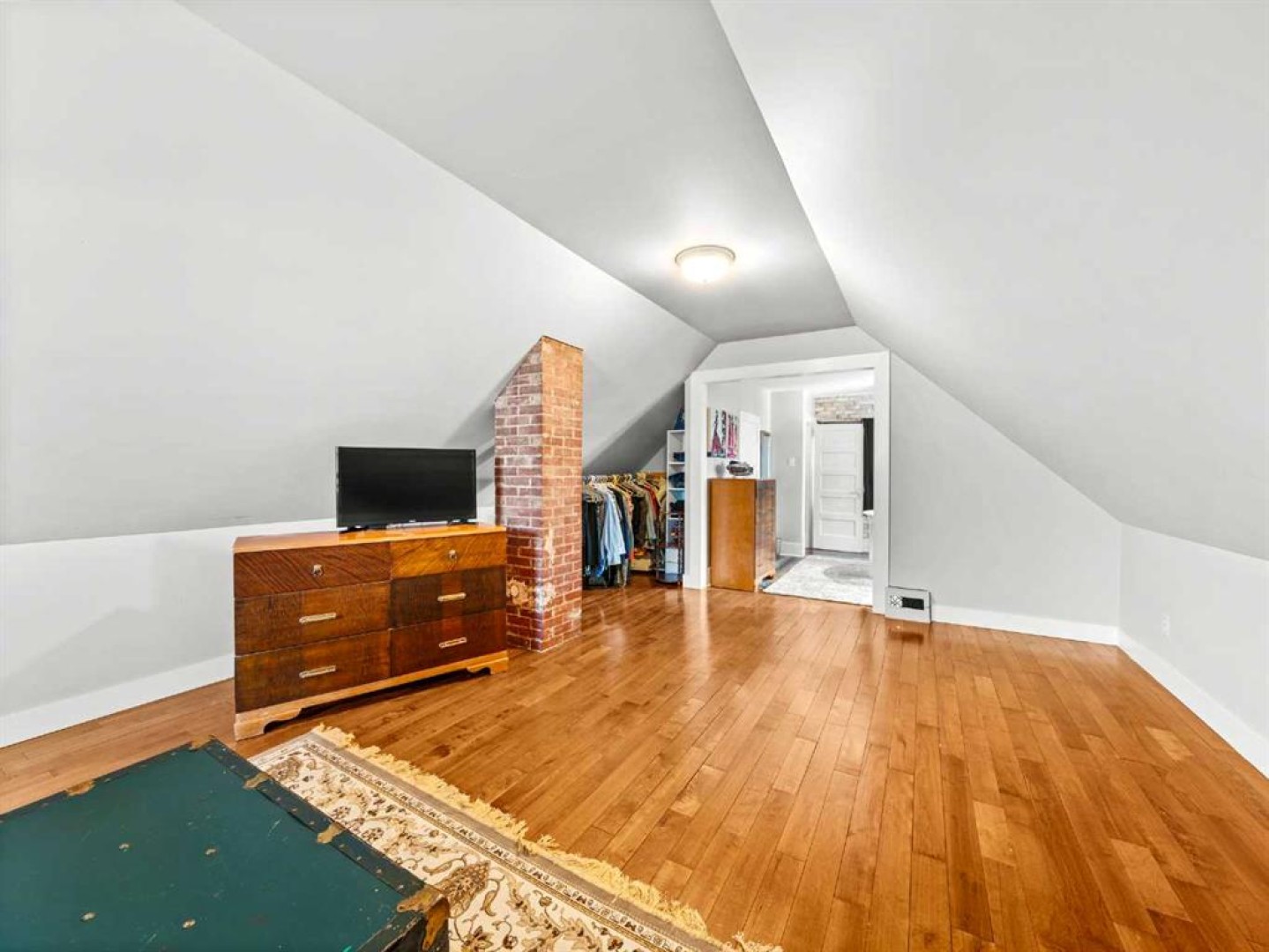 The main floor also includes a versatile bedroom suitable for a home office, studio, or guest room. The main floor bathroom features a classic claw-foot tub complemented by wallpaper adding a classic touch. Upstairs, a flexible sitting or office area leads through barn doors to a spacious primary bedroom.