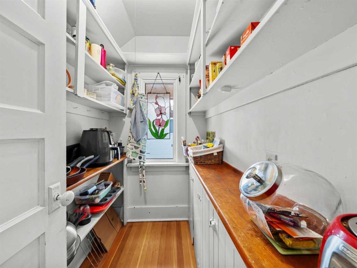 The kitchen has been modernized over time with updated cabinetry and stainless steel appliances, and includes access to a walk-in pantry with built-in shelving and cabinetry. A separate dining room provides ample space for everyday dining or entertaining.