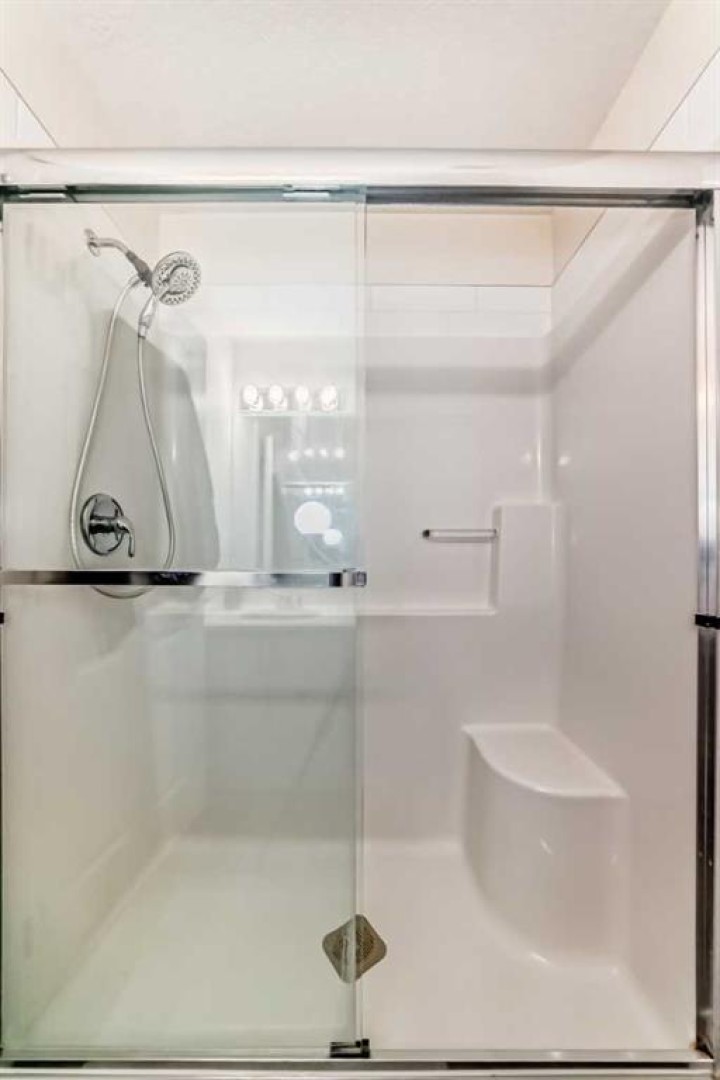 The modern kitchen features quartz countertops, a subway-tile backsplash, textured thermafoil cabinetry, and a movable quartz island, perfect for entertaining and everyday living. Both full bathrooms are finished with quartz counters, continuing the clean, contemporary design.