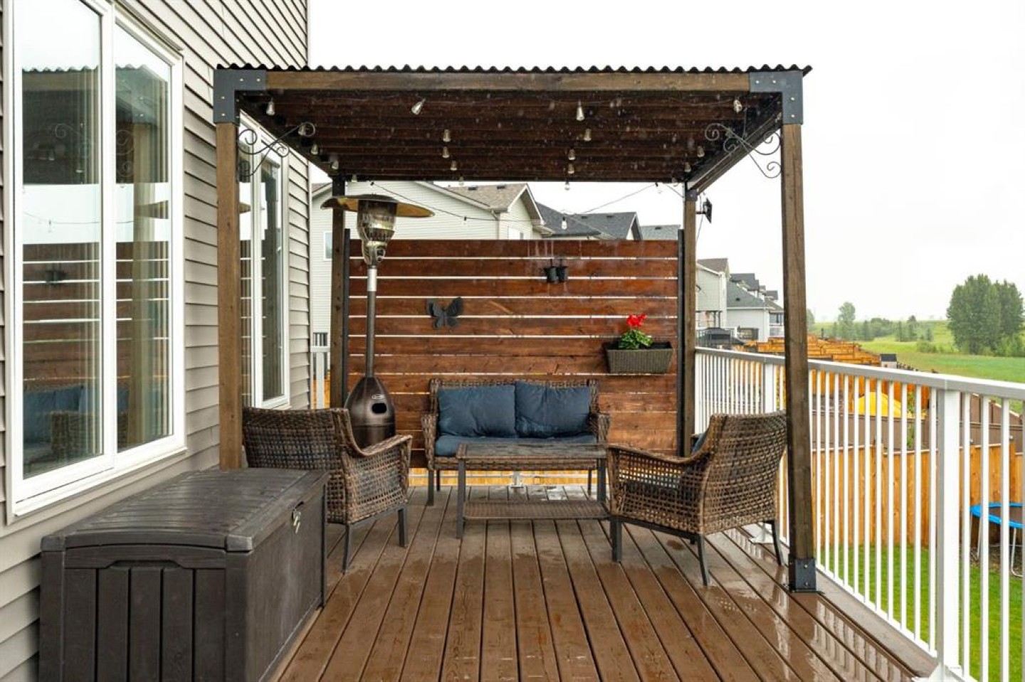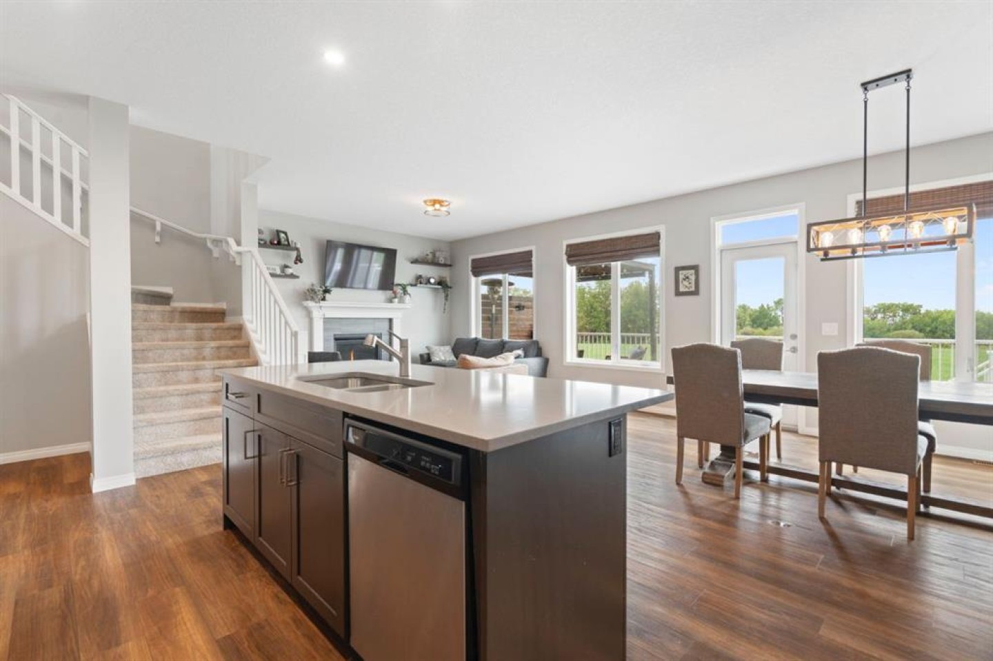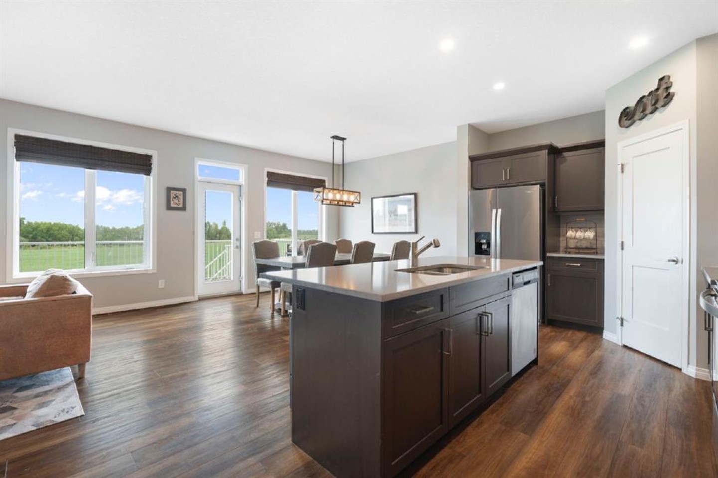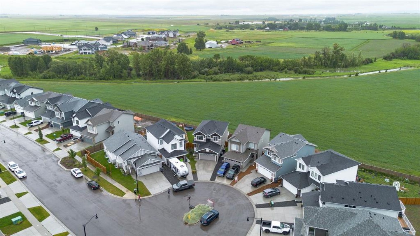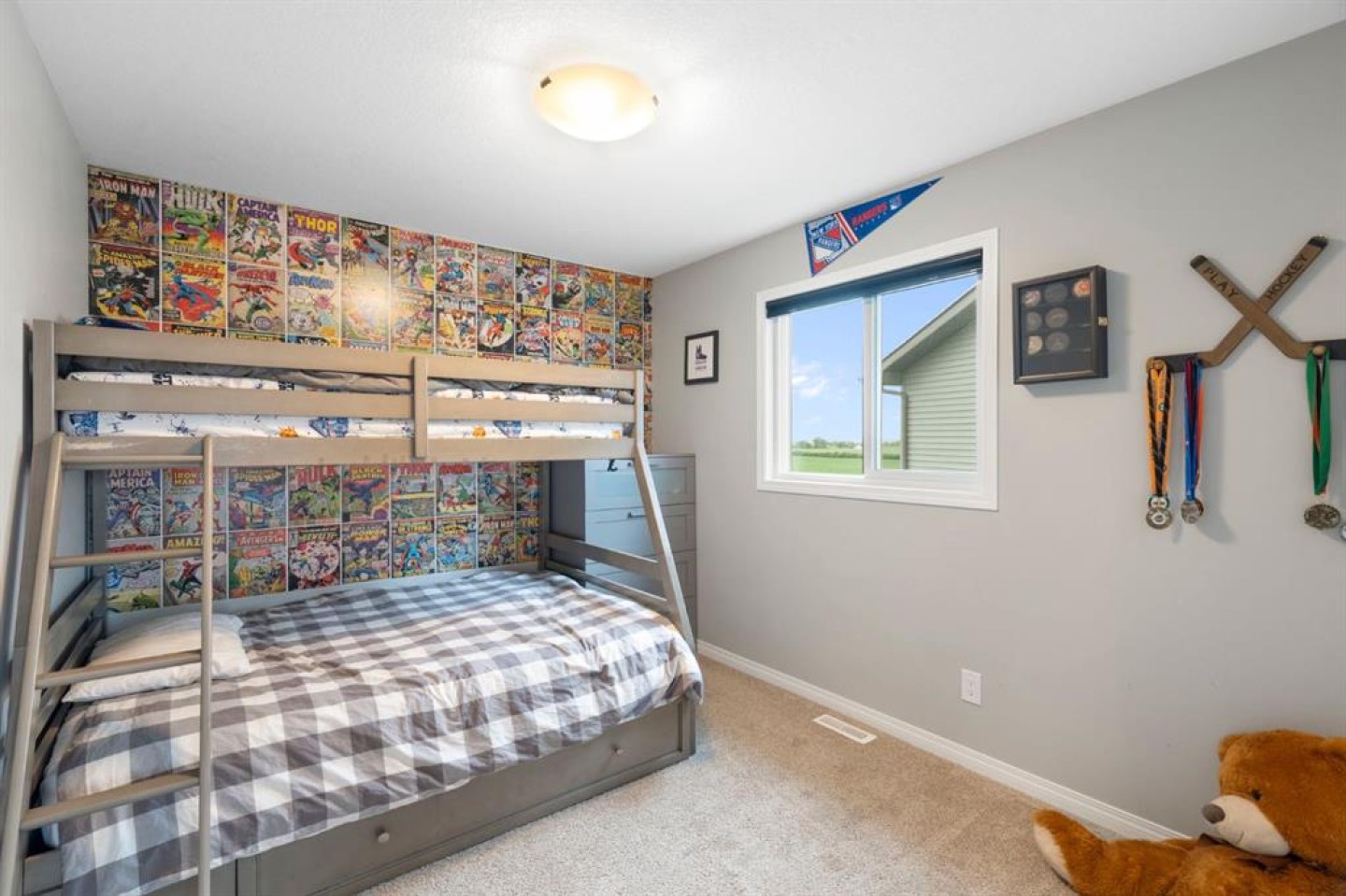 Outside, the west-facing pie-shaped backyard backs onto open farmland leased by a local farmer, giving you peaceful prairie views and the kind of backyard most people only dream of. The home also features A/C to keep you cool in the summer and warm in the winter, plus gorgeous trim lighting that adds a little sparkle year-round. And for those who like their winters toasty, the double attached garage is already equipped with a heater, because stepping into a warm car on a cold Alberta morning? That’s living the dream.