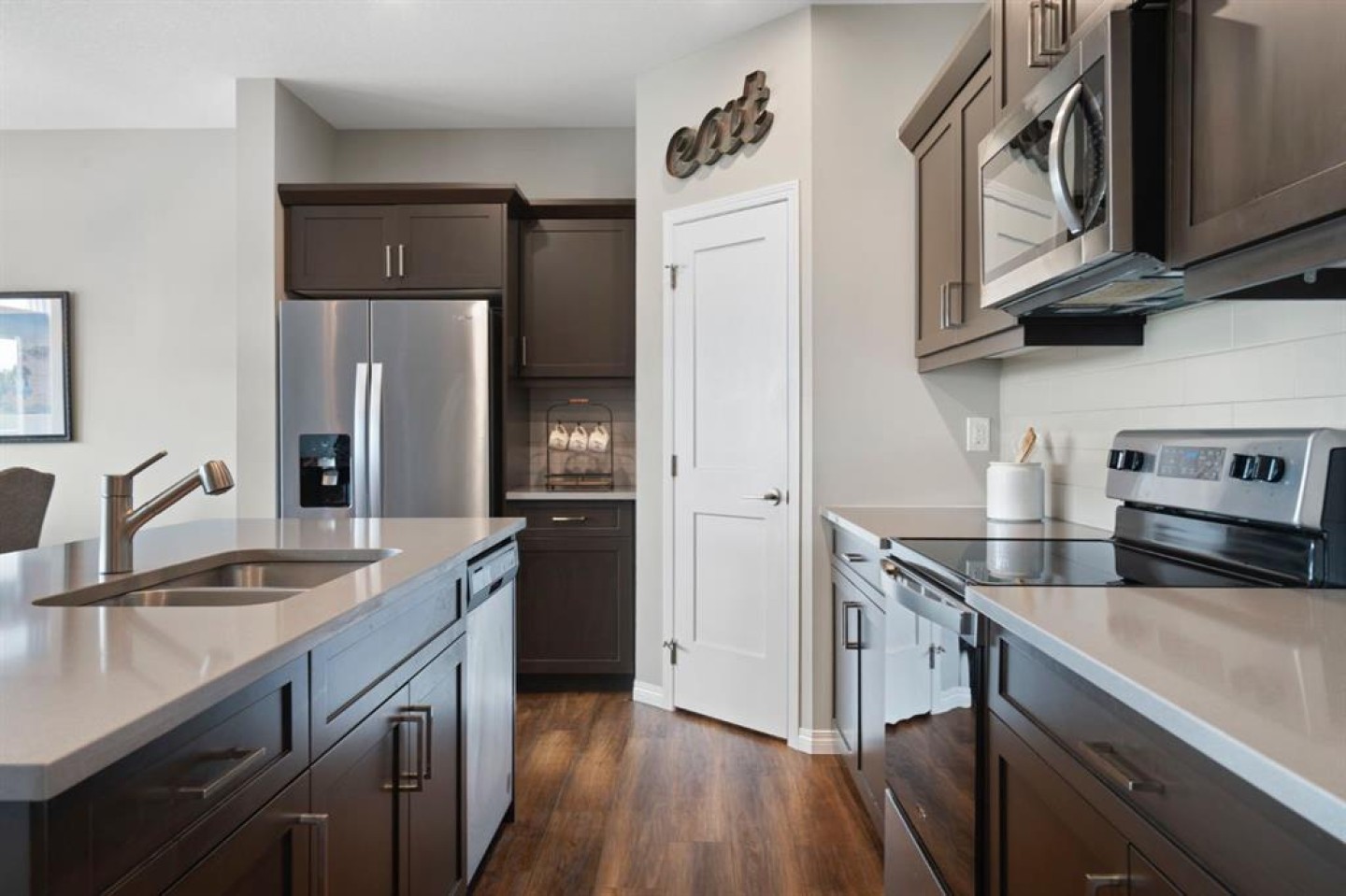 Step inside and you’re greeted by a spacious, open-concept main floor featuring a modern kitchen with quartz counters, loads of counter space, and a walk-in pantry to keep everything tucked away. The dining area flows beautifully into the living room, where a cozy gas fireplace sets the tone for family nights or lazy Sundays. Just around the corner, but cleverly tucked away for privacy, is a main floor office, perfect for those who work from home or need a quiet retreat.