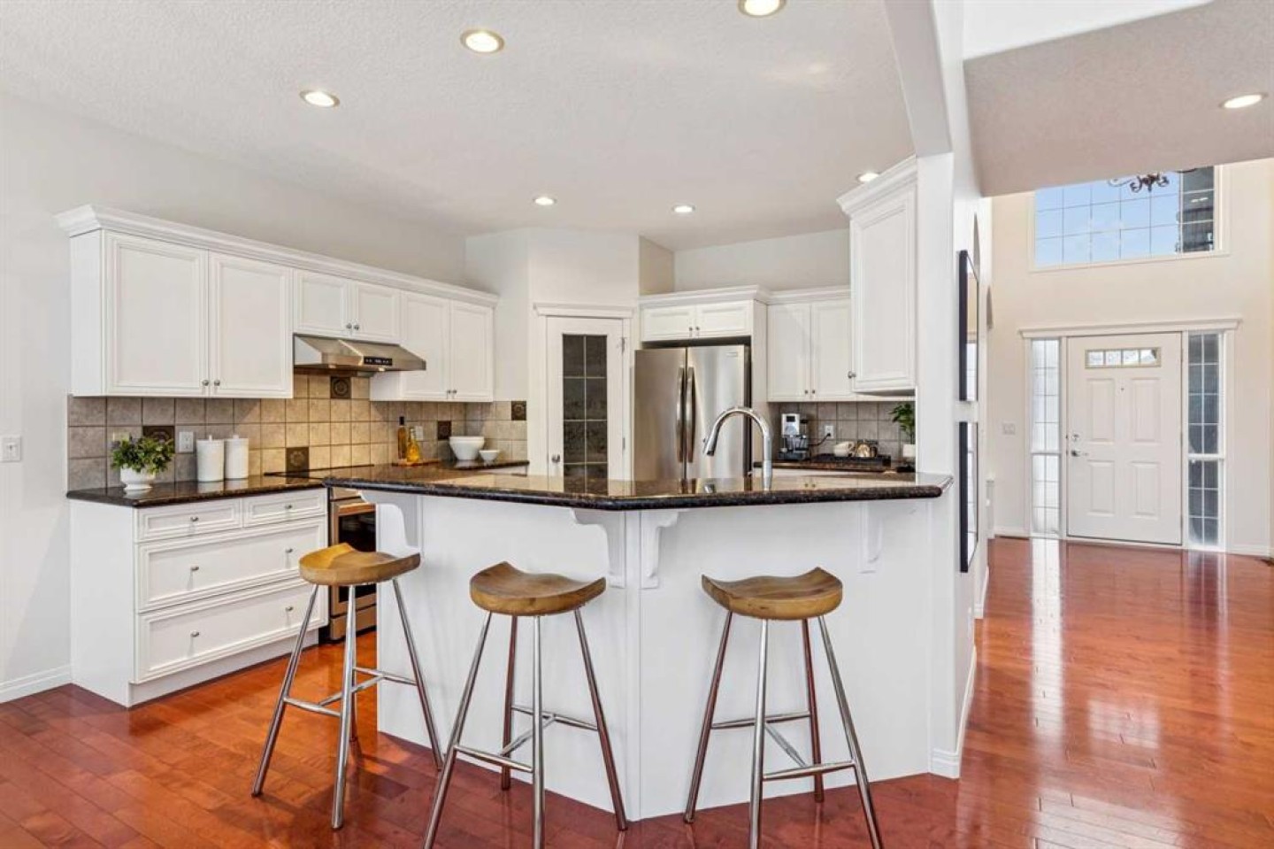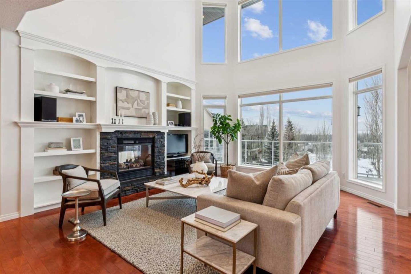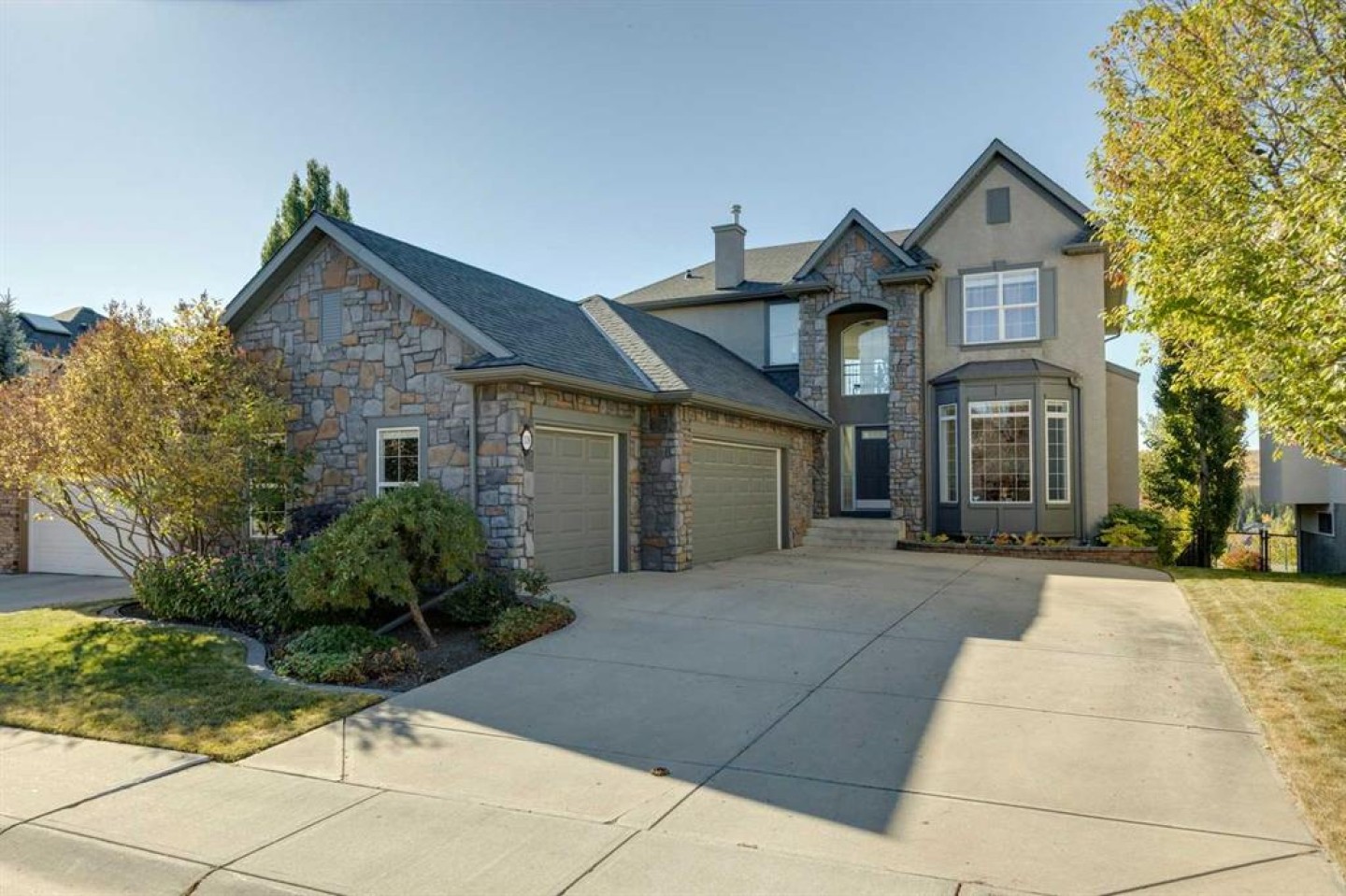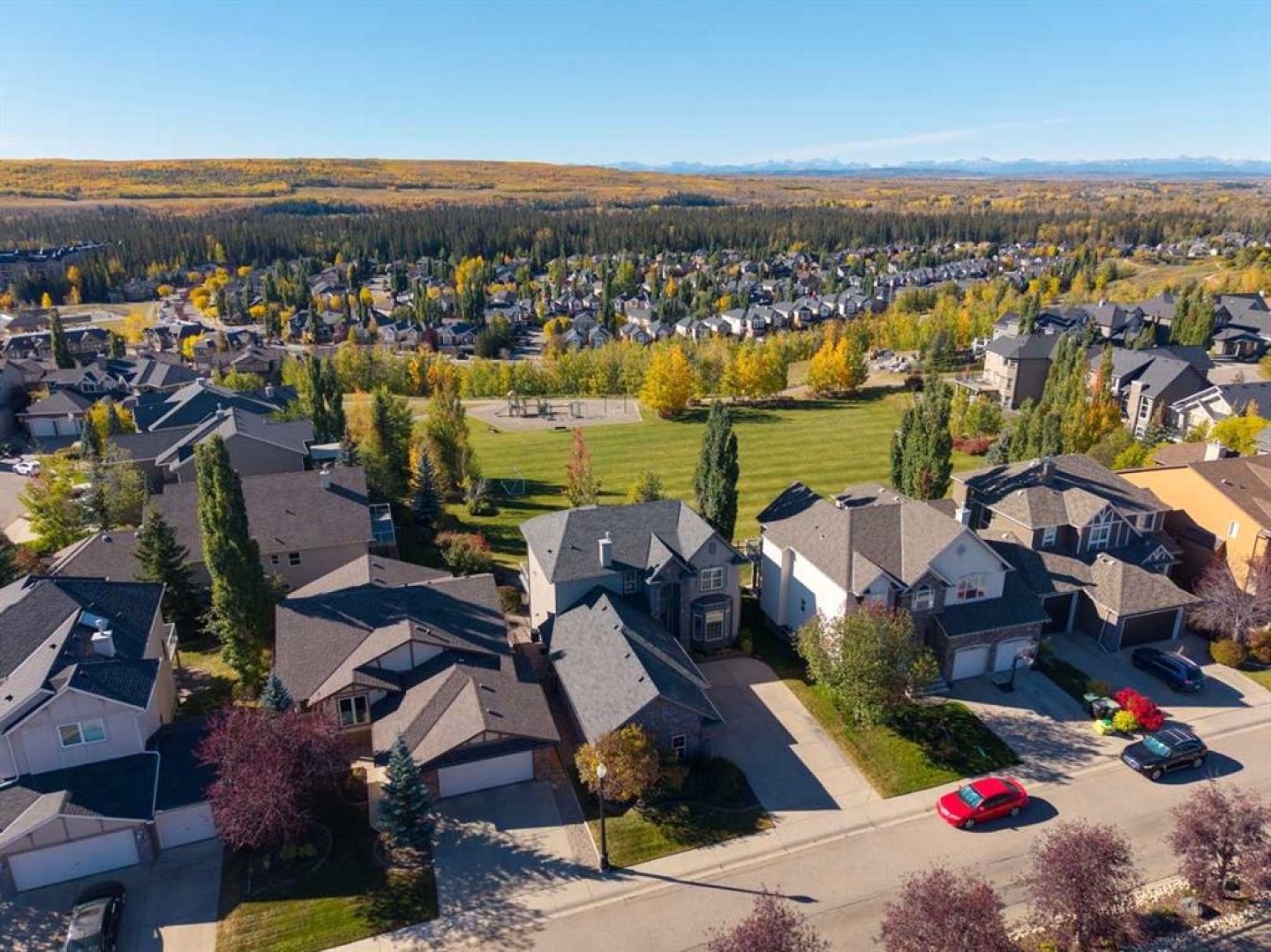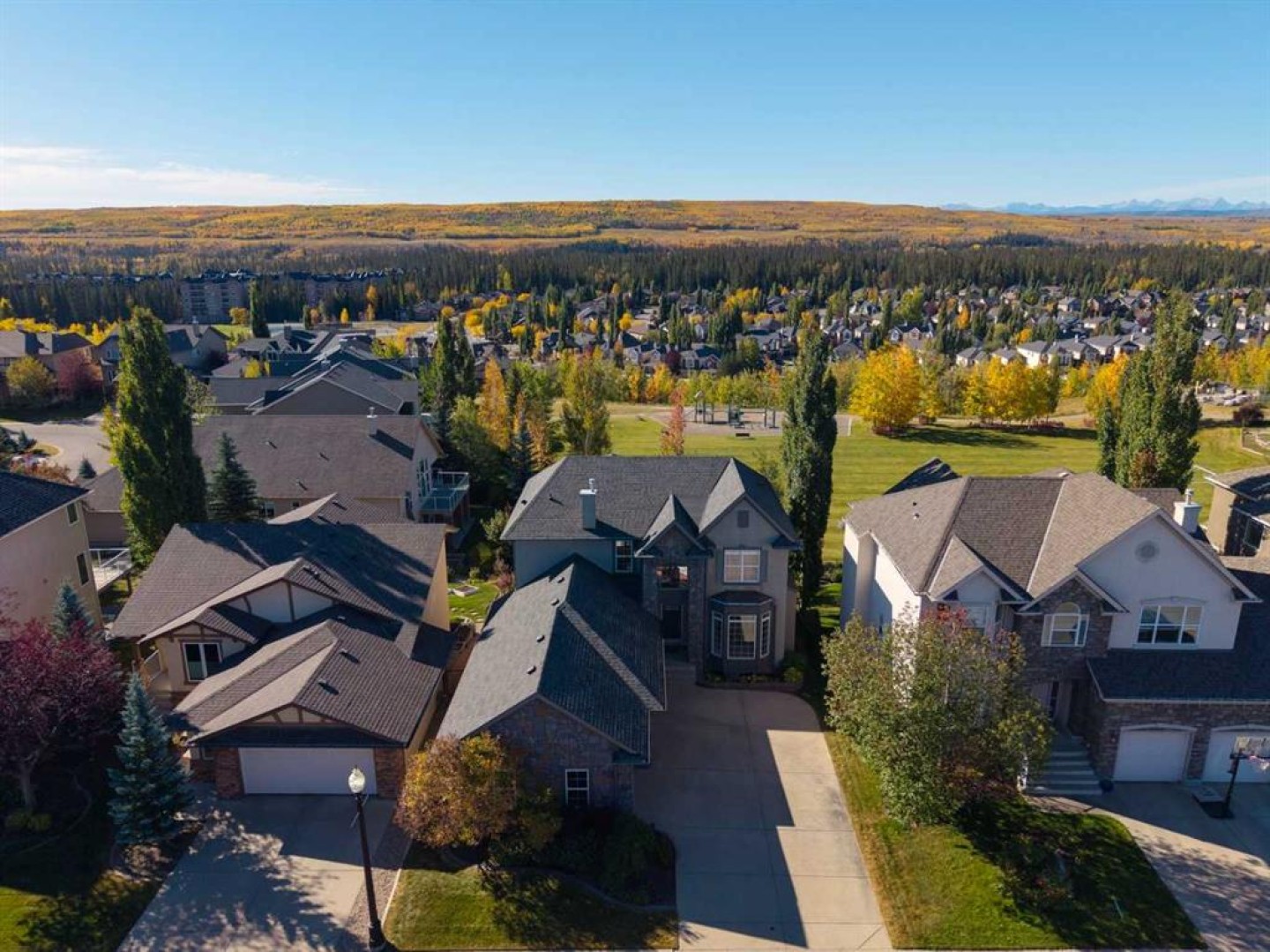 *Open House Saturday January 10th 1:00-3:30pm* Located on a premium lot within the neighbourhood, this exceptional home offers unobstructed mountain and valley views, a sunny south-facing backyard, and direct access to a park through a private rear gate. With an oversized triple garage that car enthusiasts will love and a bright walk-out basement, this highly sought-after property offers space and comfort in one of the area’s most prized settings. The main floor features a spacious dining room, perfect for special occasions, and an open-concept living room, kitchen, and breakfast nook designed to capture the incredible views. Features of the living room include a double-height ceiling, a fireplace flanked by built-in cabinetry, and expansive windows that flood the space with natural light. The kitchen offers classic white cabinetry, granite countertops, stainless steel appliances, a pantry, breakfast bar, and a sunny dining nook set within a bay window. A cozy den or office shares the double-sided fireplace and includes built-in bookcases and peaceful backyard views, creating an ideal space to work or unwind. Convenient main-floor amenities include a powder room, laundry room, and a functional mudroom with direct access to the oversized triple garage. The garage is exceptionally well equipped with storage cabinetry, a workbench, and ample room for vehicles, sporting equipment, and hobbies. Upstairs, the primary bedroom is a true retreat, featuring a bay window with spectacular views, a walk-in closet, and a well-appointed ensuite with dual sinks, a soaker tub, separate shower, and private water closet. Two additional well-sized bedrooms share a full bathroom, offering an ideal family layout. The bright walk-out basement offers a generous family room with built-in media room with 110” home theatre with custom cabinetry, a wet bar, and space for games or play, ideal for movie nights or watching the big game. A fourth bedroom, full bathroom, and a versatile flex room currently used as a gym complete the lower level. Outdoor living is exceptional, with a full-width deck spanning the back of the home, a covered lower patio with pavers, and a beautifully oriented backyard that opens directly onto a green space, a playground, and extensive walking trails. A new roof was installed in 2023, adding peace of mind to this remarkable home. With its exceptional setting and rare combination of features.
