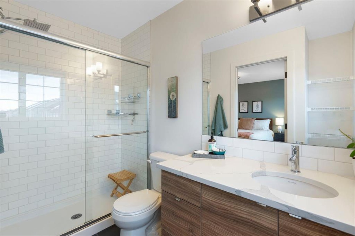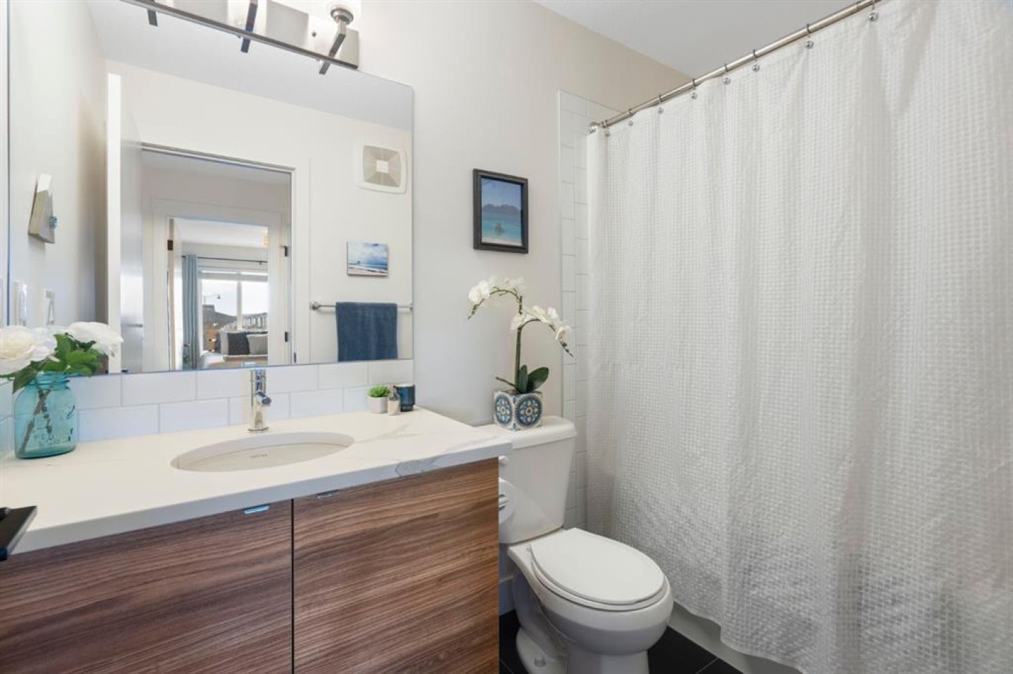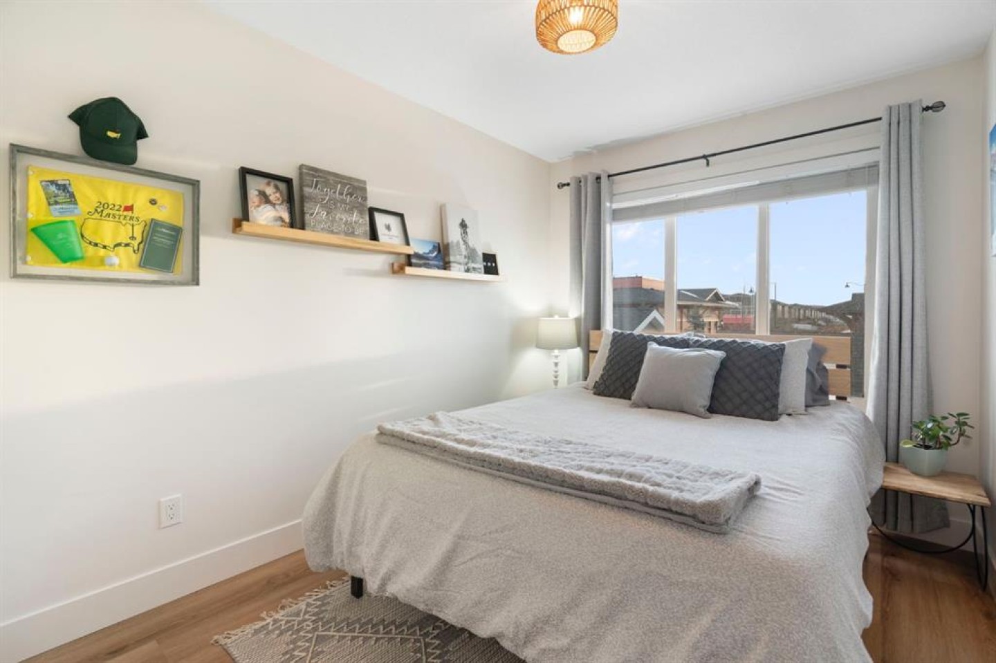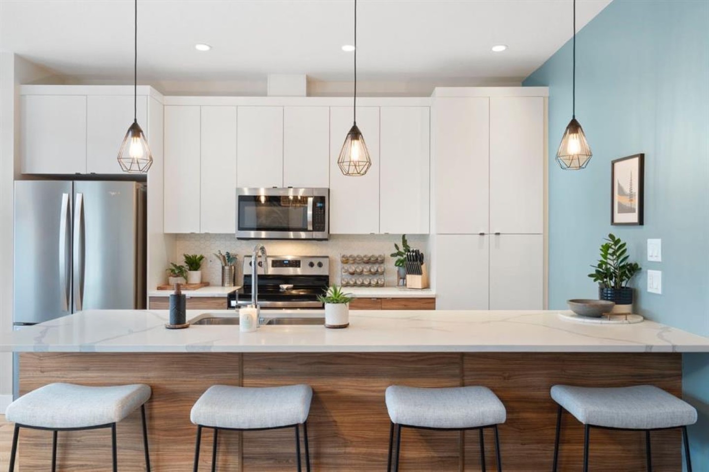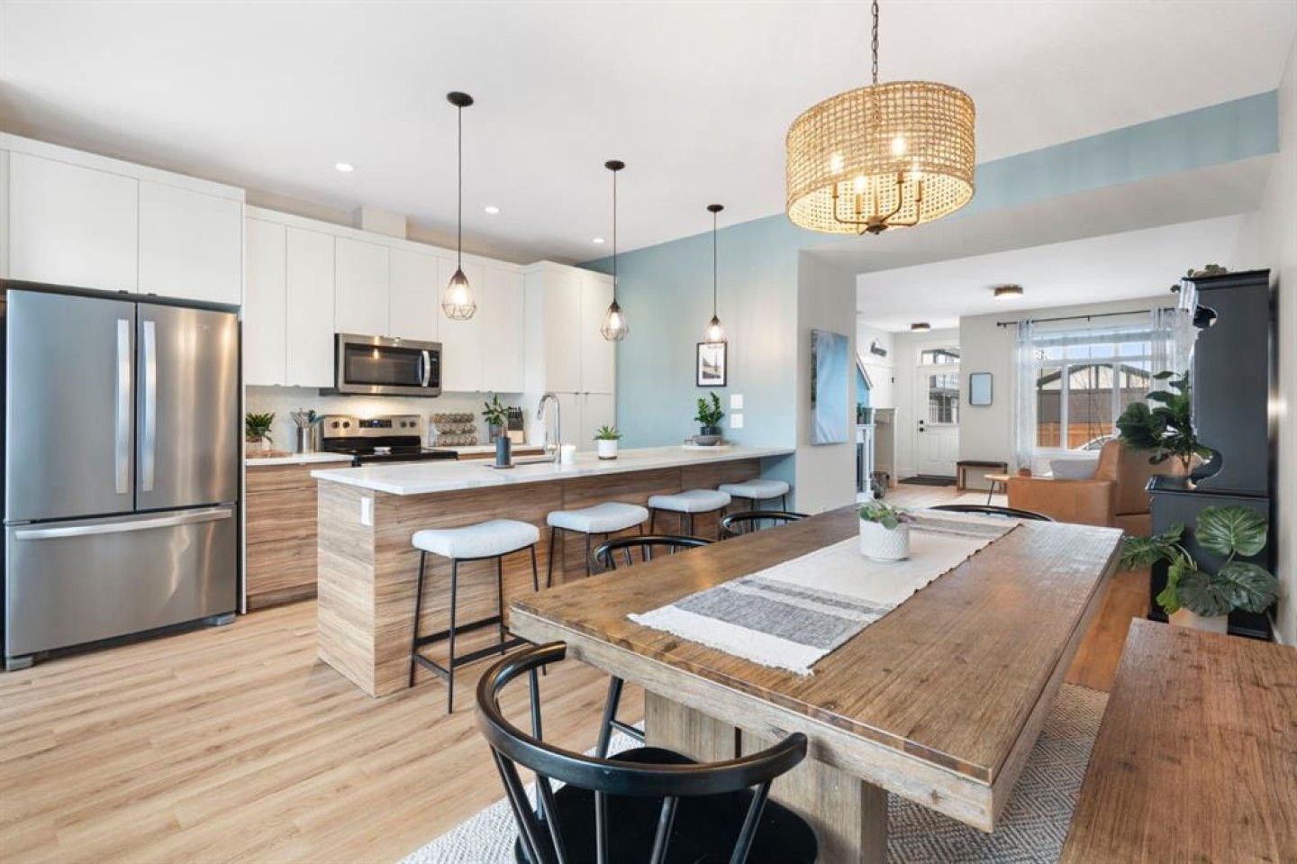 The main floor is open and inviting with 9’ ceilings, upgraded vinyl plank flooring, and feature walls that bring warmth and personality to the space. The kitchen is both practical and polished, featuring quartz countertops, a large island, sleek cabinetry, and upgraded lighting that’s perfect for busy mornings, casual meals, and hosting friends. Air conditioning ensures year-round comfort.