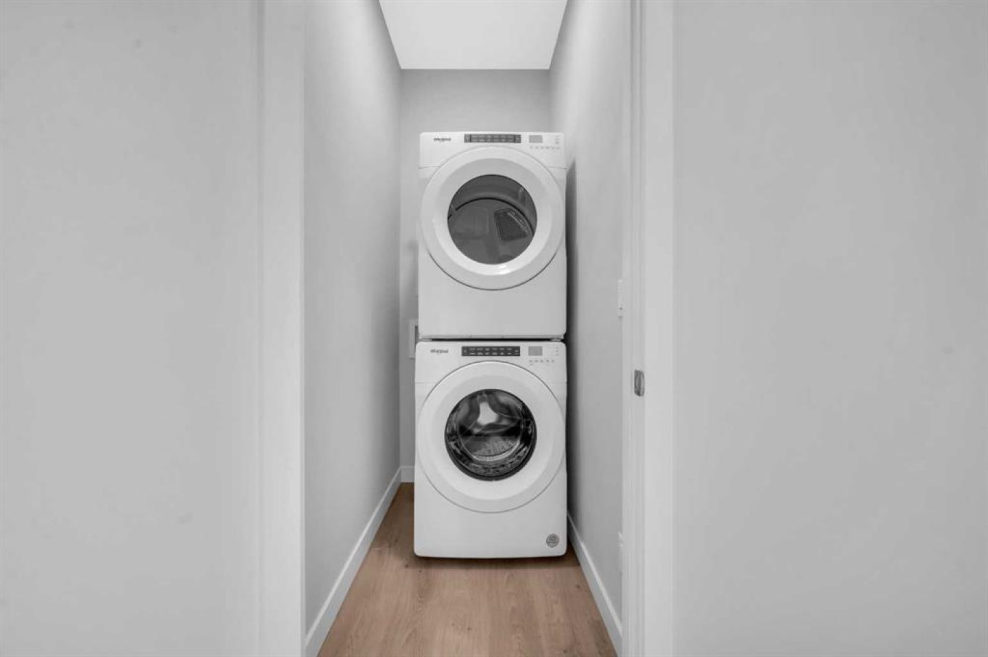 Dishwasher, Electric Range, Range Hood, Refrigerator, Washer/Dryer Stacked