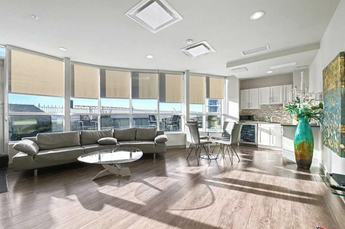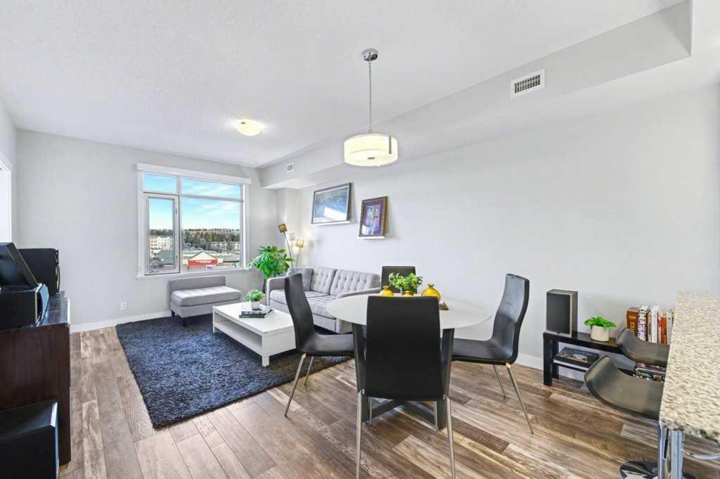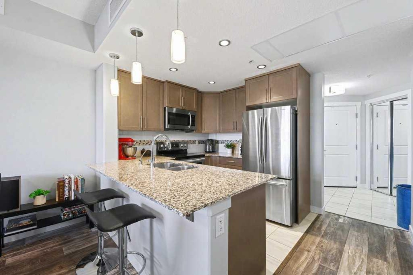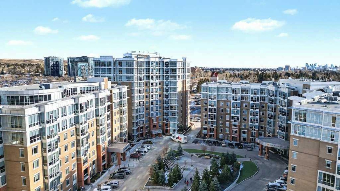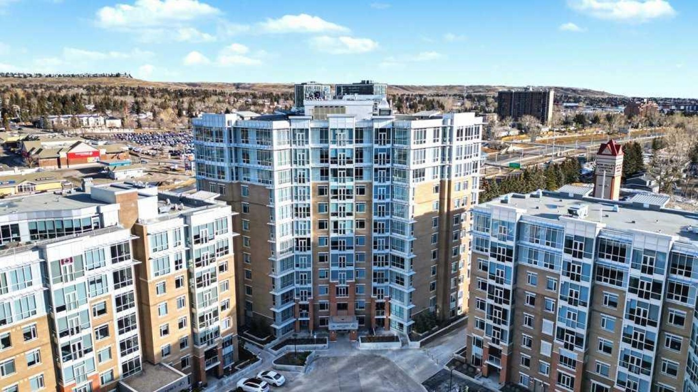 Bright 8th floor 1 bedroom + den in The Groves of Varsity. Floor-to-ceiling windows bring consistent natural light without harsh afternoon heat yet still has central AC for summer comfort. Kitchen offers granite counters, ceiling-height cabinets, and stainless appliances plus pantry for extra storage and durable, easy to clean surfaces. Laminate through living, dining and den gives an open, modern look with simple upkeep. Bedroom has walk-through closet into the tiled 5-pc bath, and in-suite laundry keeps everything contained. Titled underground parking, storage locker, gym, steam room, owners' lounge and rooftop terrace with mountain views add convenience without leaving the complex. Steps to LRT at Dalhousie Station and nearby medical/retail, quick access to U of C and airport for true lock-and-leave living. Call today!