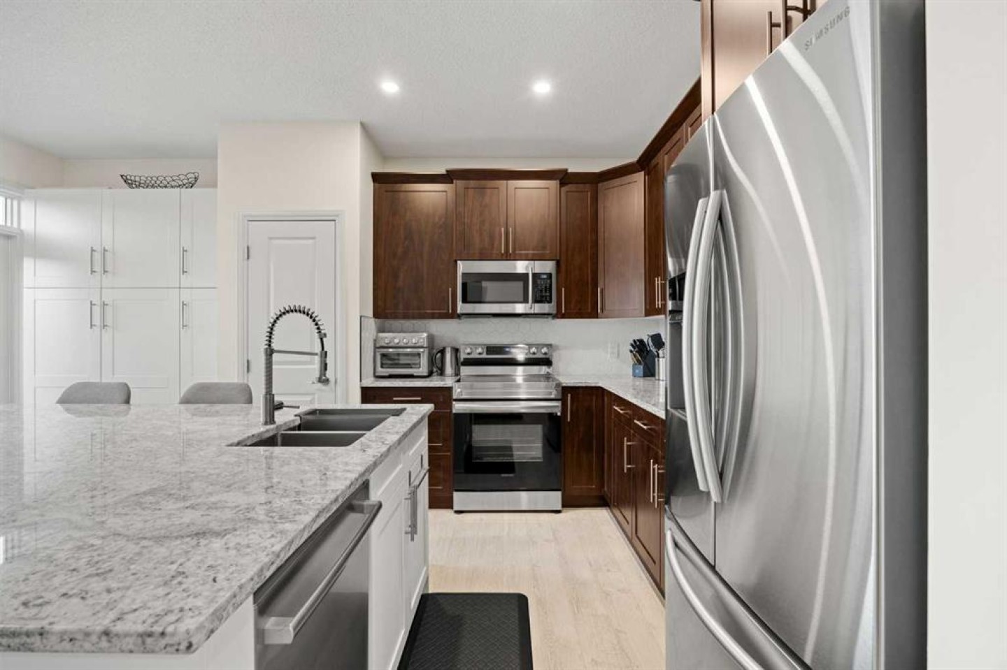*OPEN HOUSE SATURDAY 12-2PM* It’s not often a single home checks this many boxes — fully finished WALK-OUT basement, A/C, turf backyard, double attached garage with 220V power, ANDDD a heated single detached garage (15W x 21L x 12H) with alley access. Perfect for extra storage, a man cave, workshop, or she-shed. Step inside and you’re immediately greeted by an abundance of natural light flooding the main floor. The kitchen features two-tone cabinetry, a pantry, stainless steel appliances, and a massive island with built-in seating and countertop power, plus direct access to the rear deck. The open-concept layout flows seamlessly into the living room, anchored by a cozy gas fireplace — ideal for everyday living and entertaining. Upstairs is where this home really shines. The spacious primary bedroom offers a functional ensuite with double vanity, soaker tub, and glass shower. The walk-in closet connects directly to the laundry room for next-level convenience. A bonus room separates the primary from the two additional bedrooms and full bathroom, creating a layout that just makes sense. The fully finished walk-out basement adds even more living space with a third full bathroom, large family room with wet bar, generous storage, and direct access to the backyard — complete with turf, dog run, and the detached heated garage. Located right across from park/green space, and minutes to amenities like Costco, Home Depot and Save On Foods - this one is hard to beat!