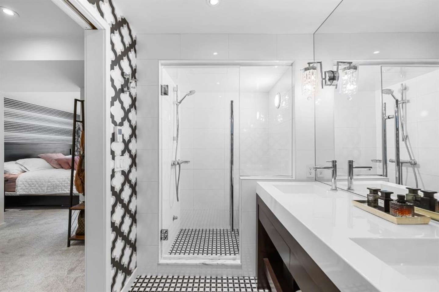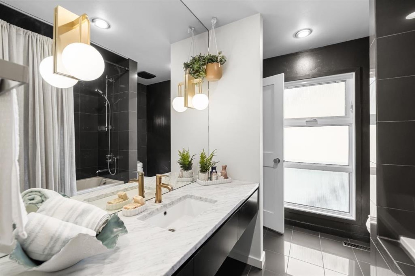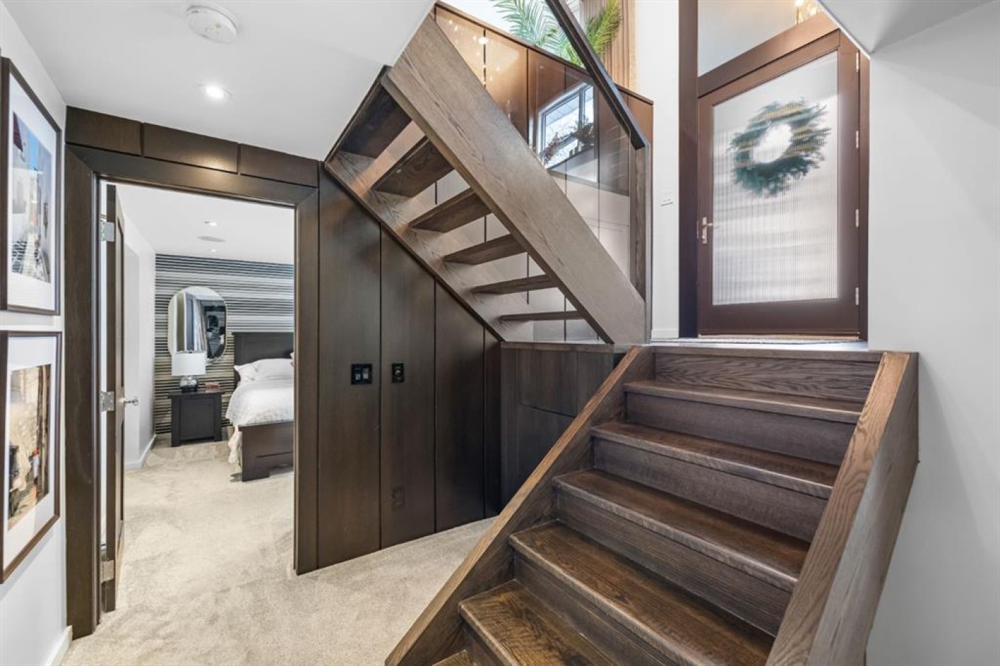 *OPEN HOUSE Jan 10 from 2-4:30 pm* Truly one of a kind, this stunning home has been completely redesigned by acclaimed designer Martine Ast and was featured in Western Living magazine, showcasing a level of finish that rivals a luxury showhome. With over tons of upgrades, including newer and enlarged front windows, the bright upper level offers hardwood flooring and a seamless open-concept layout connecting the kitchen, living, and dining areas. The striking modern kitchen features custom cabinetry, a large working island with eating bar, and top-of-the-line appliances including a Sub-Zero refrigerator, with direct access to a large private south-facing deck. An additional side entry leads to an east-facing covered porch with access to the backyard and garage, while the upper level is completed by an open office area, two spacious bedrooms, and a 4-piece bath. Downstairs, upgraded railings lead to a large recreation room anchored by a custom gas fireplace and featuring a built-in wine rack, while the lower-level primary retreat offers a large dressing room with exceptional closet space and a spa-inspired 4-piece ensuite with heated floors. Additional highlights include custom storage under the stairs and upper landing, a new hot water tank, an oversized, insulated, and heated garage, and RV parking. Ideally located close to schools, parks, and shopping. Do not miss this gem.