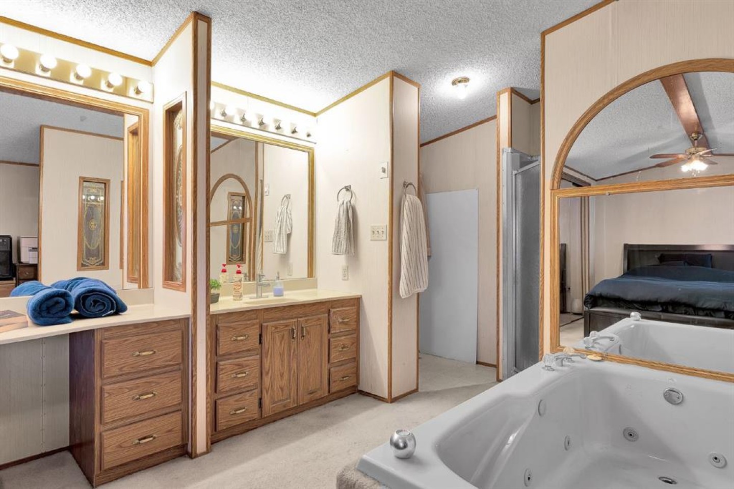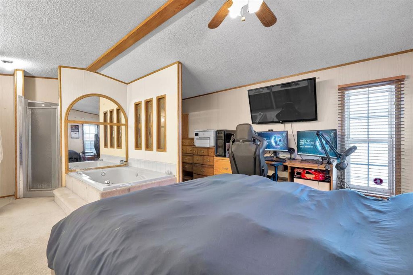 The primary bedroom is a relaxing retreat, featuring a spa-inspired open ensuite design with a two-person jetted soaker tub, separate shower, private toilet area, and dedicated vanity space. Two additional bedrooms are located at the opposite site of the home along with full main bathroom that provides private and comfortable space for family or guests.