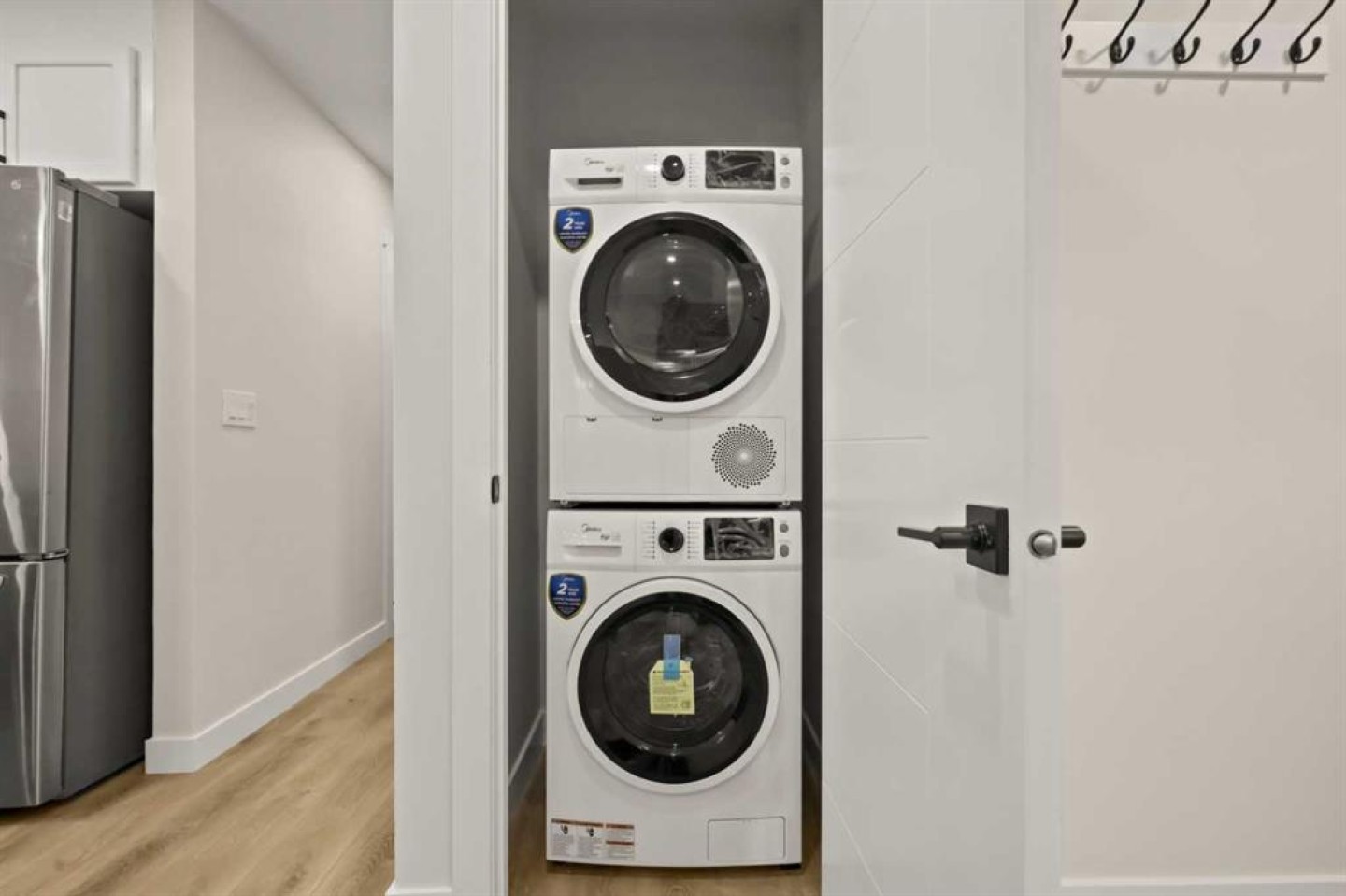 Dishwasher, Electric Stove, Microwave Hood Fan, Refrigerator, Washer/Dryer Stacked