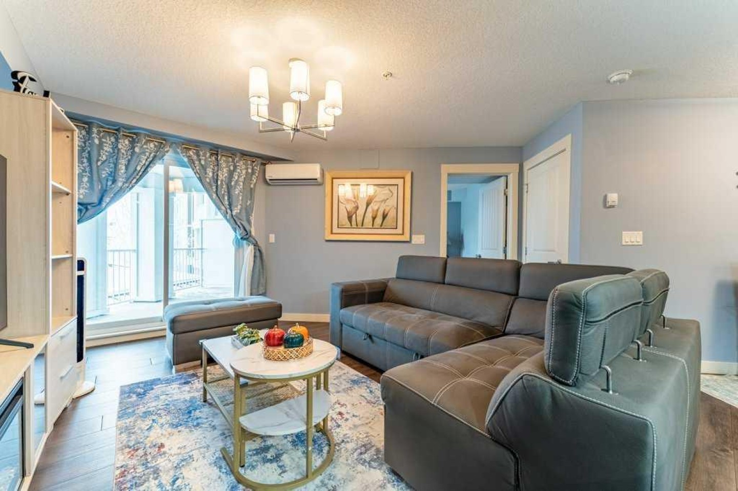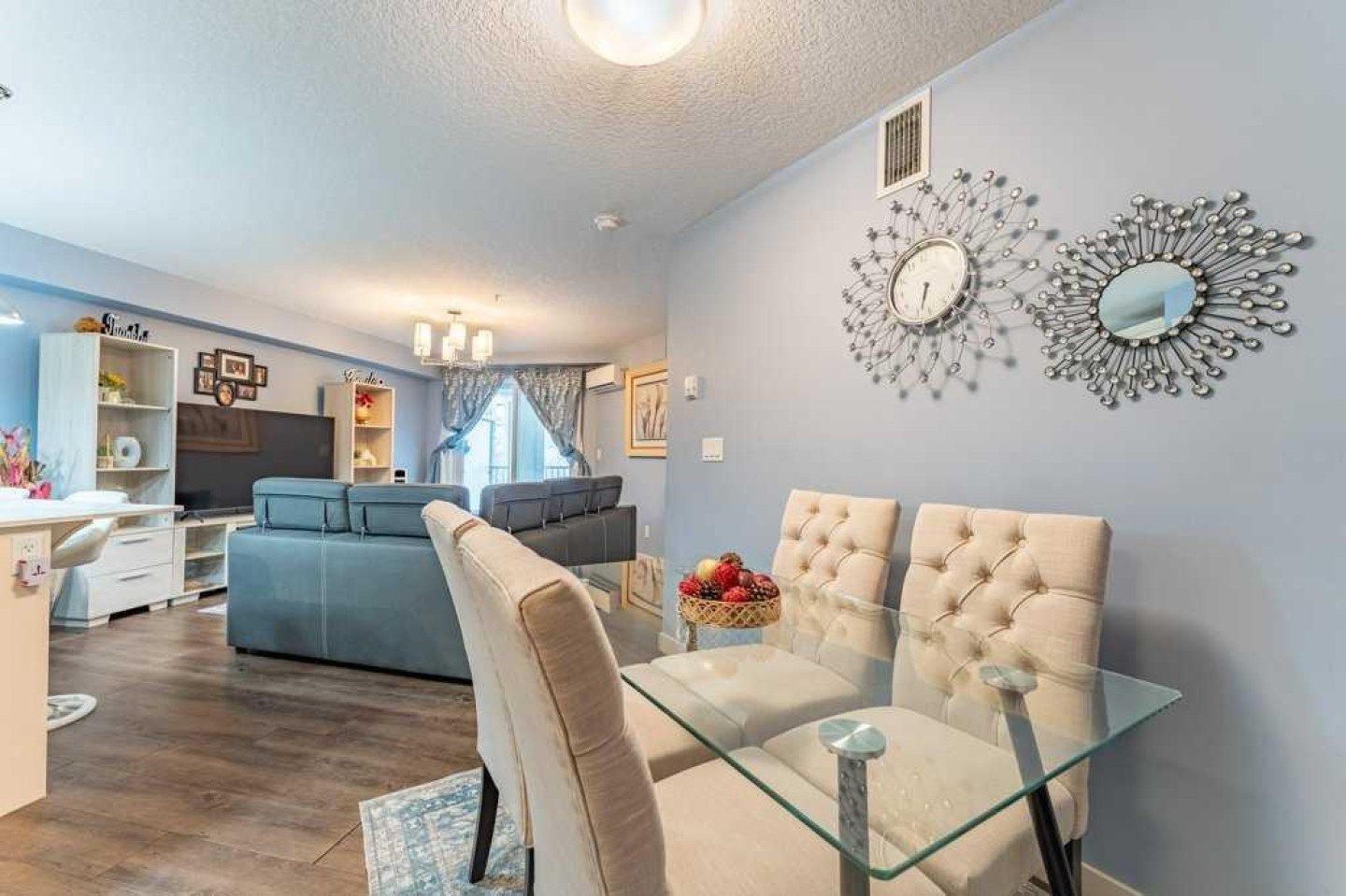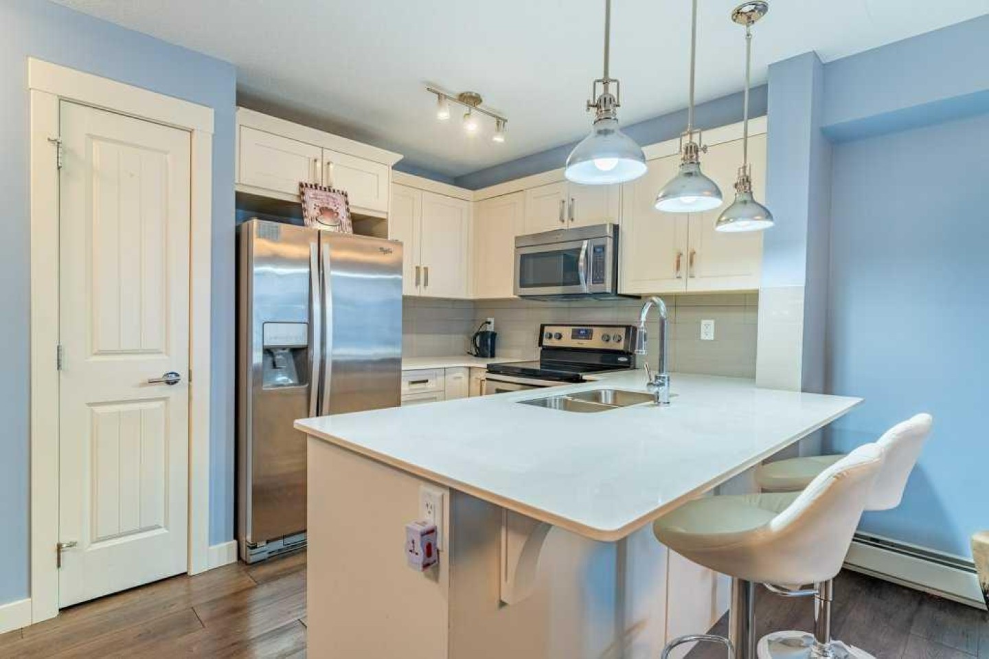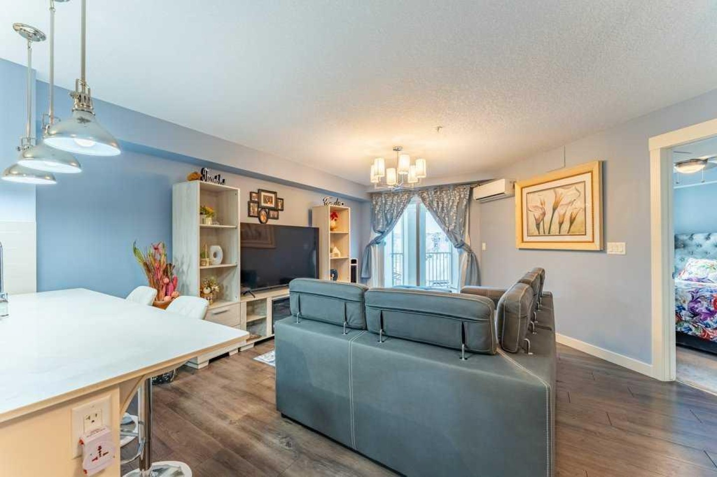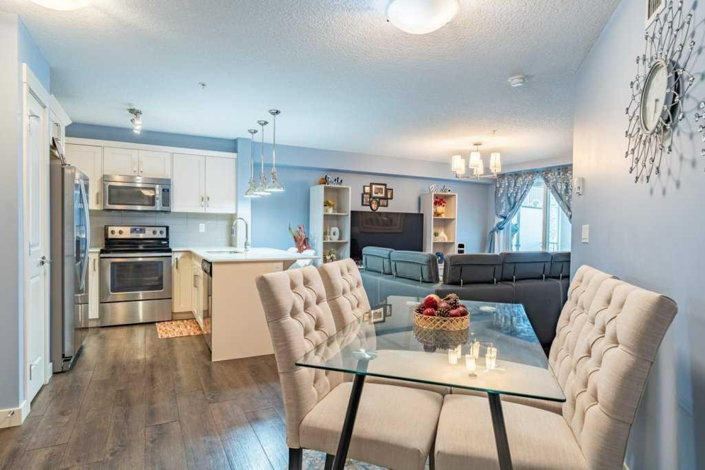 The modern kitchen offers ample cabinetry, stainless steel appliances, quartz countertops, and a functional peninsula with breakfast bar, seamlessly overlooking the dining and living areas—perfect for both everyday living and entertaining. The living room opens directly onto an extra-large private balcony, extending your living space outdoors.