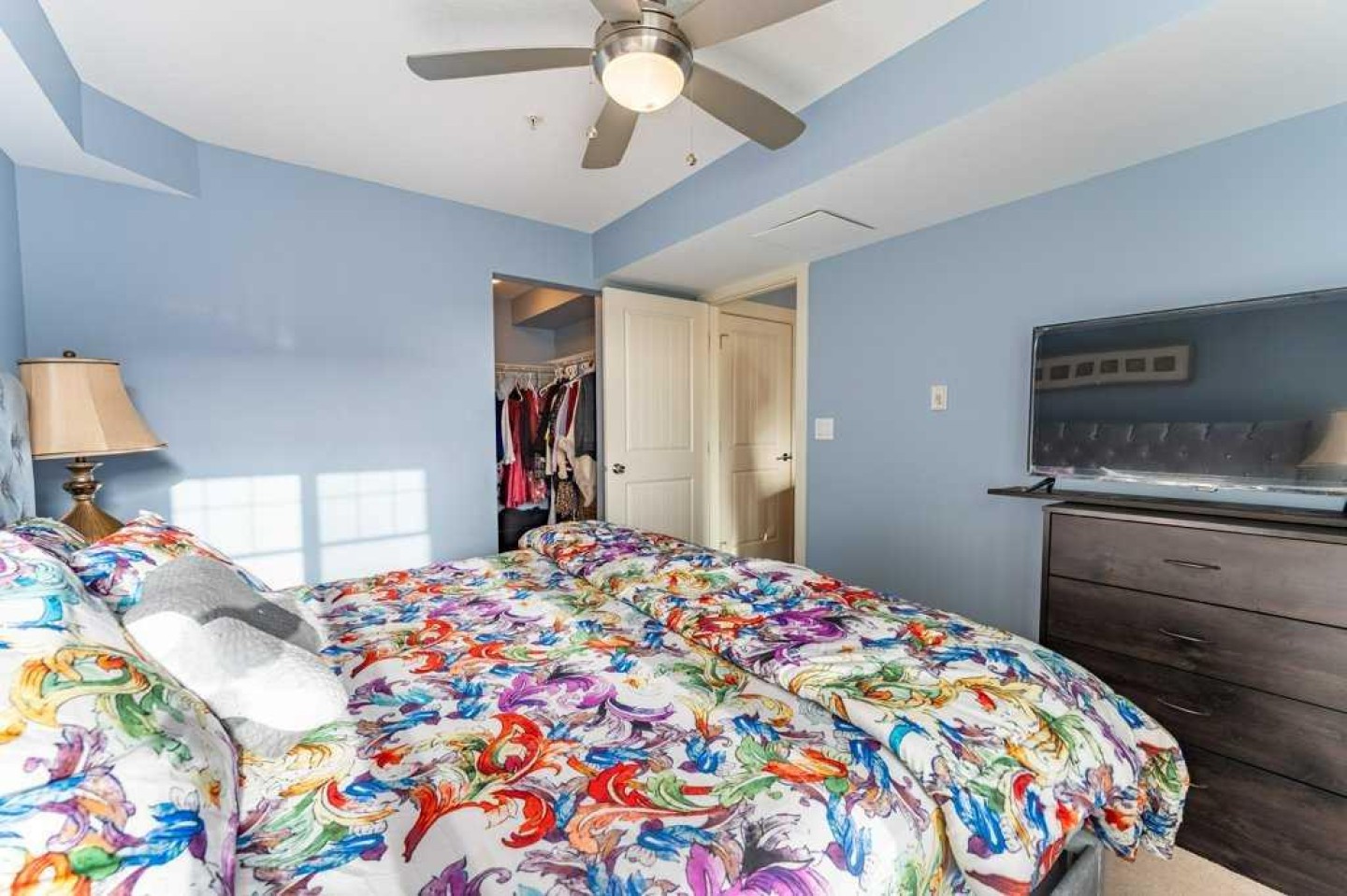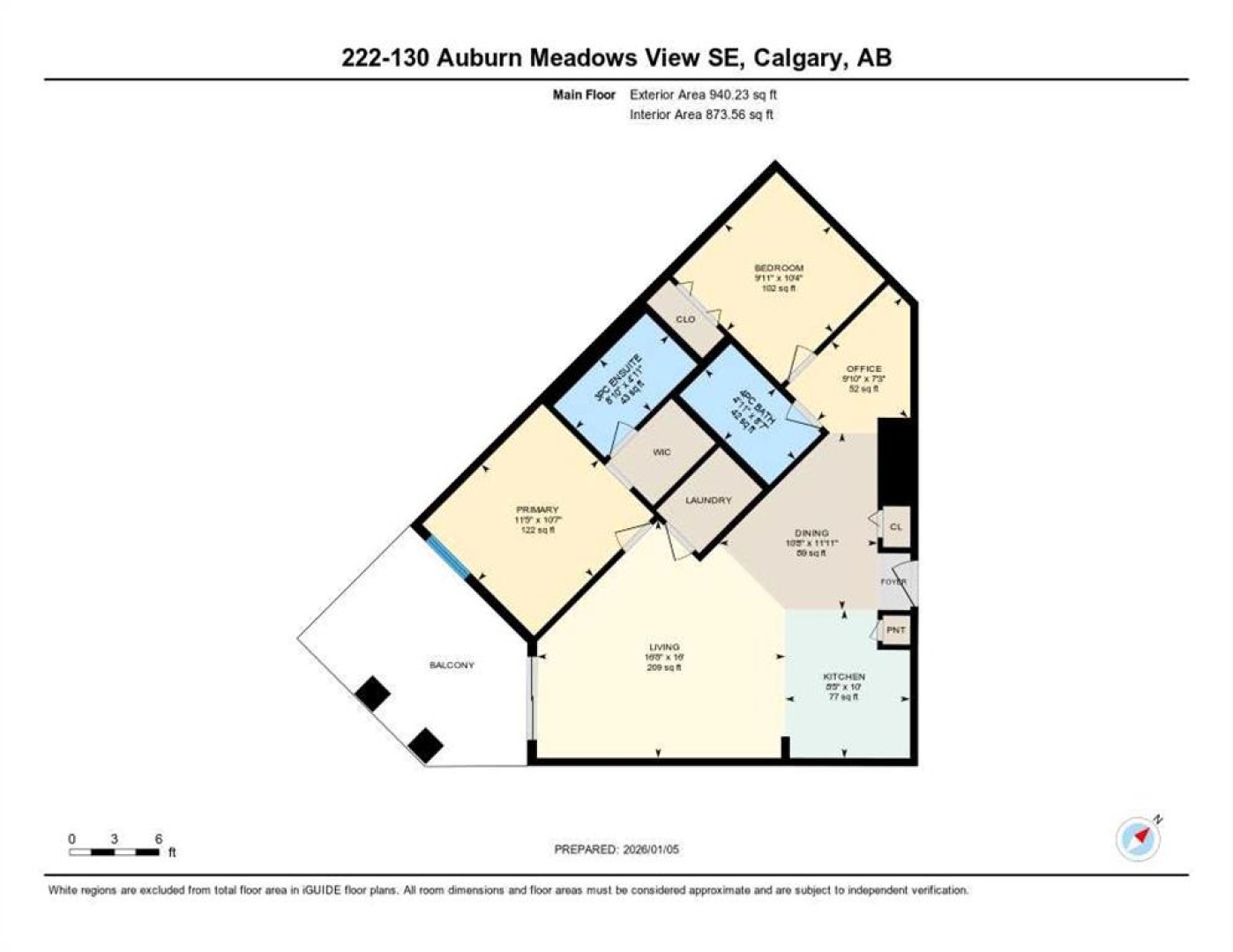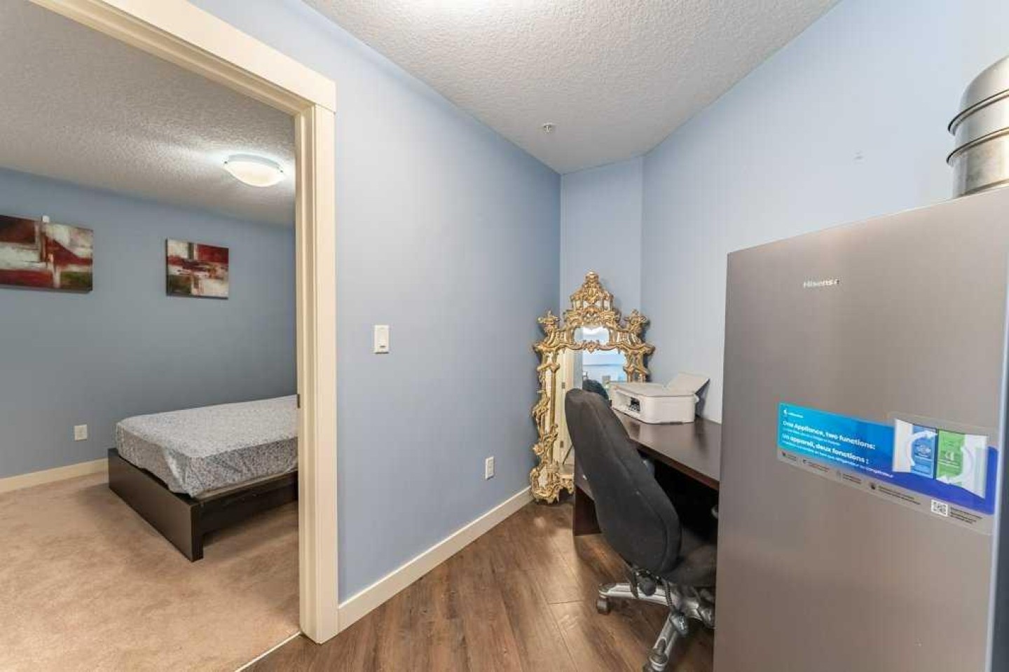 The primary bedroom includes a walk-in closet and a 3-piece ensuite with stand-up shower. A generously sized second bedroom, located next to the main bath, is ideal for guests or a roommate. A versatile den—perfect for a home office—along with in-suite laundry completes this well-appointed home.