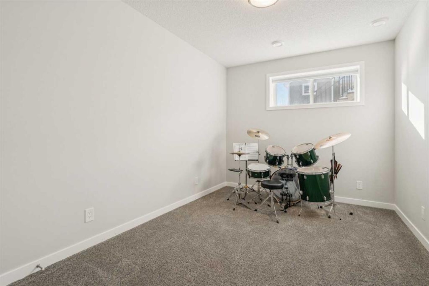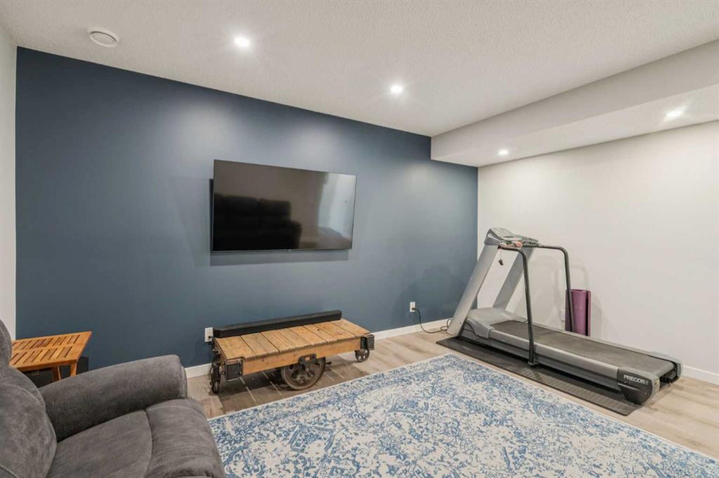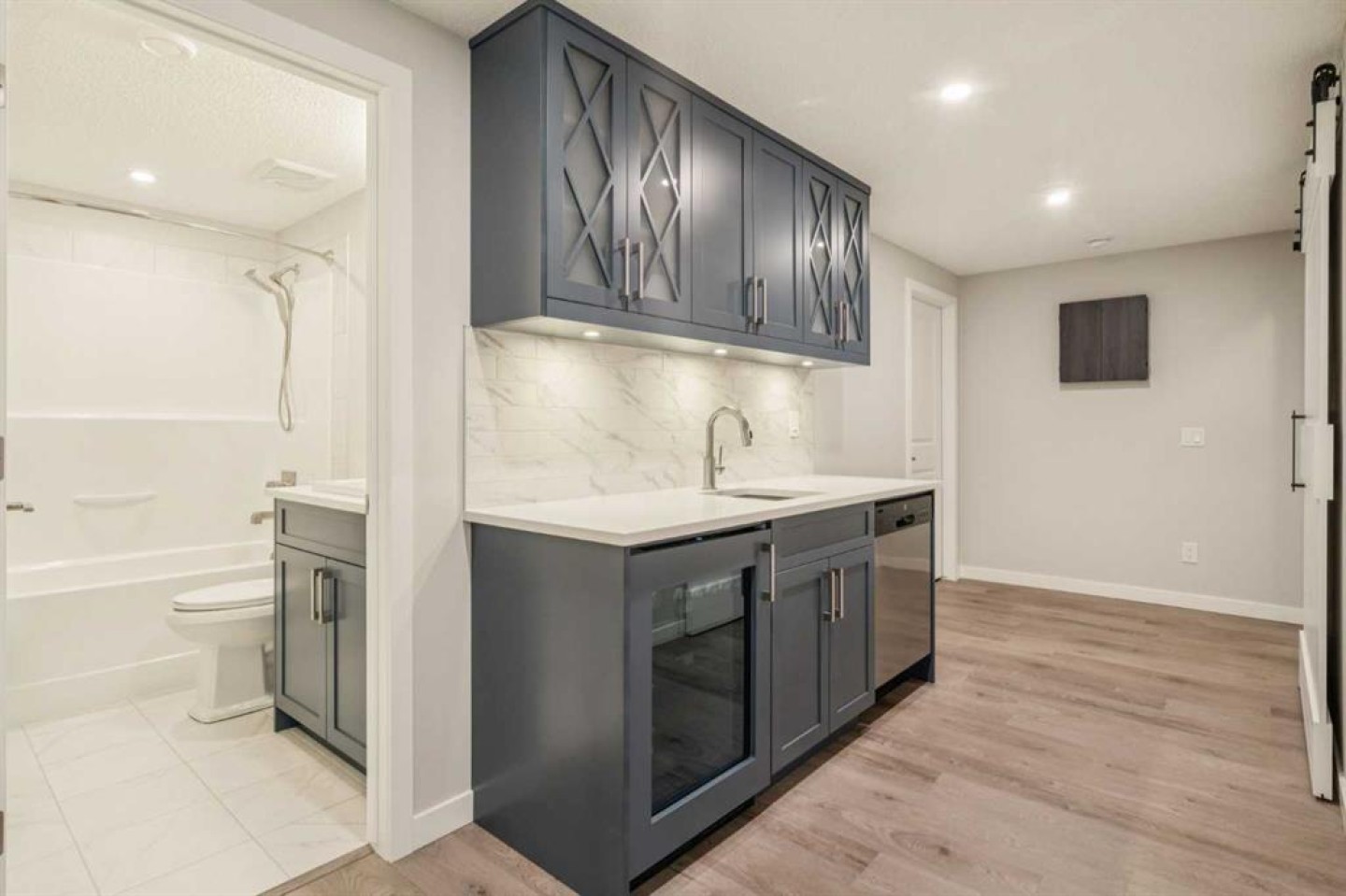 The professionally FINISHED BASEMENT expands your living space with a stylish TV wall, mini fridge, dishwasher, barn door accents, and ample room to relax or entertain.