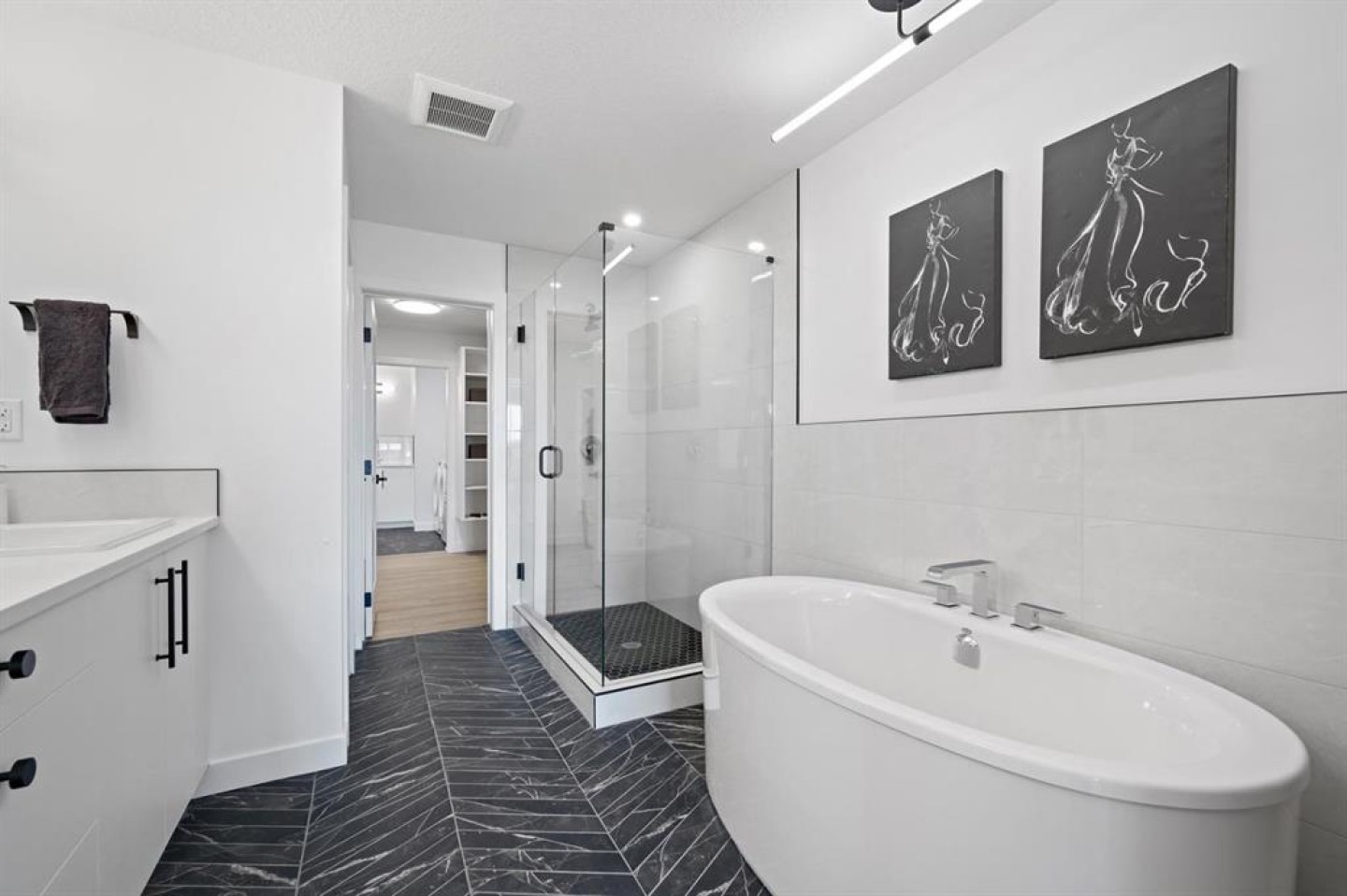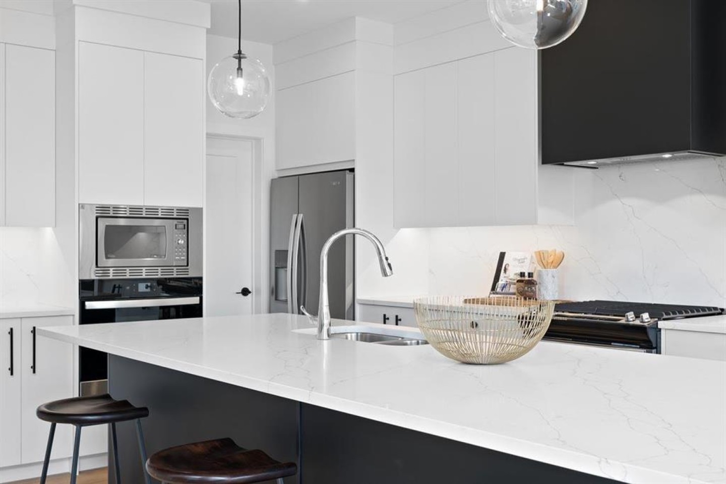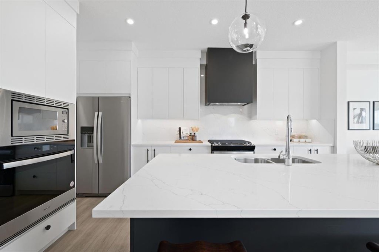 Upstairs, the primary retreat is defined by a tray ceiling, a spa-inspired 5-piece ensuite, and a generous walk-in closet enhanced with custom built-in organizers. Two additional bedrooms—each featuring built-in closet systems—are complemented by a central bonus room, a modern 4-piece bath, and convenient upper-level laundry, offering both comfort and functionality for today’s lifestyles.