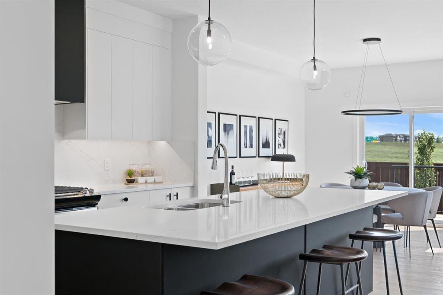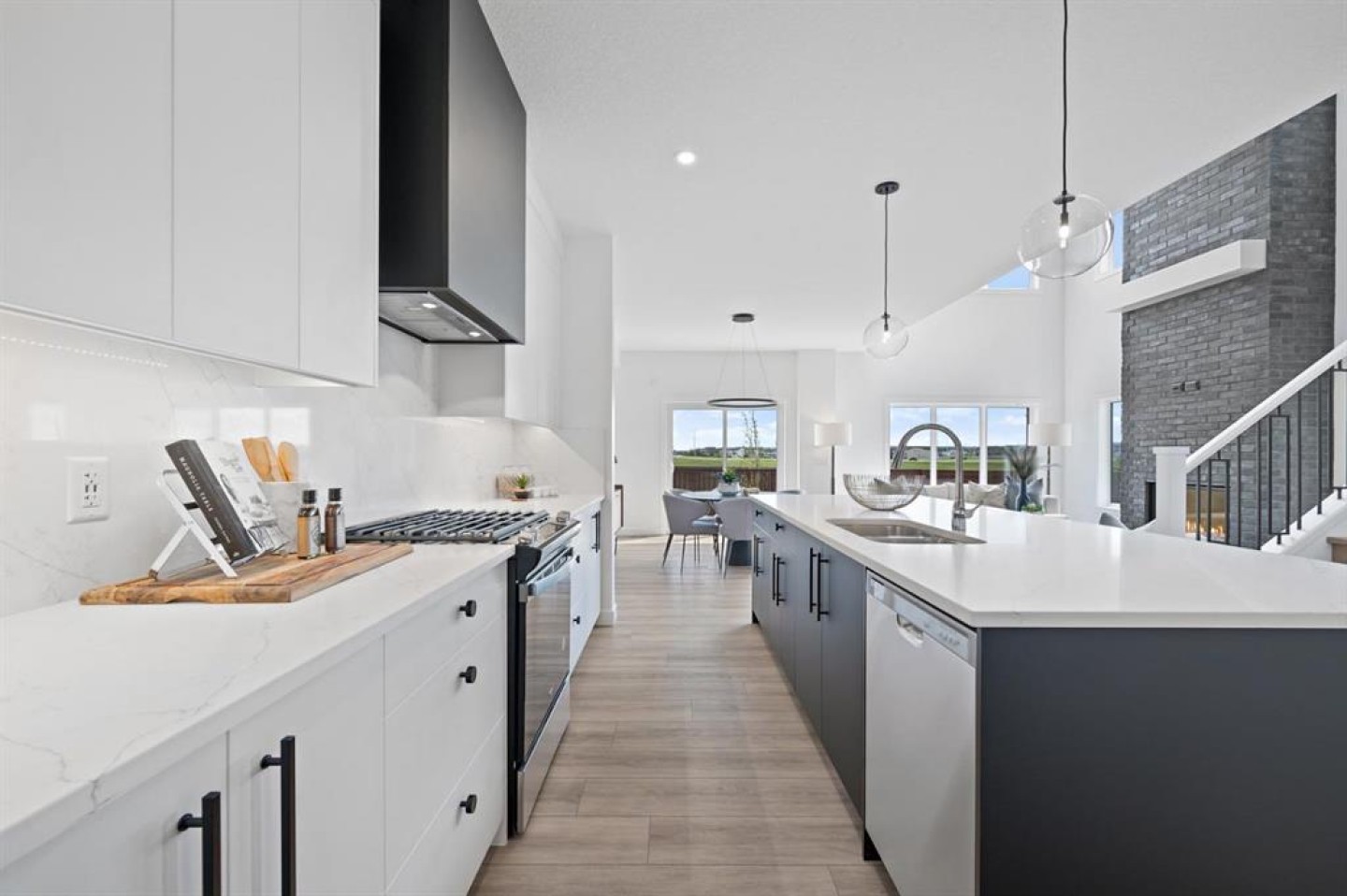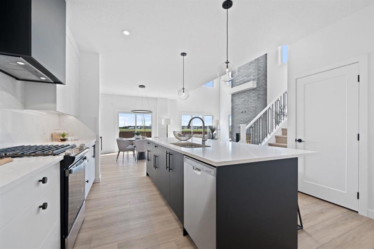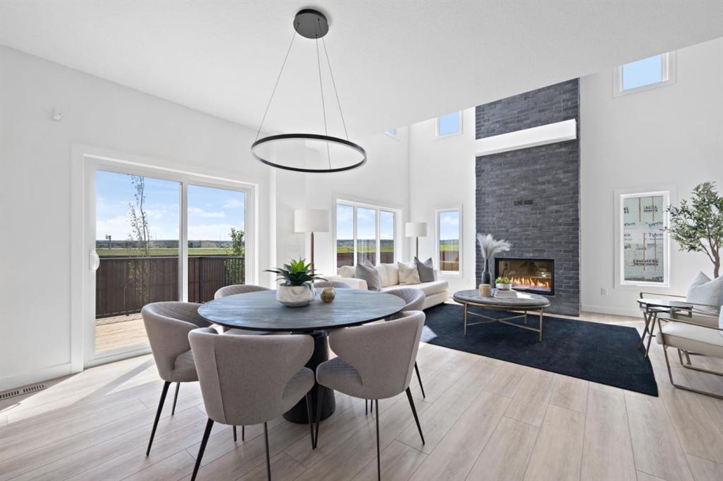 The open-concept main floor is anchored by a chef-inspired kitchen featuring full-height cabinetry with soft-close doors and drawers, quartz countertops, a premium appliance package, and a walk-in pantry complete with custom built-in shelving for effortless organization. The kitchen flows seamlessly into the sun-filled great room, where soaring two-story ceilings enhance the sense of space and a striking floor-to-ceiling brick fireplace creates a warm yet architectural focal point—perfectly suited for both intimate evenings and elegant entertaining.