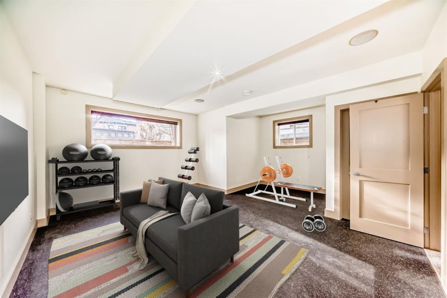 OPEN HOUSE SATURDAY & SUNDAY NOON - 3pm. Experience the perfect blend of striking design, sunshine-filled spaces, &unbeatable urban convenience in this exceptional residence located in the heart of the vibrant Marda Loop District. Instantly captivating, the modern corrugated metal exterior & beautifully landscaped front yard deliver standout curb appeal in this highly sought-after neighbourhood. Step inside with an airy open-concept layout, gleaming re-finished satin hardwood floors, & fresh contemporary paint throughout. The sunny living room makes a great impression with its soaring 18-foot open-to-below ceiling and expansive south-facing windows. Cozy evenings await around the gas fireplace, accented by a stylish metal feature wall that echoes the home’s exterior design. The chef-inspired kitchen is both sleek & functional, featuring a generous island with new pendant lighting, undermount sink, filtered water, quartz countertops, stainless steel appliances, & a gas cooktop. Endless cabinetry and abundant seating make this space ideal for entertaining, whether hosting intimate dinners or lively gatherings. The adjacent dining room with contemporary lighting fixture is bathed in natural light and opens directly to a private courtyard patio—an inviting outdoor retreat tucked between the home and the convenient double garage. A chic powder room nearby adds a playful touch with its statement bowl-mounted sink. An open-riser staircase draws you upward, flooding the home with natural light. The second level offers two spacious bedrooms, along with a versatile loft & den—perfect for a home office, reading nook, or family lounge. A dedicated laundry room with sink adds everyday ease. The entire third level is a true showstopper, designed as a private primary retreat with an additional bonus space & wet bar, both finished with new luxury vinyl plank flooring. Step outside to the spectacular south-facing rooftop patio & take in sweeping Rocky Mountain views. The primary bedroom is thoughtfully appointed with custom closet organizers & a spa-like ensuite featuring a built-in tiled tub, dual sinks, makeup vanity, in-floor heating, and a glass-enclosed shower with bench and niche. The fully finished LOWER LEVEL expands your living space with 9-foot ceilings, radiant in-floor heating, & a large recreation area complete with custom rubber gym flooring and full height wall mirror. Thoughtful upgrades throughout the home, rigid styrofoam insulation & gravel on the torch-on roof, water softener, , built-in speakers, Toto toilets, undermount sinks, & a tankless NAVIEN hot water system. All west & north facing windows were replaced with UV-protected triple-glazed windows. Rebuilt furnace in 2022. Over $100,000 worth of upgrades over the past five years. Two outdoor spaces, this home delivers privacy, comfort, & exceptional style. With over 3,500 sq. ft. of livable space, it is ideally located in the popular community of Marda Loop. Some of the photos have been virtually staged.