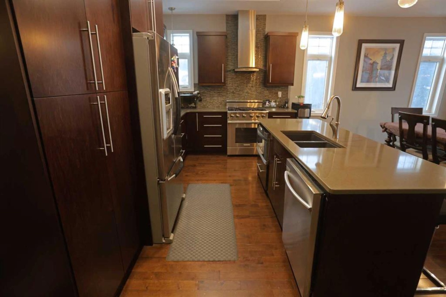 The open concept living and dining areas are flooded with natural light from multiple west facing windows, creating an inviting space to relax or entertain while enjoying the stunning views. The chef’s kitchen is equipped with high end finishes, a large island, quartz countertops, and stainless steel appliances, making it as functional as it is stylish.