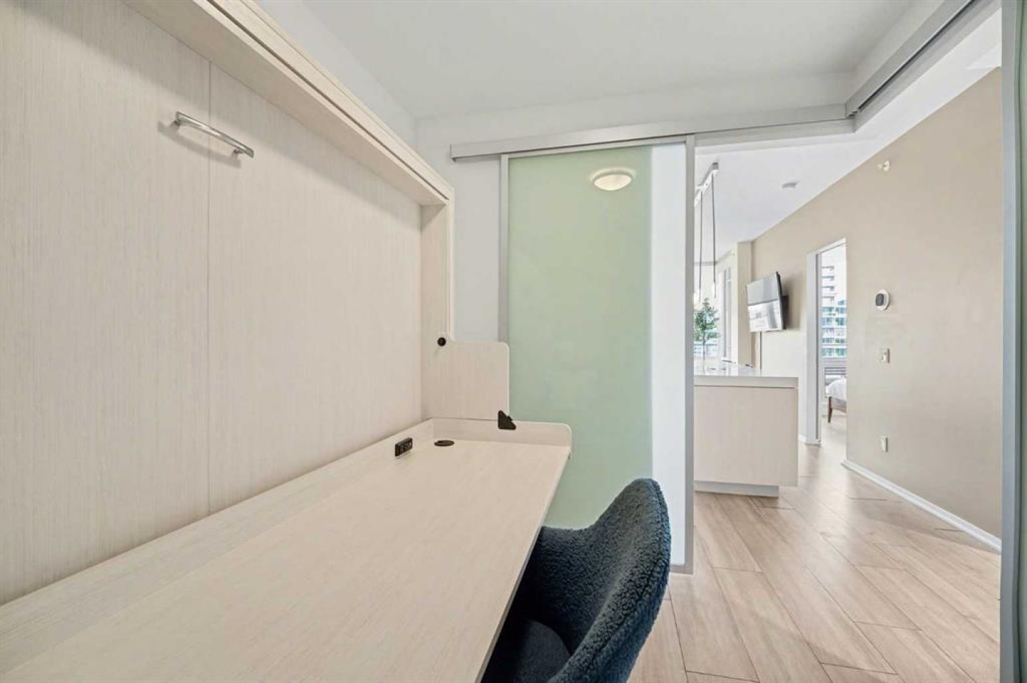 The primary bedroom is spacious and inviting, while the versatile den features a built in Murphy bed, making it ideal for overnight guests, a home office, or a flexible second sleeping area. The well appointed three piece bathroom includes a deep soaker tub and a practical layout that complements everyday living. The open concept design flows seamlessly through the kitchen, dining, and living areas, finished with sleek modern touches, in suite laundry, and air conditioning for year round comfort. Step outside to the covered balcony and enjoy elevated city views in every season.