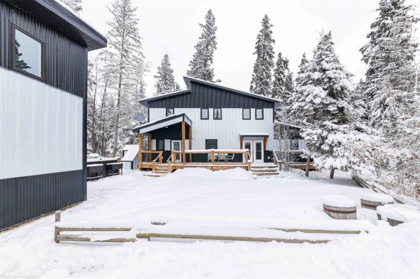 Brightsand Lake, Saskatchewan year-round residence. This 4-bed 3-bath all-season lake house was built in 2020. The stunning 2-storey home is situated in a cul-de-sac in the Sandy Point development. A short walk through the stands of mature spruce trees takes you to the Brightsand Lake shore line where you can swim, boat, fish or simply enjoy the spectacular lake without the crowds. The main level has an open concept kitchen, living and dining area. The kitchen features a large island with seating, stainless steel appliances including a dual oven, soft close cupboards and both pendant and pot lighting. The adjacent dining area is a large space, great for family gatherings with convenient access to the front deck. The living room boasts a vaulted ceiling and lots of windows that offer beautiful views. The room is accented by a cozy wood burning stove. The main level primary suite has a large closet and a 4-pc ensuite. Finishing the main level is a 3-pc powder room, laundry room and utility room. Notice the large closet with bench seating conveniently close to the main entry. The upper floor hosts three spacious bedrooms and a full 4-pc bathroom. White washed pine ceilings feature throughout the home and add to the cabin feel. There is in-floor heating on both levels. The front and back decks offer great outdoor space to enjoy the surroundings. Outside is a single detached garage, a shed, bunkhouse and wood shed. The metal siding and metal roofing on both the home and garage are a plus. The satellite dishes and cell phone booster stay. Yes, there is an RV plug. Water is from a well. Septic is a tank with Bluetooth alarm. Call to view this beautiful Brightsand Lake property! The seller/builder of this property will go over the systems of the home to ensure a smooth transition for the next owner. Also note: Seller will consider lake lot(s) or acreage as partial payment.