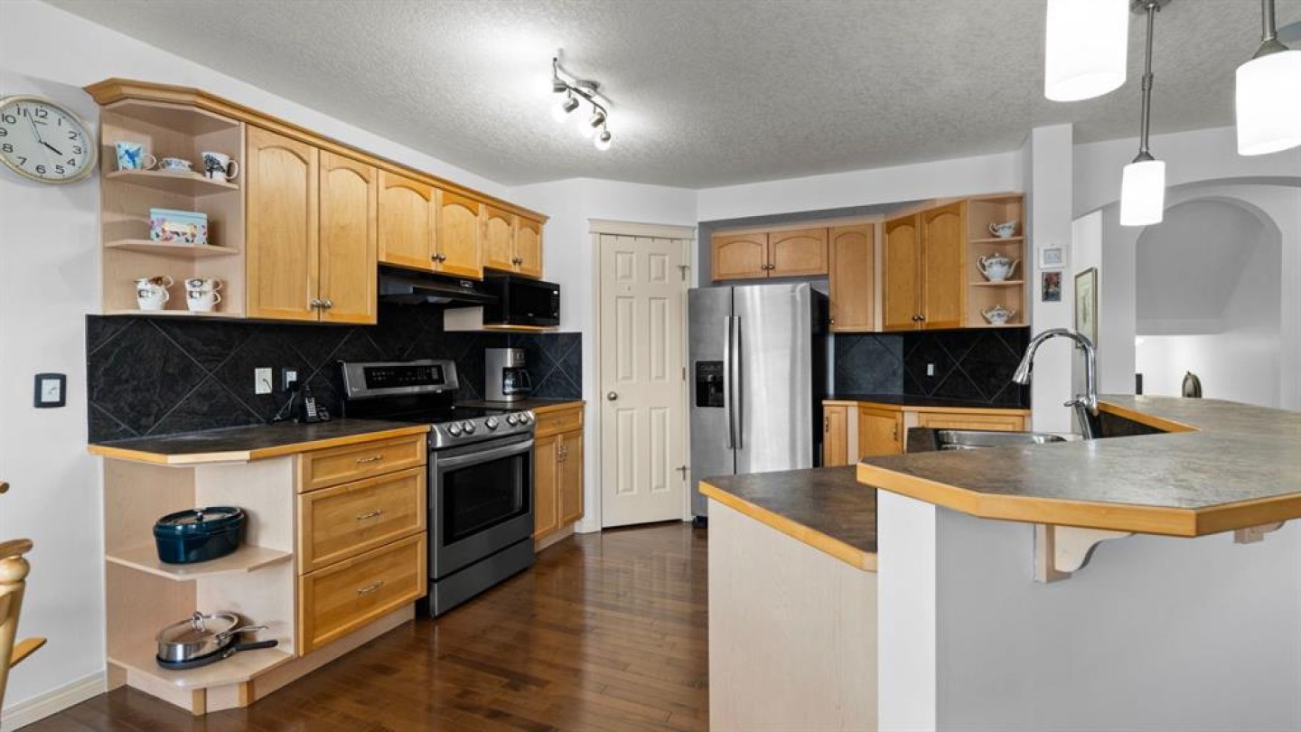 Welcome to this meticulously maintained home located on a quiet street WITH NO ONE BEHIND you! As you approach you will appreciate the EXTRA WIDE LOT, impressive curb appeal, NEWER ROOF (only 2 years old), NEW GARAGE DOOR, and UPDATED SIDING. The well thought out layout features gleaming hardwood floors, knock down ceilings, built in speakers, timeless curved arch ways, and a freshly painted interior. The chef inspired kitchen is a focal point with solid oak cabinets, Stainless Steel appliances, tile backsplash, plenty of counter space, and a corner pantry for additional storage. A large island overlooks the spacious living room, showcasing a gas fireplace adding to the ambience and warmth of the space. Adjacent to the kitchen is the bright dining room with oversized windows that draw in the natural light. This provides direct access to the full width deck overlooking the sports field and a BBQ gas line for your convenience. A tucked away half bath ensures privacy, along with a functional laundry/mud room. Upstairs you will find 9’ ceilings and the bonus room on its own separate floor. Perfect for family movie nights or a dedicated play area. On the opposite side is the expansive primary. This is a true sanctuary with stunning VIEWS, plenty of windows, a large ensuite with dual sinks, an oversized shower with dual shower heads and a walk-in closet! Additionally, this level includes two well sized bedrooms and a 4pc main bath. The walkout basement is filled with natural light, thanks to its extra-large windows. The sizable rec room opens directly to a composite deck equipped with a gas line and leading to the expansive backyard. Completing this lower level is a fourth bedroom and an updated 3-piece bath including a fully tiled shower and elegant stone counters. Ideally located within walking distance to a wealth of amenities including shopping, dining, three schools, public transit, and with quick access to Stoney and MacLeod Trail. This home won’t last schedule your private showing today.