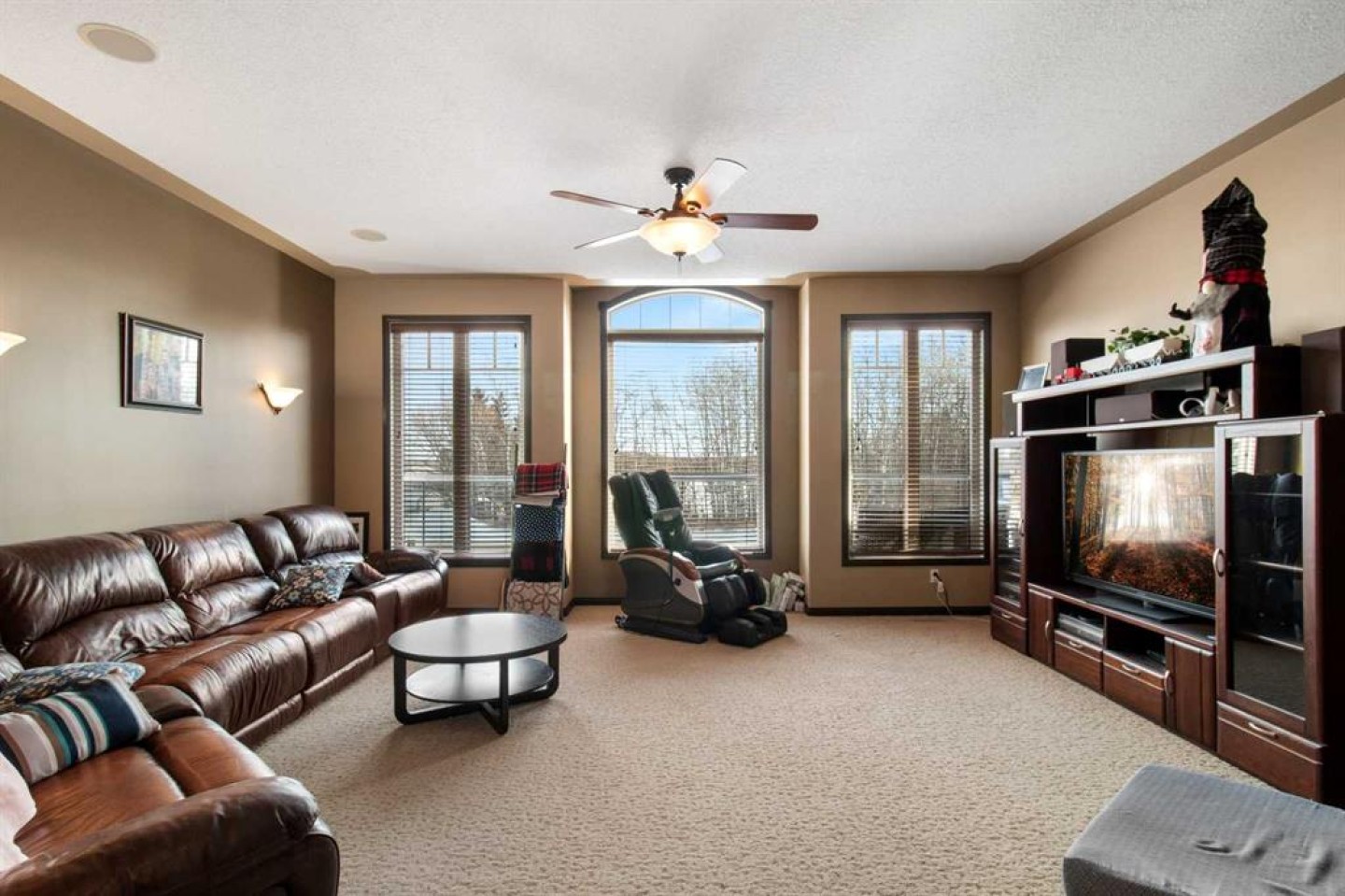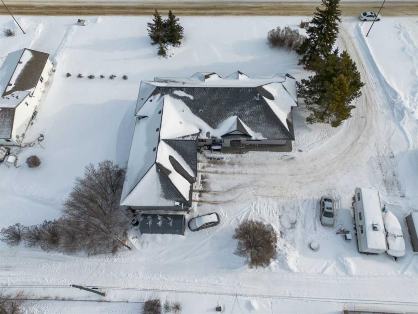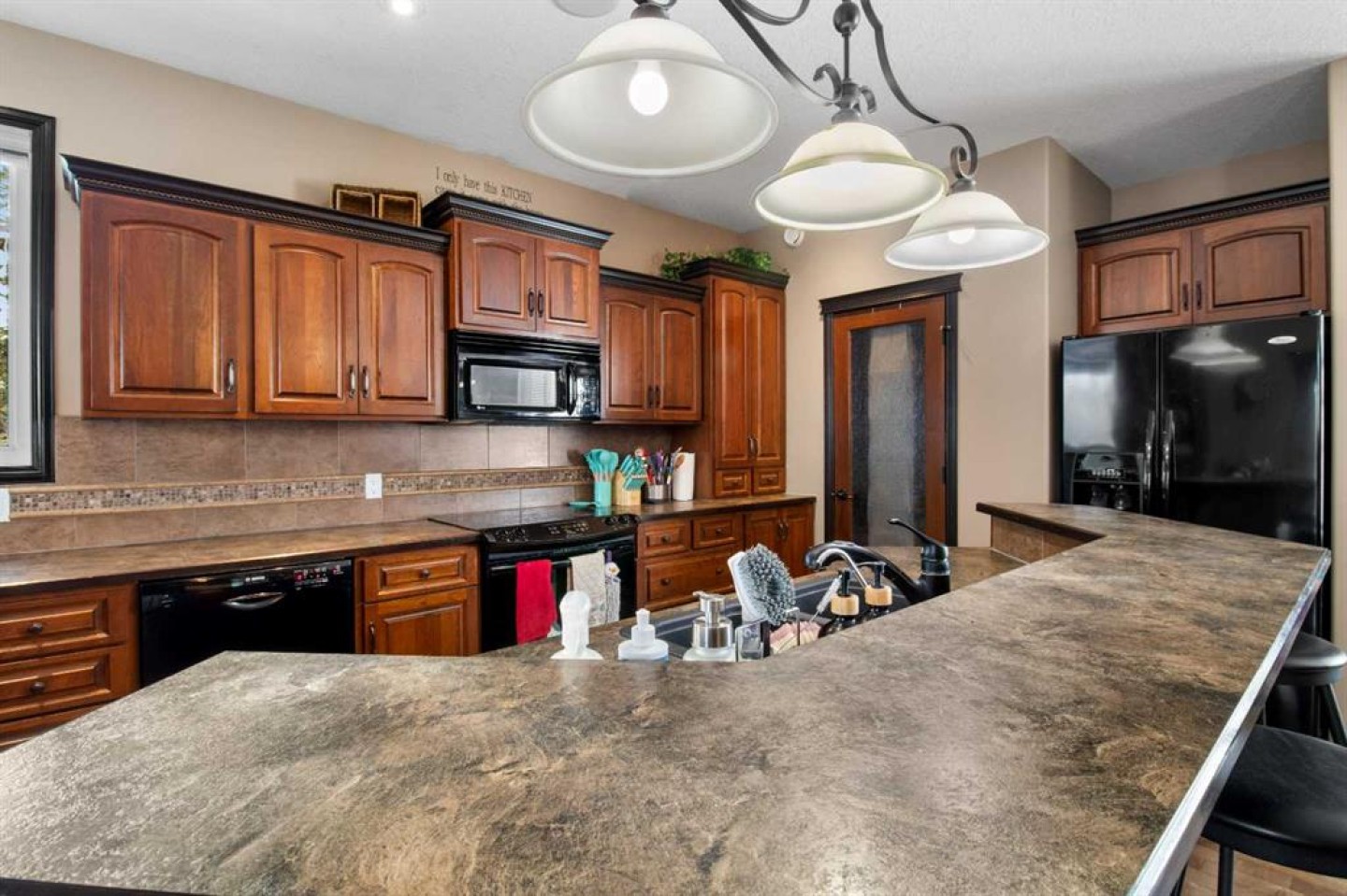 Welcome to this beautiful custom built home on just over half an acre of property. Coming in through the foyer brings you to a large kitchen and dining room area with corner pantry, center island with sinks and plenty of storage underneath, plenty of countertop and loads of cabinets. Strolling down the hall we will find a sunken living room with a double sided gas fireplace and large windows to capture the sunlight in the mornings. A little farther brings us to a large primary bedroom with an ensuite like no other. Double vanity sinks, shower, a large relaxing tub and a huge walk in closet. Another bedroom, a 2 piece bathroom and full laundry room complete the main floor. As well as the Entrance to the 1500 + sq ft heated garage that has room for 4 vehicles, toys, tools and storage, as well as a sitting area to gather with the neighbors. Upstairs takes us to another bedroom / office, with a walk in closet, a four piece bathroom and a family room. The partially finished basement with underfloor heat has been framed and wired for future finishing of bedrooms and family room but used mainly for storage at the moment. The 18x20 covered deck off the kitchen, with storage underneath, has been home to many calm nights of socializing with friends and family while listening to the birds and watching the wildlife walk through town. Very peaceful acreage type living but in town. This home is tied into water from the town, has its own septic tank and field, RV parking out back with the RV plug to power up your unit. For future building there is also power, water and another septic tank in place for a future shop building. Recent upgrades include a Hot water Tank 3 years ago, the furnace for the main floor was replaced 3 years ago but furnace for the upstairs is original. Come to Delburne and view this beautiful home that is a block from the golf course.