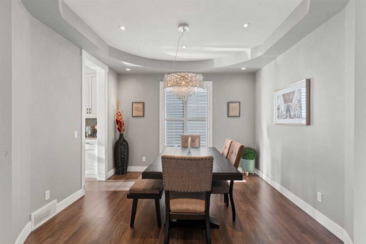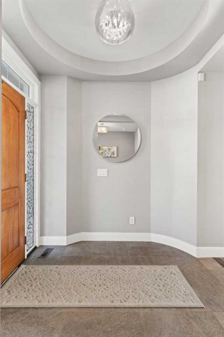 The main level showcases vaulted ceilings, expansive windows with Hunter Douglas shutters, engineered laminate flooring, knockdown ceilings, upgraded lighting, and elegant spindle-railed staircases. A private den provides the ideal home office, while the impressive formal dining room easily accommodates large gatherings and is highlighted by a striking chandelier.