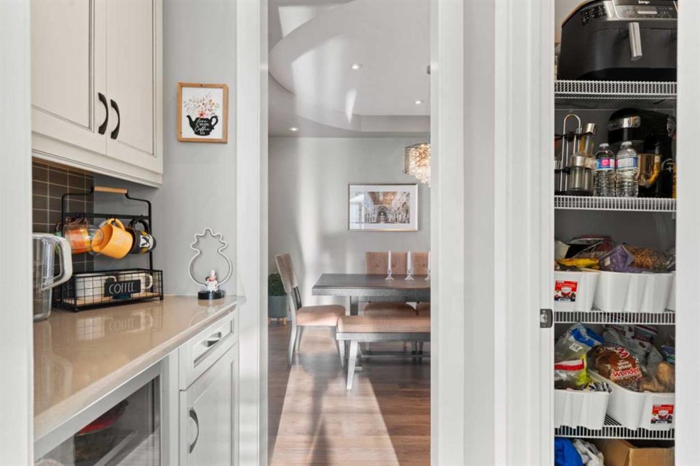 The open-concept kitchen is a chef’s dream, featuring a massive quartz island, built-in stainless steel appliances, pendant lighting, a coffee bar, spacious pantry, and a casual dining area. The inviting living room is anchored by a floor-to-ceiling stone gas fireplace, creating a warm and stylish focal point. Step outside to the oversized deck and enjoy peaceful views of the pond and green space, perfect for relaxing evenings and entertaining.