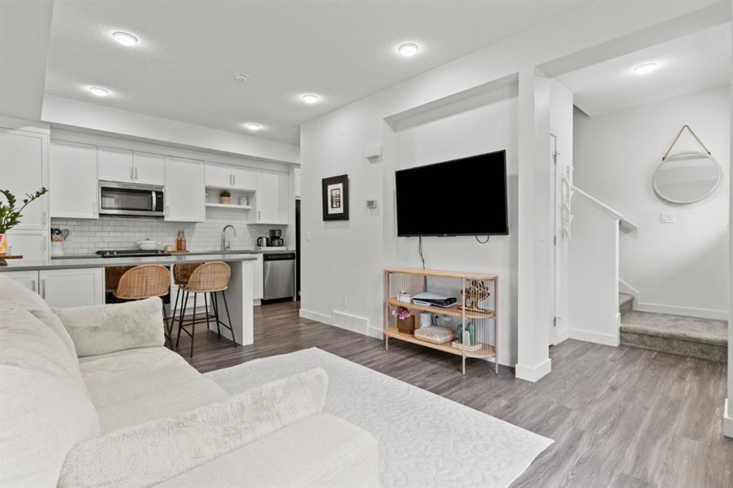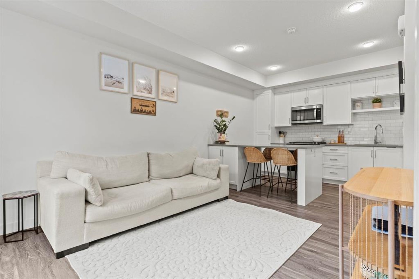Welcome to this beautifully maintained 2-storey condo in the sought-after community of Walden. Offering a rare combination of modern design, outdoor space, and everyday convenience across three fully finished levels. The bright main floor is filled with natural light, creating a warm and welcoming atmosphere throughout the open-concept living areas. The contemporary kitchen is both stylish and functional, featuring crisp white cabinetry, timeless subway tile backsplash, stainless steel appliances, and an upgraded gas stove—perfect for those who love to cook. A central island provides space for casual dining and entertaining, while durable flooring and a convenient main-floor powder room complete this level. Upstairs, you’ll find two well-proportioned bedrooms, including a comfortable primary retreat with a walk-in closet and 3 piece ensuite. The second bedroom is ideal for guests, a home office, or family use. A sleek, modern bathroom with a glass-enclosed shower and clean finishes offers a calm and functional space to start and end your day. The fully developed basement adds exceptional versatility with an additional bedroom with walk-in closet, and a full bathroom perfect for guests, extended family, or a private work-from-home setup. A dedicated laundry and mechanical area provides excellent storage and everyday convenience. Enjoy the outdoors with your own front yard and spacious front patio ideal for summer evenings, BBQs, and outdoor seating. This home also includes a titled parking stall for added convenience. Set in a quiet, friendly neighbourhood, this location offers outstanding walkability—just a 5-minute walk to Legacy Plaza, where you’ll find Sobeys, Shoppers Drug Mart, Winners, restaurants, and everyday essentials. With nearby parks, pathways, and quick access to Macleod Trail and Stoney Trail, this home blends peaceful living with unmatched accessibility. A stylish, move-in-ready condo offering bright living spaces, flexible layout, outdoor enjoyment, and one of south Calgary’s most convenient locations—this is a home that truly has it all.