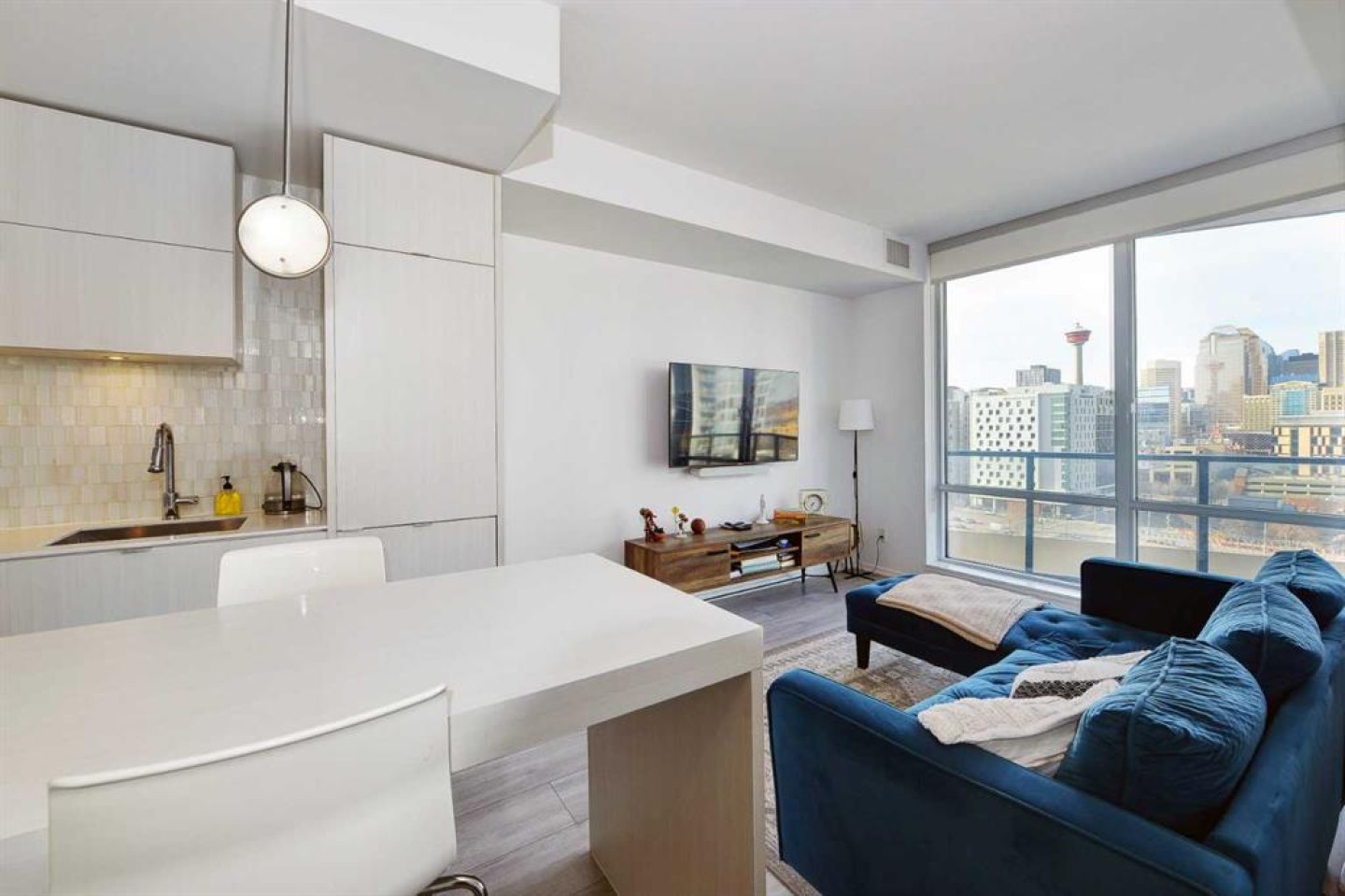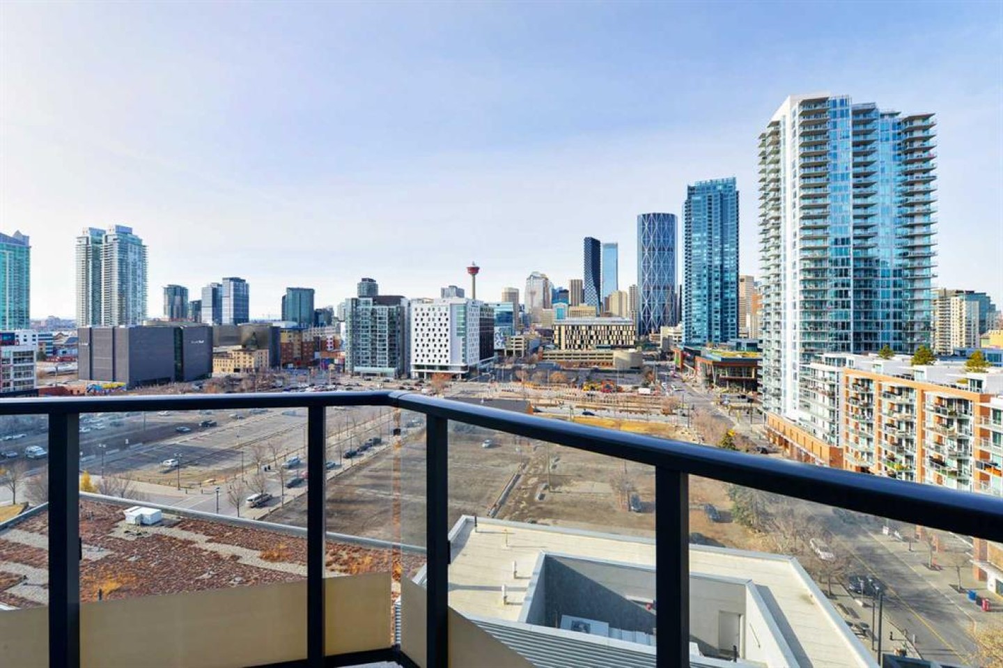 Welcome to this beautifully designed 1-bedroom plus den condo in The Verve, one of East Village’s most desirable buildings. Perfectly positioned on the 11th floor, this home offers bright, modern living with stunning west views of the downtown skyline. The open floor plan features 9-foot ceilings and floor-to-ceiling windows that fill the space with natural light. The sleek, contemporary kitchen features quartz countertops, a central island with a breakfast bar, stainless steel appliances, an electric cooktop, a built-in oven, and a stylish glass tile backsplash, an ideal setup for cooking or hosting friends. The living room offers the perfect place to unwind at the end of the day, with easy access to your private west balcony, an incredible spot to enjoy sunsets and warm summer evenings. The large primary bedroom provides a quiet retreat, while the spacious den offers the perfect home office, guest room or flex space. A well-appointed 4-piece bathroom and convenient in-suite laundry complete the thoughtful layout. Stay comfortable year-round with central air conditioning, and enjoy the convenience of titled underground parking. Residents of The Verve enjoy access to premium amenities, including a fitness centre, guest suite, party room, rooftop patio, and recreation lounge. This unbeatable location is steps from the Riverwalk Pathway system, Prince’s Island Park, Studio Bell, and the Central Library. Superstore, Bow Valley College, and countless shops and cafés are all just minutes away. Whether you're a professional, first-time buyer, or investor seeking vibrant urban living, this home offers an exceptional opportunity. Don’t miss your chance, book your showing today!