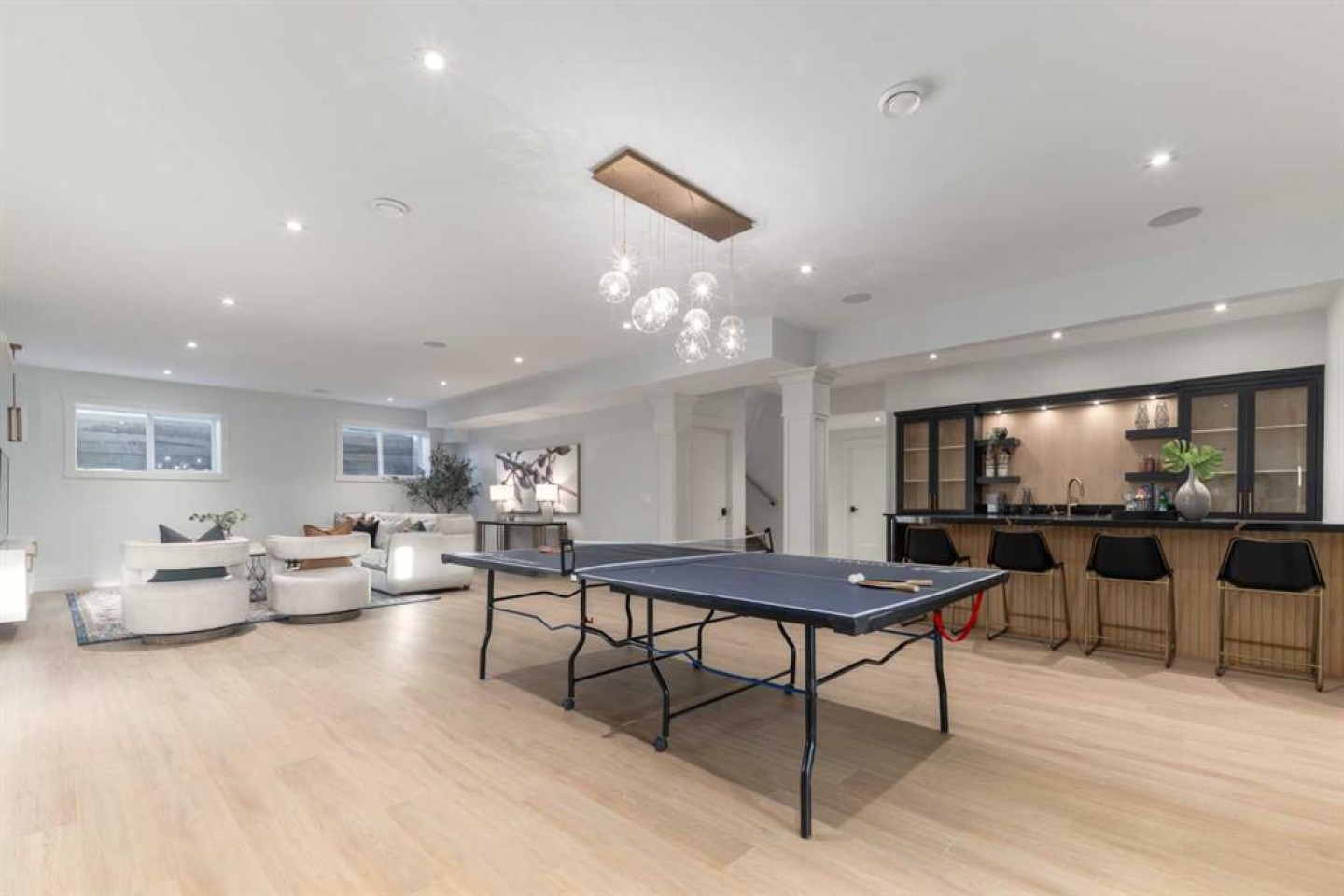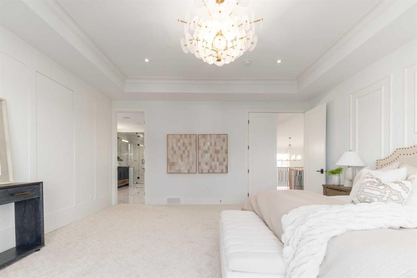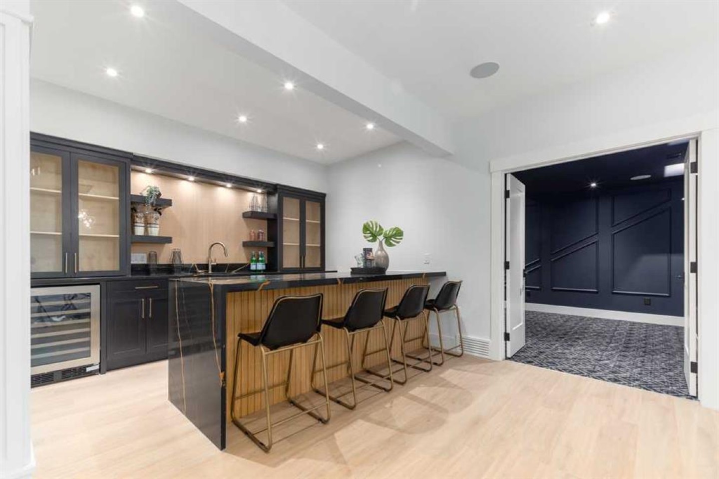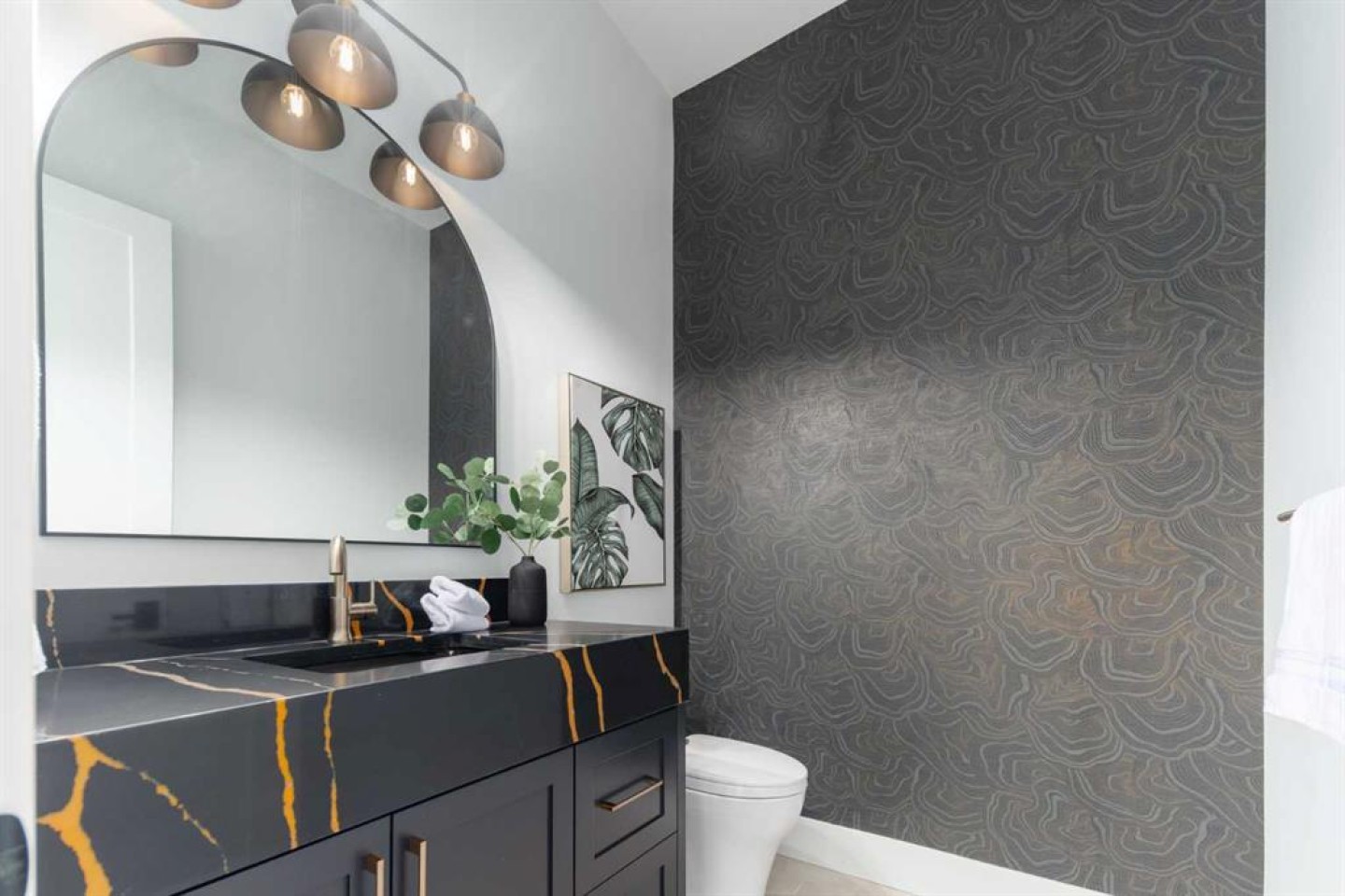 Upstairs, the primary suite is a serene retreat with a boutique-style walk-in closet, spa-inspired ensuite with soaking tub and rainfall shower, and space for private lounging. Three additional bedrooms each feature their own ensuite and walk-in closet, while a flex loft/media space and a fully outfitted laundry room complete the level. The lower level is designed for recreation and relaxation, offering a spacious rec room with wet bar, fitness studio, plush theater room, and two additional bedrooms. Radiant in-floor heating throughout the lower level ensures year-round comfort. Set on a beautifully landscaped 0.28-acre lot, this home includes speaker zones, central vac, gas BBQ hookup, gas garage heater and smart-home rough-ins for modern living. Beyond the property, Watermark is one of Calgary’s most sought-after family communities, renowned for its strong sense of community, scenic pathways, and access to top schools and amenities. With nearby shopping, dining, recreation centers, and a quick drive into the city, it is the perfect balance of tranquility and convenience.