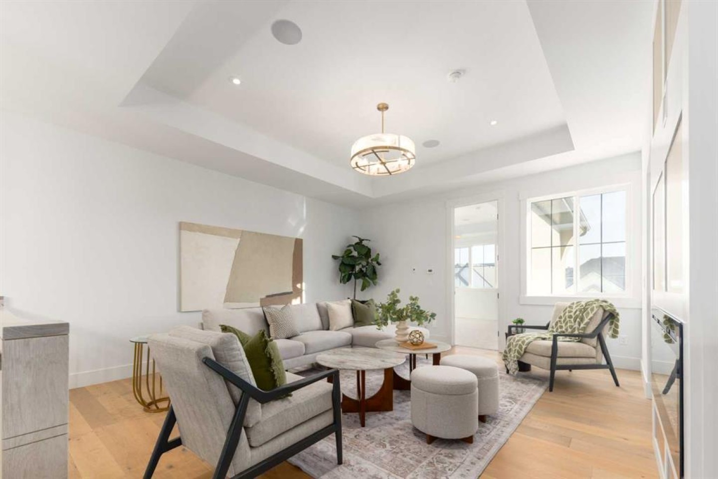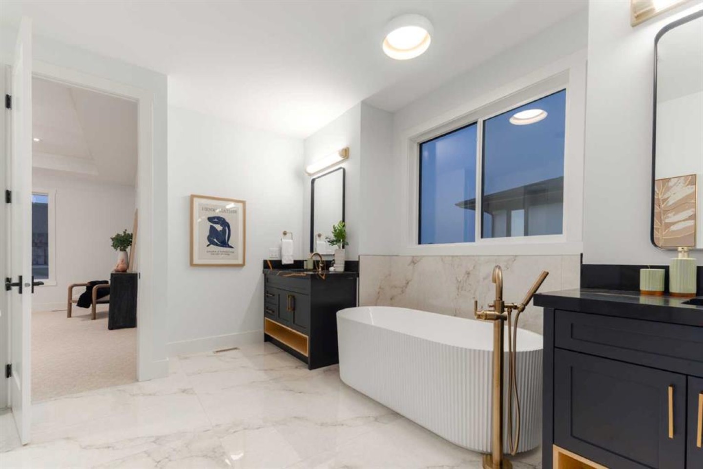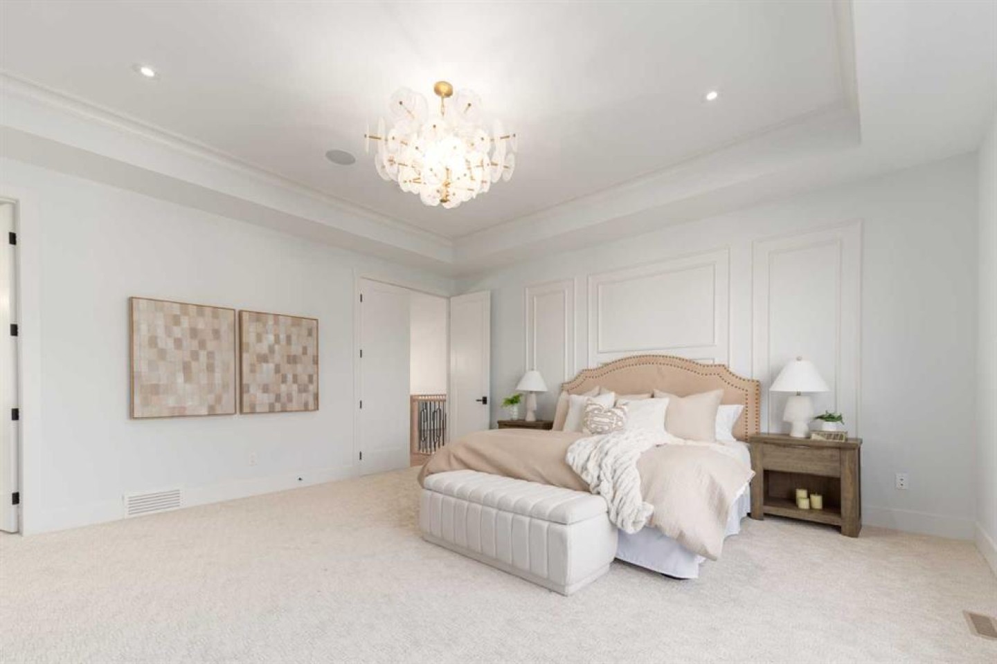 Upstairs, the primary suite is a serene retreat with a boutique-style walk-in closet, spa-inspired ensuite with soaking tub and rainfall shower, and space for private lounging. Three additional bedrooms each feature their own ensuite and walk-in closet, while a flex loft/media space and a fully outfitted laundry room complete the level. The lower level is designed for recreation and relaxation, offering a spacious rec room with wet bar, fitness studio, plush theater room, and two additional bedrooms. Radiant in-floor heating throughout the lower level ensures year-round comfort. Set on a beautifully landscaped 0.28-acre lot, this home includes speaker zones, central vac, gas BBQ hookup, gas garage heater and smart-home rough-ins for modern living. Beyond the property, Watermark is one of Calgary’s most sought-after family communities, renowned for its strong sense of community, scenic pathways, and access to top schools and amenities. With nearby shopping, dining, recreation centers, and a quick drive into the city, it is the perfect balance of tranquility and convenience.