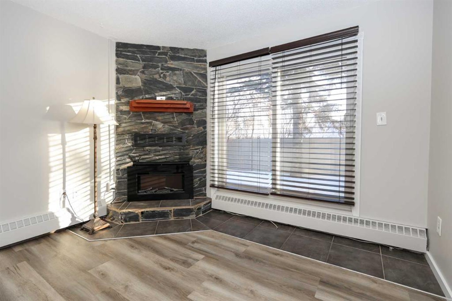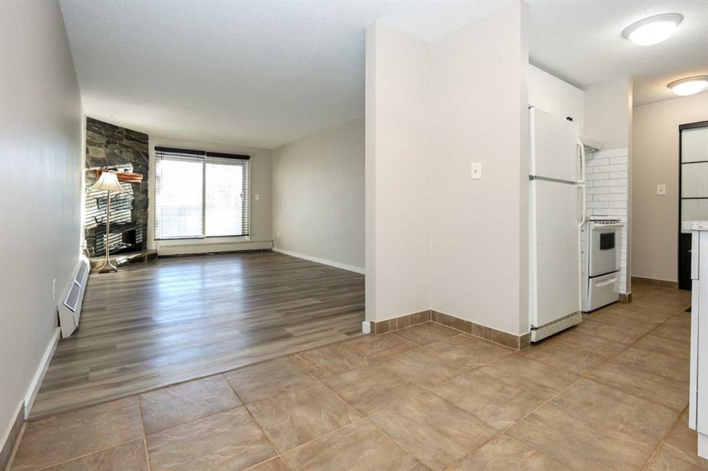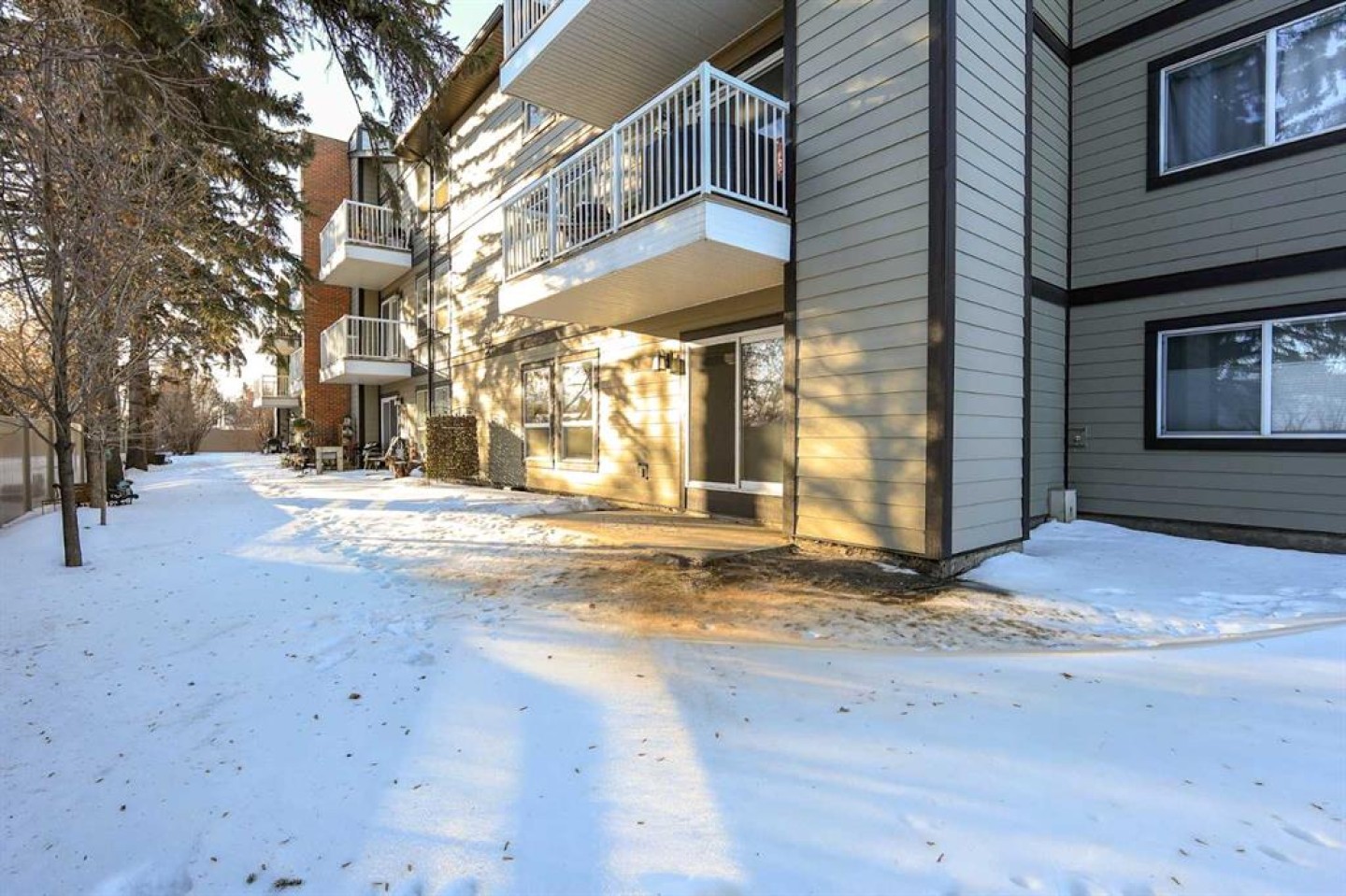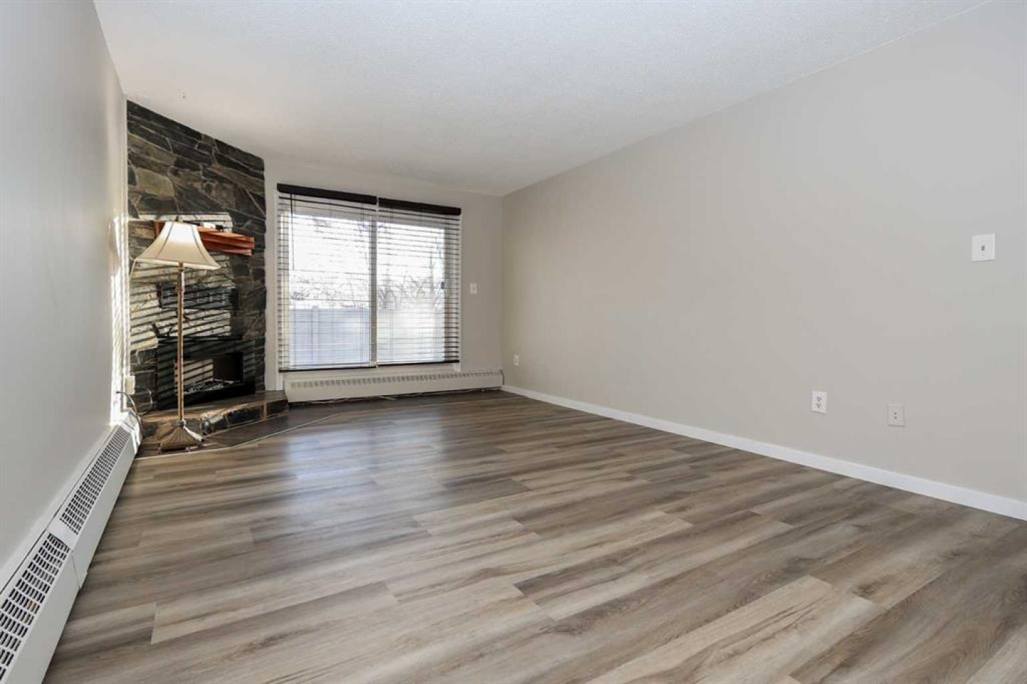 IMMEDIATE POSSESSION AVAILABLE ~ RENOVATED THROUGHOUT & MOVE IN READY ~ 2 BEDROOM, 1 BATHROOM MAIN FLOOR UNIT ~ LOW MAINTENANCE, ADULT LIVING (18+) ~ Recent updates include; new vinyl plank flooring throughout , neutral paint throughout, updated lighting, closet doors, hardware, kitchen cabinets, countertops, and backsplash ~ The living room features a corner fireplace with floor to ceiling stone, a raised hearth, and mantel, plus sliding patio doors to the covered patio ~ Outside the patio has plenty of space for outdoor furniture and overlooks mature trees with no neighbours behind ~ The dining space opens to the galley style kitchen with white shaker style cabinets, textured tile backsplash, granite composite sink with an updated faucet, and ample counter space ~ Two bedrooms are both a generous size and offer plenty of closet space ~ In unit stackable laundry is conveniently located next to the 4 piece bathroom that has tile floors and a soaker tub ~ Monthly condo fees are $492.62/month and include; Common area maintenance, heat, insurance, maintenance grounds, parking, professional management, reserve fund contributions, sewer, snow removal, trash, and water offering a low maintenance lifestyle ~ 1 assigned powered parking stall with ample visitor parking available ~ This well managed, quiet adult condo is located steps to wetlands and walking trails that connect to Red Deer's extensive Mackenzie trail system, with multiple schools, parks, playgrounds, transit and shopping all close by.