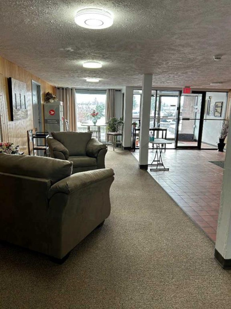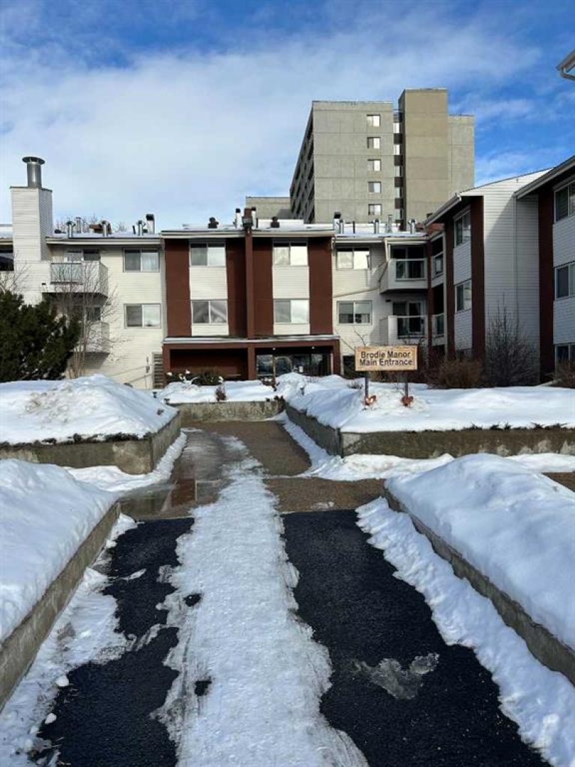 45+ Brodie Manor condominium apartment lifestyle living. Ground floor unit steps away from front doors. . Layout includes kitchen area , dining space, spacious living room, two bedrooms and 3 piece bath. There is a shared laundry just down the hall. You can install your own laundry in the unit with Board approval. Pet allowed but some restrictions. Bus stop out front and Resources Road flows north south just to the east off 92 Avenue which also spills onto main 100th street for north south downtown access. Brodie Manor has additional storage areas to inquire about plus a 3rd floor common area to entertain and a fitness area to enjoy as well. Condominium fees cover assigned parking stall, heat, water, sewer, garbage, snow removal, grounds maintenance, building insurance, and reserve fund contributions.